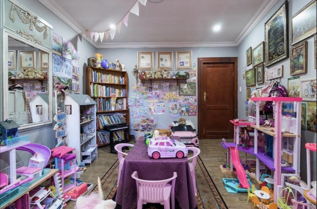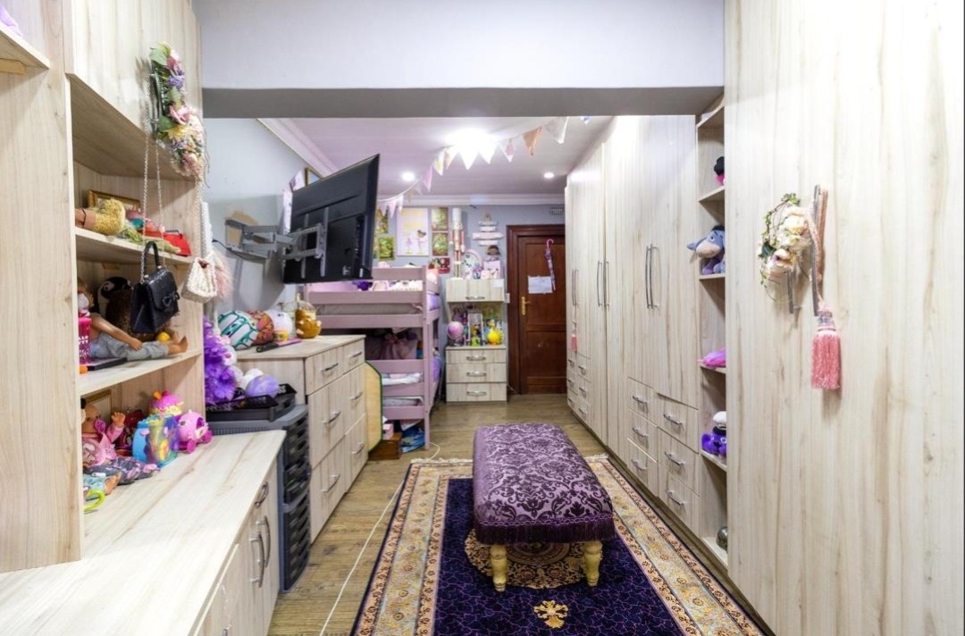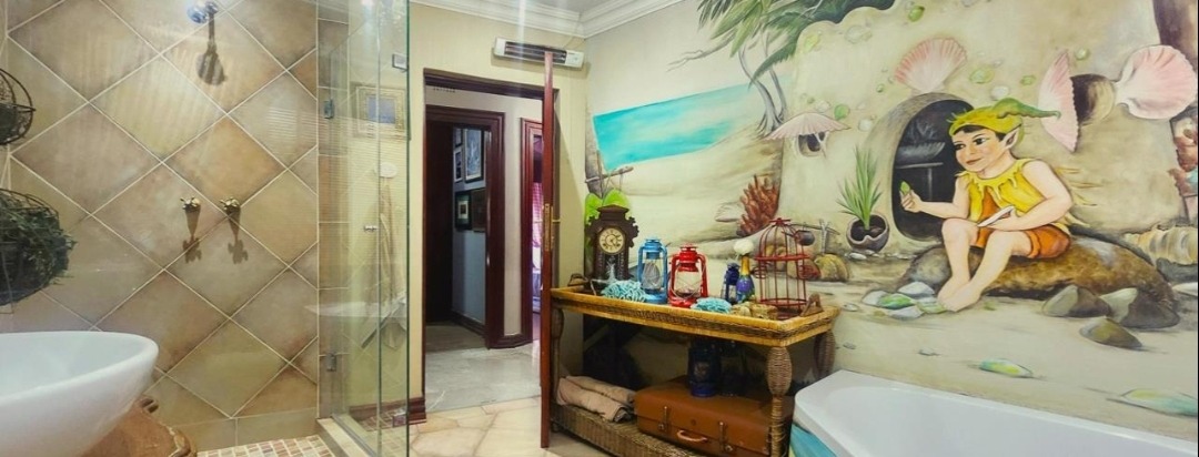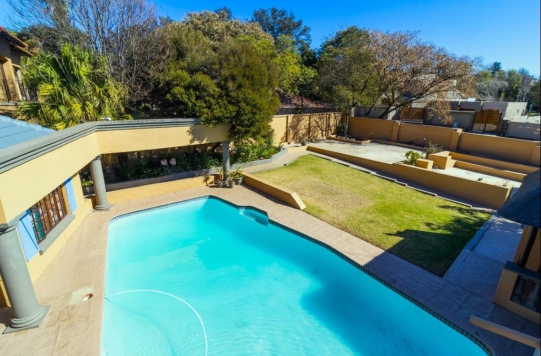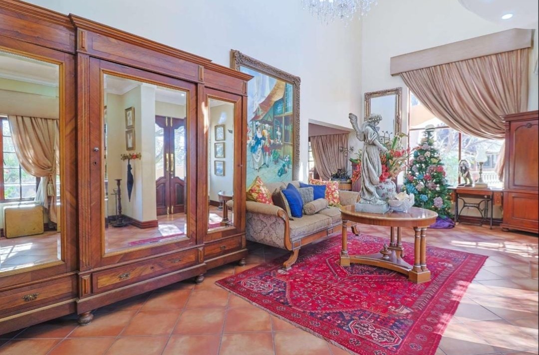 The expansive main suite includes sliding doors to the pool terrace, a lounge area, a study nook, a luxurious walk-in closet, and a unique en-suite bathroom featuring a historic bath from the original Gold Reef City Hotel. A versatile adjoining room with a gas fireplace opens onto a large covered patio with a built-in braai—perfect as a private dining room, library, nursery, or second study.