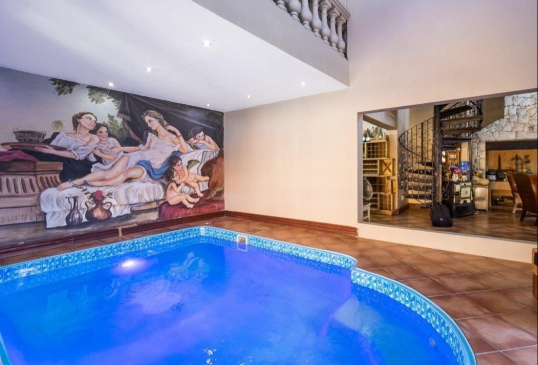 Enjoy endless lifestyle options: six private patios, an indoor pool for year-round leisure, and a cosy wine cellar overlooking the indoor fireplace—ideal for unforgettable evenings. Two bedrooms and the men’s dressing room feature beautiful bay windows with serene pool views, adding light and warmth.