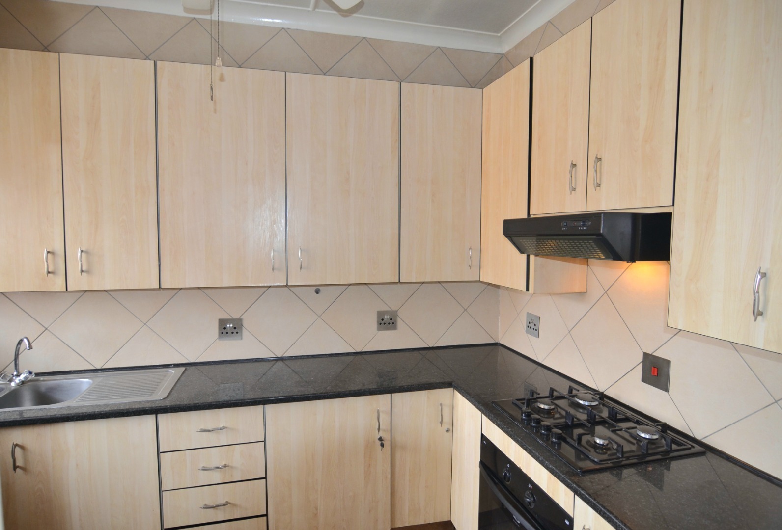 The modern kitchen is beautifully finished with granite countertops, ample cupboard space, and a gas stove, making meal preparation both stylish and practical.