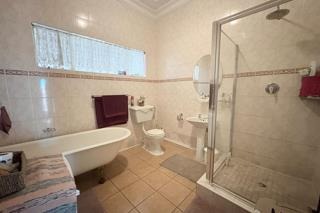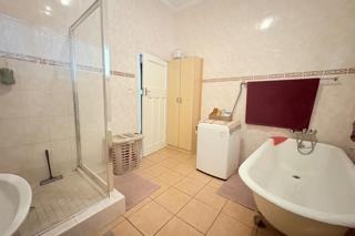 - Full bathroom with freestanding bath, large corner shower, toilet, and basin