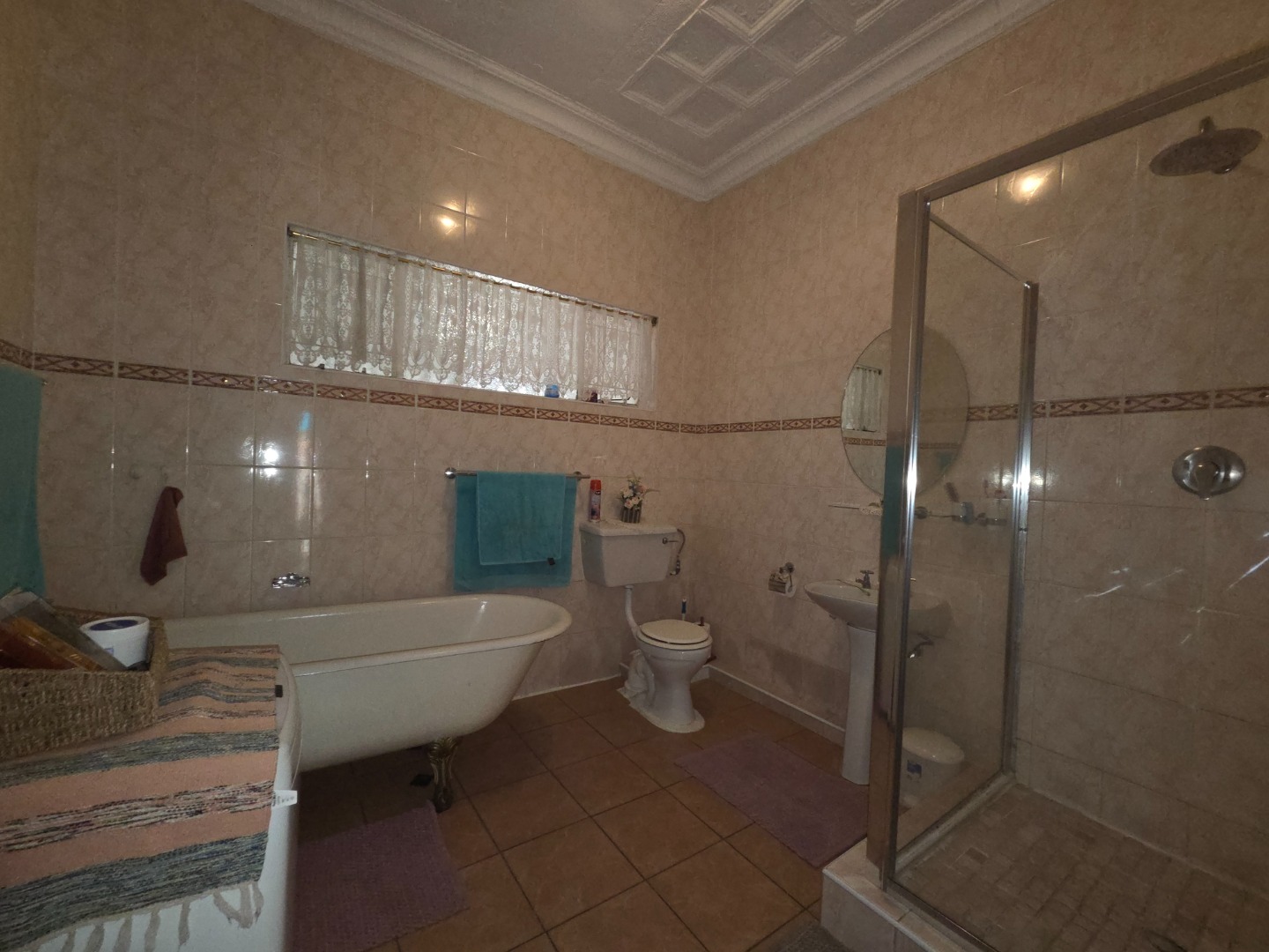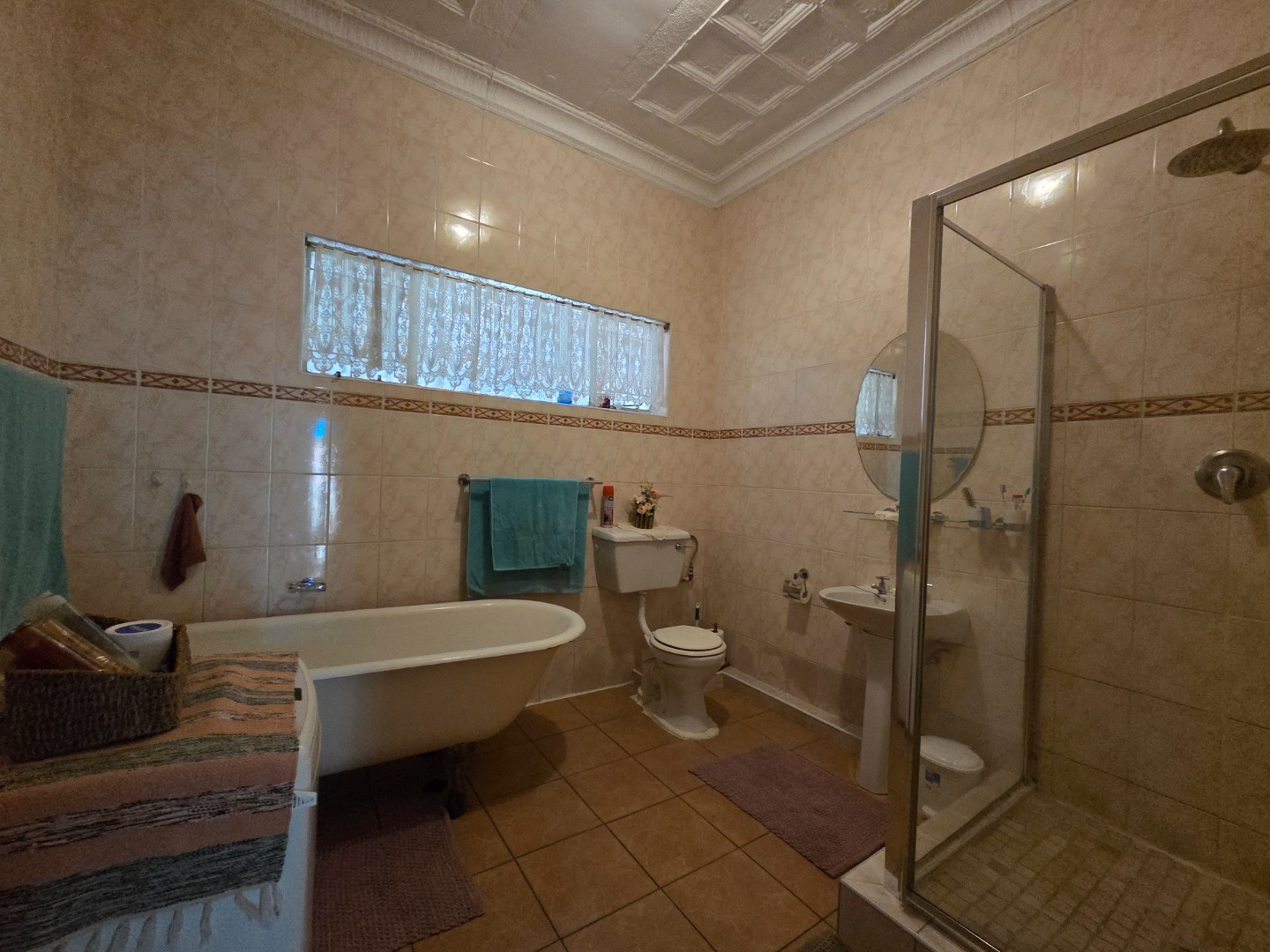 The full bathroom features a freestanding bath, large corner shower, toilet, and basin—both practical and inviting.