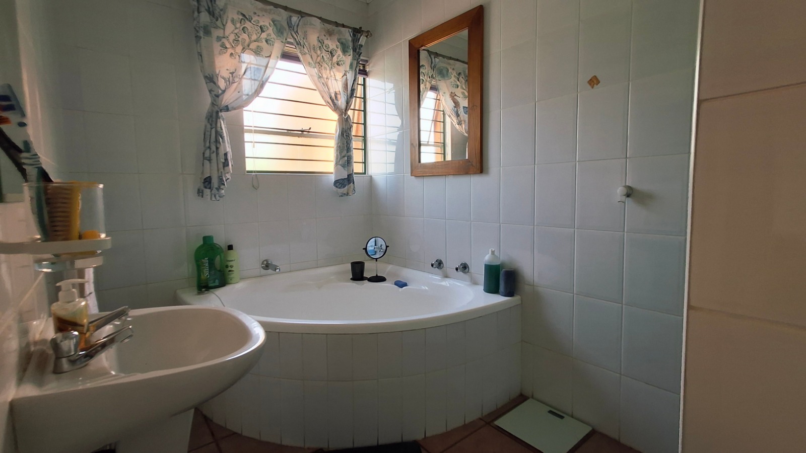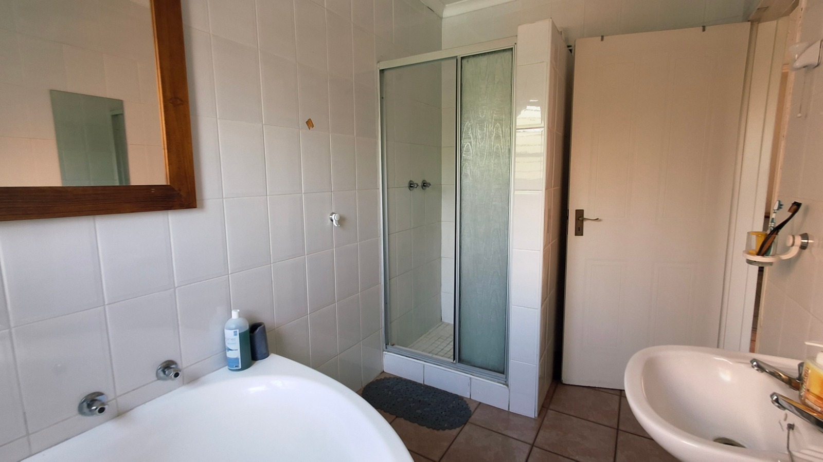 The home comprises three generously sized bedrooms, all with built-in cupboards and tiled finishes. The main bedroom includes a private en-suite bathroom, while the second bathroom is fitted with both a bath and shower, along with a separate toilet for added practicality.