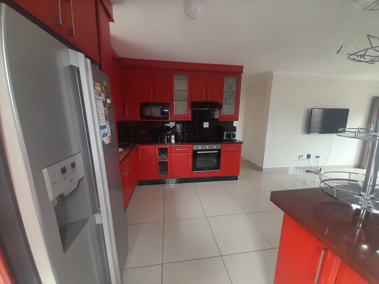 Step inside to discover an inviting open-plan living and kitchen area, designed for contemporary comfort. The space boasts sleek tiled flooring throughout, complemented by a striking modern kitchen. This culinary hub features vibrant red cabinetry, a stylish black tiled accent wall, and a prominent red kitchen island/bar, equipped with modern appliances including a built-in oven and hob. The adjacent lounge area provides a comfortable space for relaxation and entertainment, serving as a dedicated family/TV room.