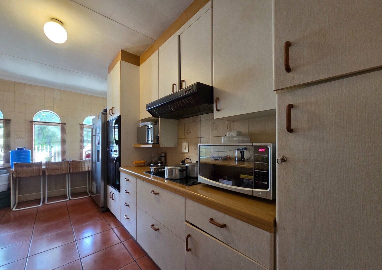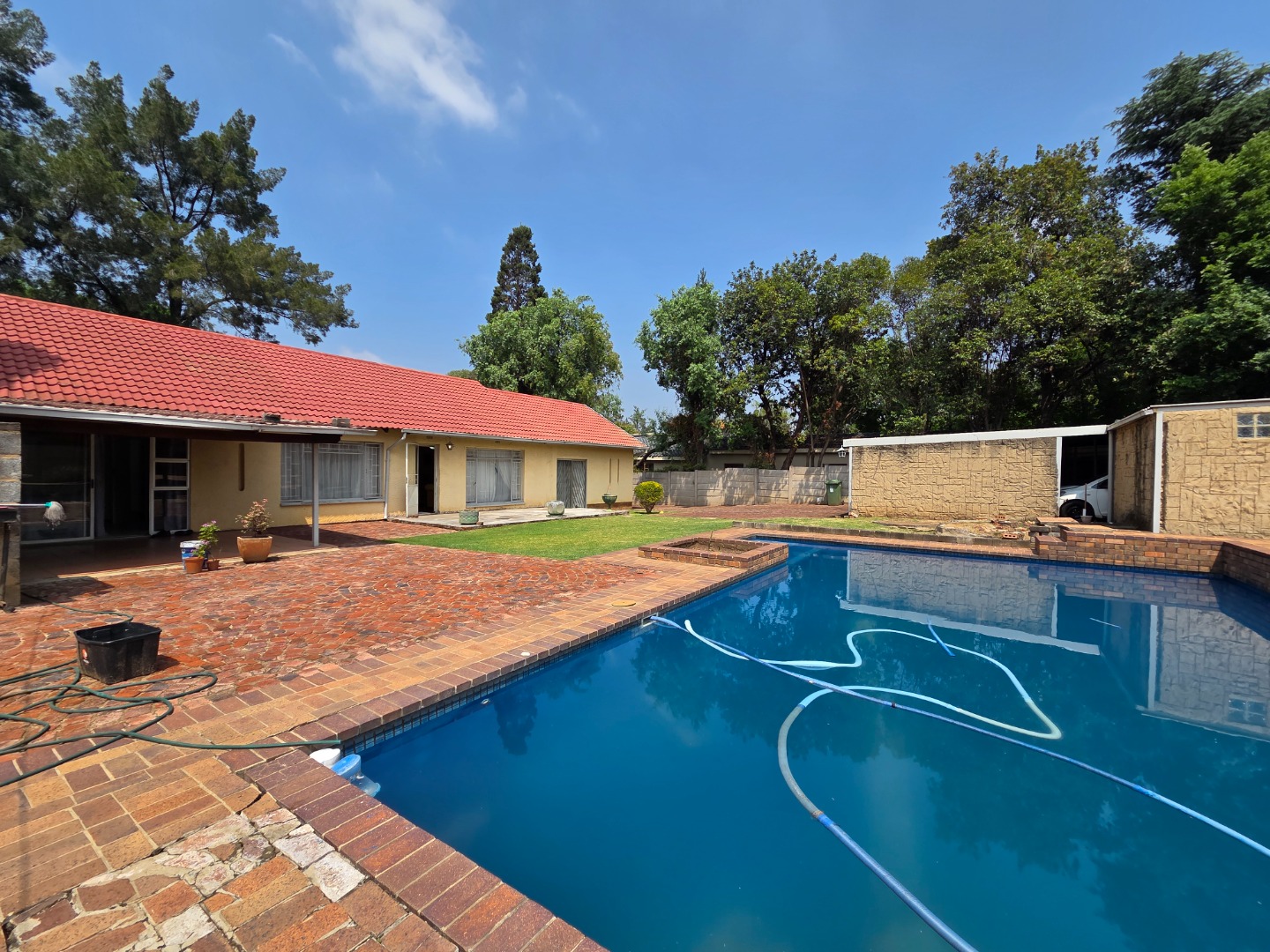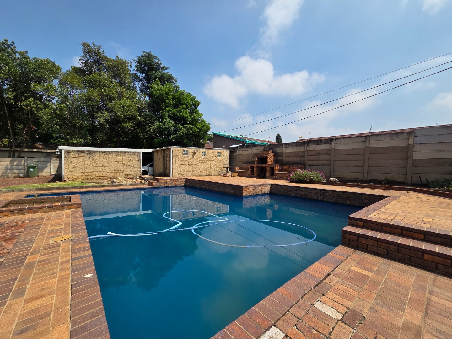 Security is a top priority with features including an alarm system, burglar bars, electric gate, and full boundary walls. The home also offers double tandem garages and is situated in a safe, quiet neighborhood.