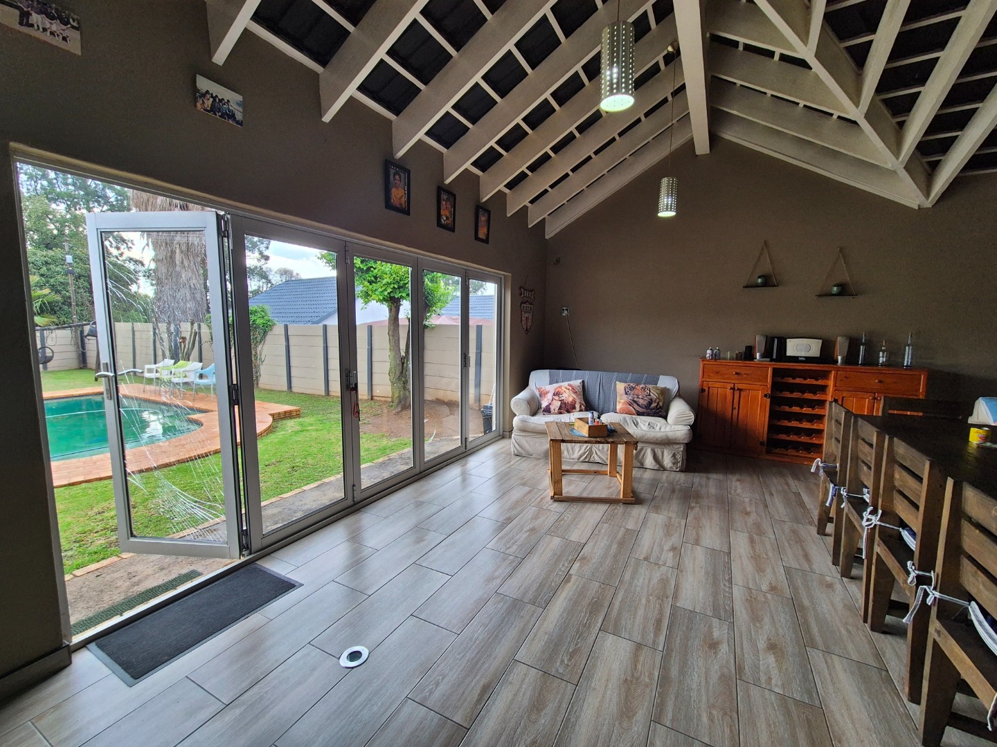 Enjoy the generous lounge and dining room, leading to a huge entertainment area featuring a built-in braai and stacking doors that open out to the sparkling swimming pool — perfect for hosting family and friends all year round.