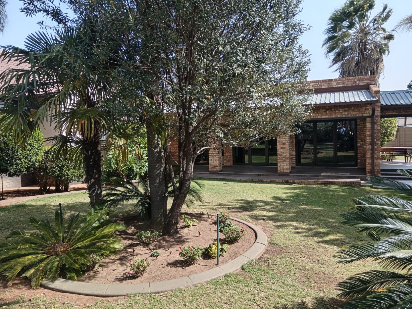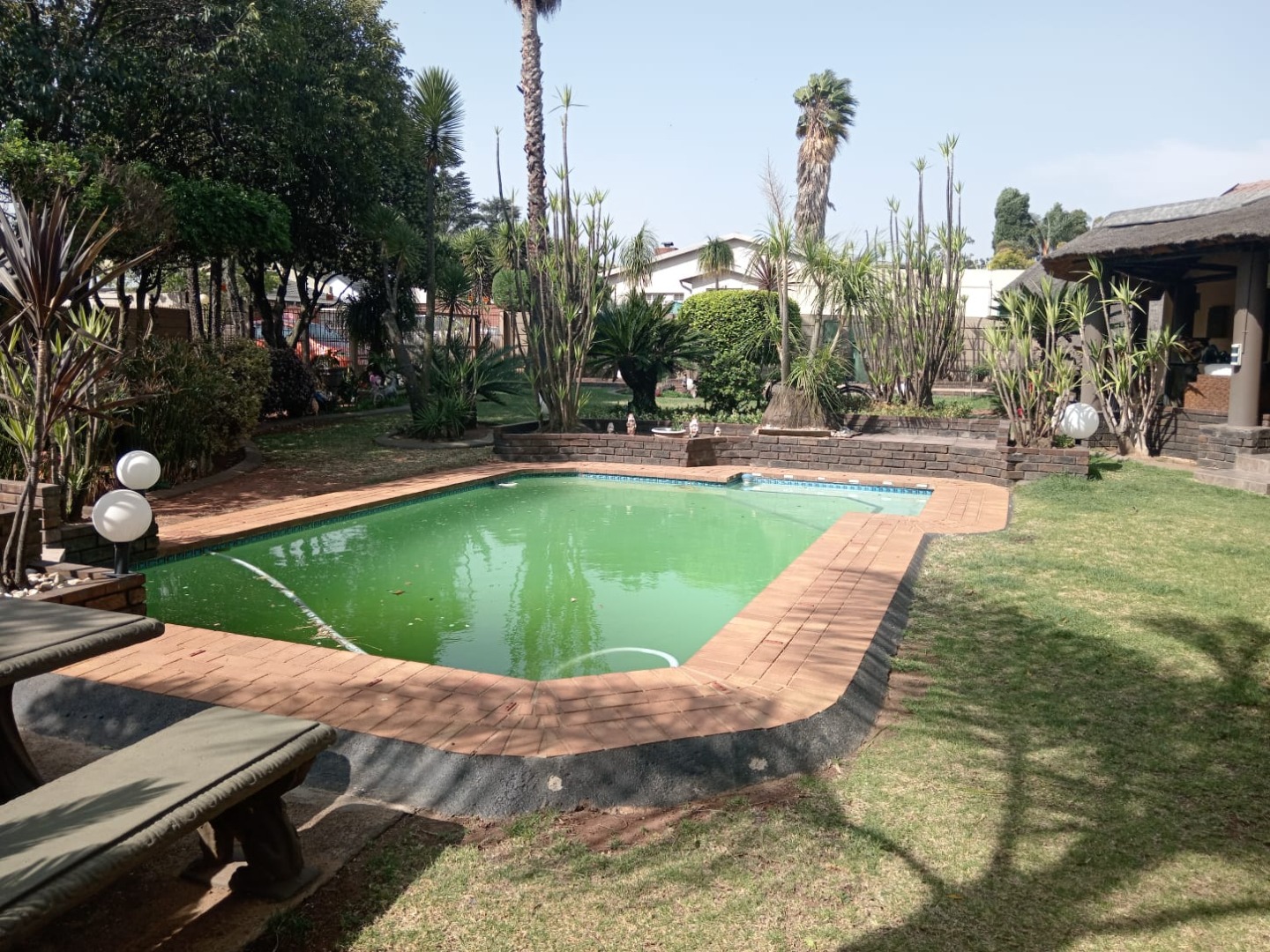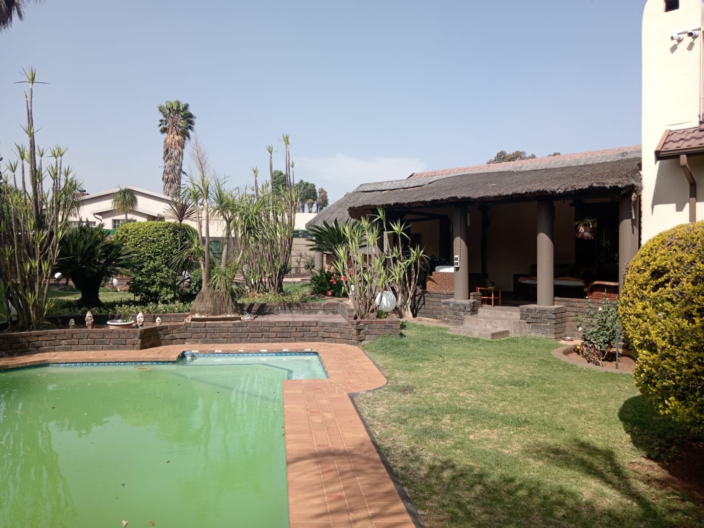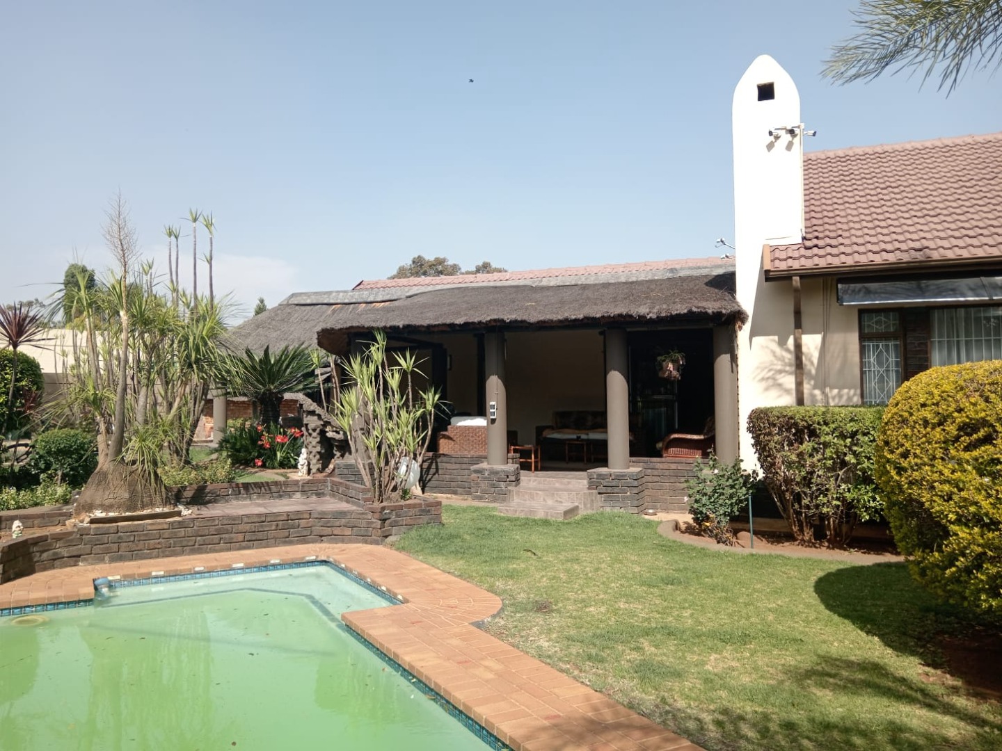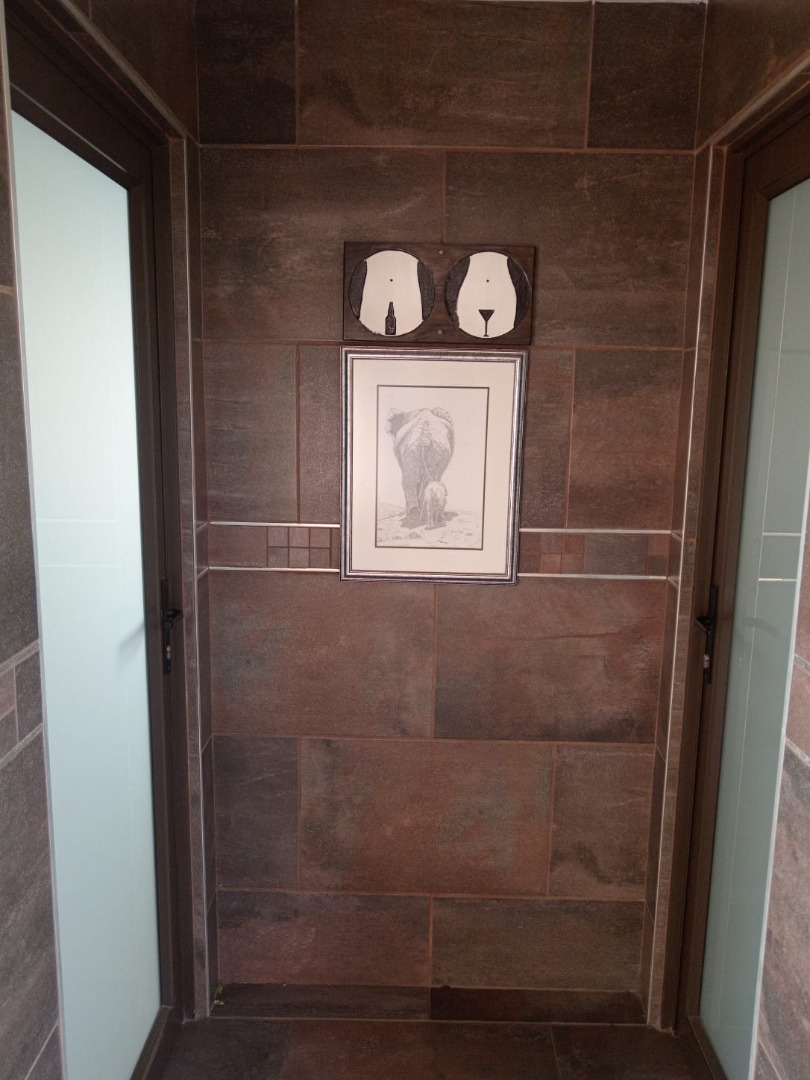 The outside offers a beautifully landscaped garden featuring a thatched covered patio with a built-in braai—perfect for al fresco dining. Dive into the sparkling pool or unwind in the expansive entertainment area, complete with a 12-seater bar that promises endless fun and a gas spit braai to provide meals whiles you are at it. Additional amenities include his and hers outdoor toilets, another charming thatch area with a bar counter, as well as a flat-let and storeroom for extra versatility, rainwater catchment system to maintain the stunning garden. Parking will never be an issue with the tandem covered carport offering ample parking space for your guests