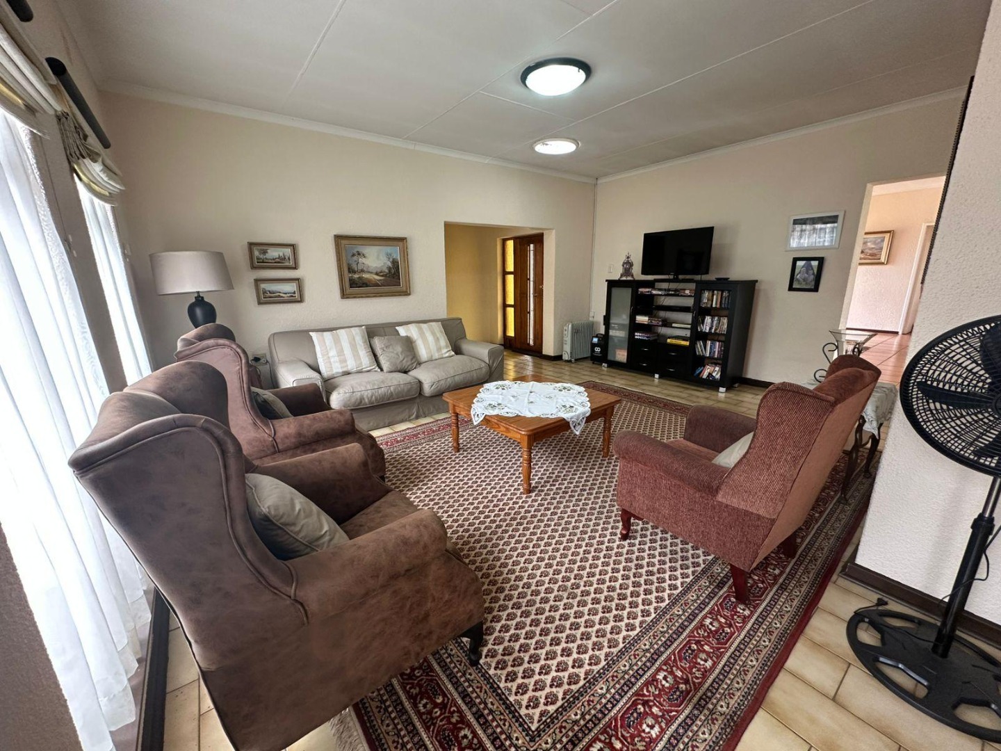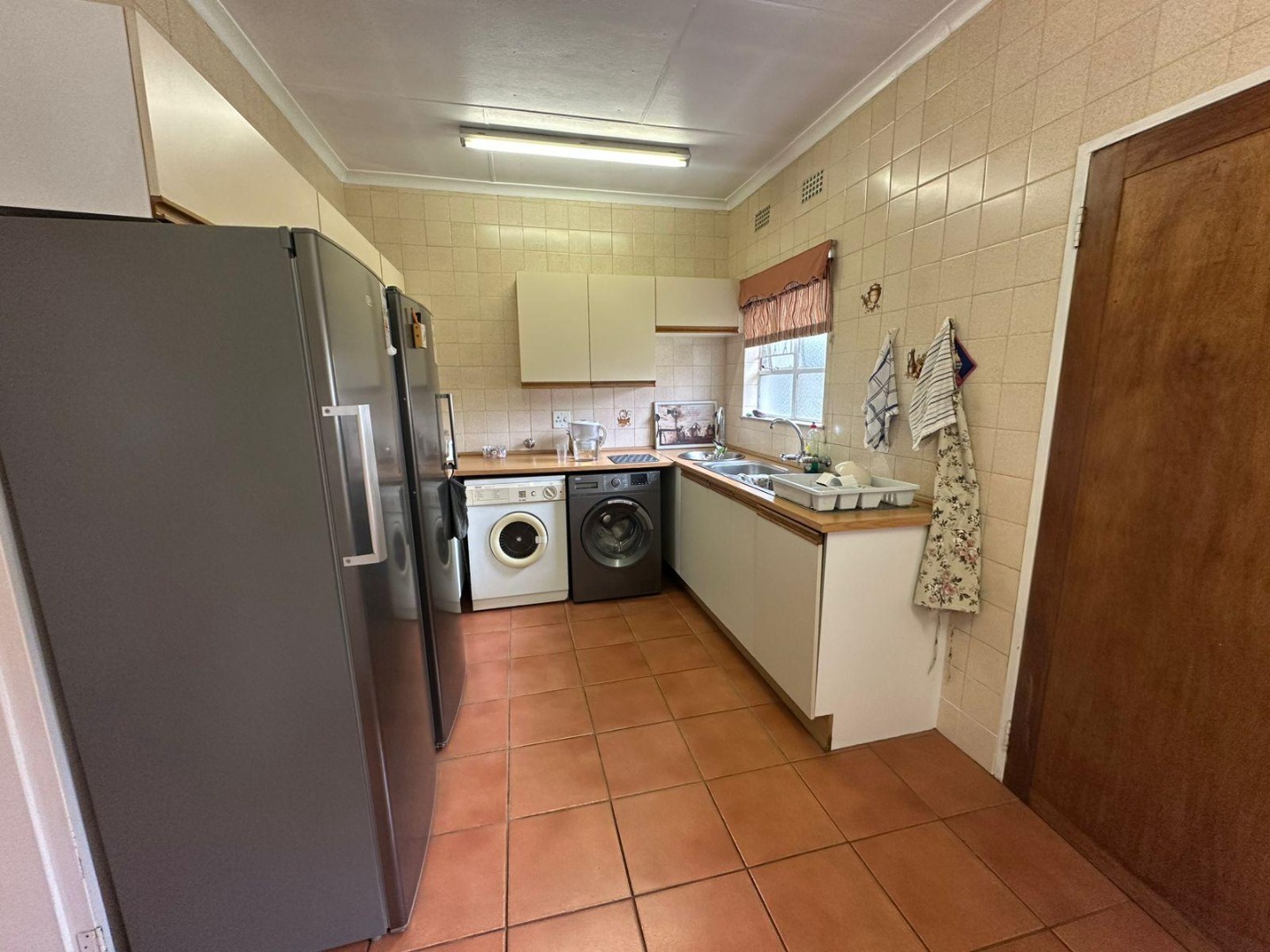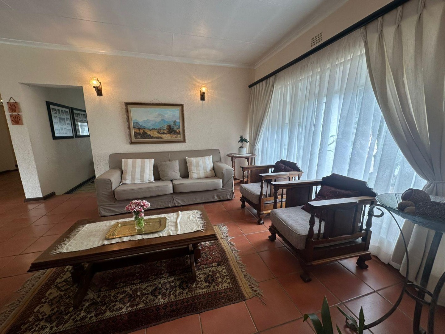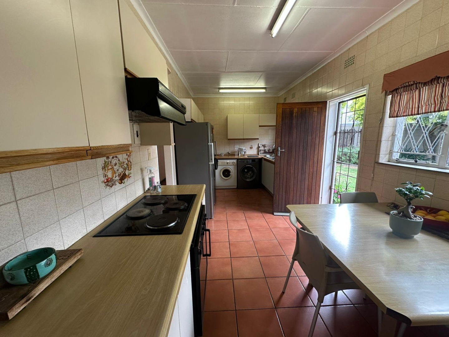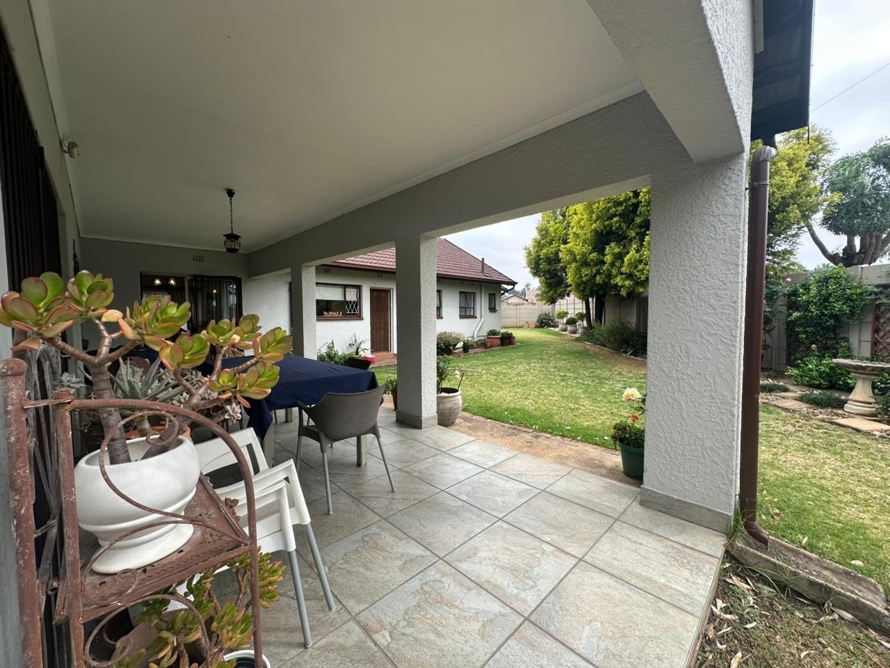 At the heart of the home lies the open-plan dining area and formal lounge, creating a warm and inviting atmosphere. The well-appointed kitchen is a chef’s delight, offering ample cabinetry, space for a double-door fridge, and room for two additional appliances.