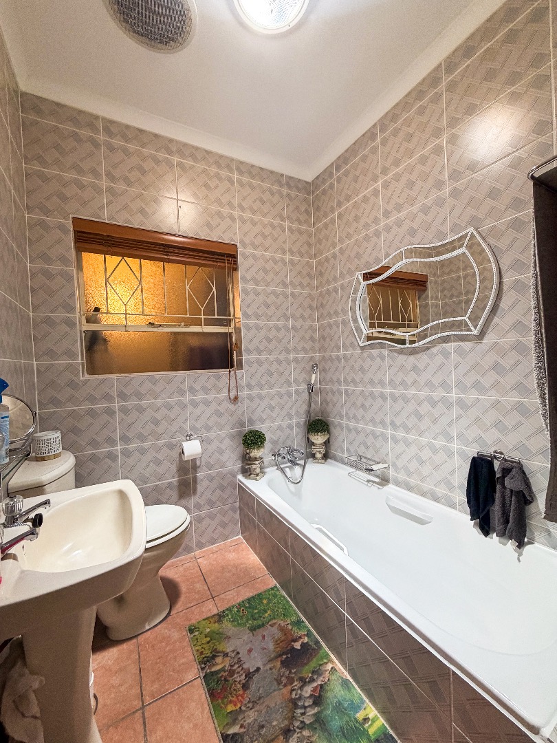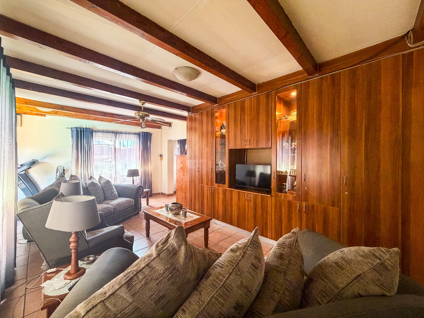 A separate scullery features generous built-in cupboards, space for a double-door fridge and three appliances, a freestanding gas stove with extractor fan, and a convenient walk-in pantry cupboard. An enclosed courtyard/laundry area adds further practicality.