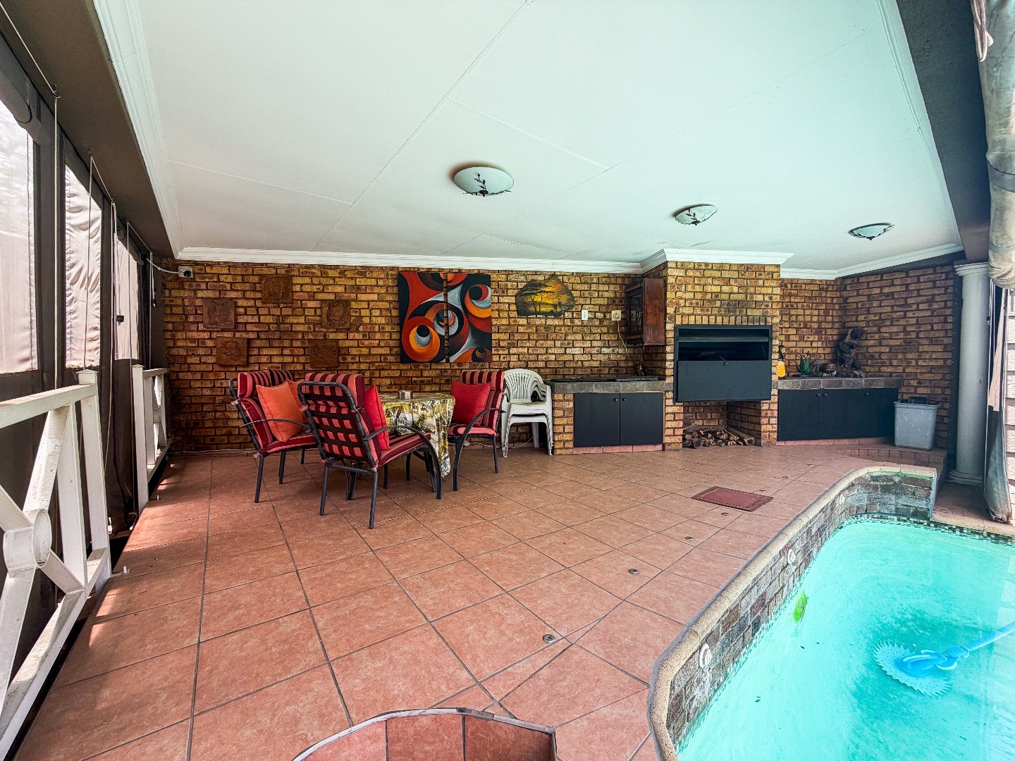 Entertainment area with built-in braai and cabinetry overlooking a sparkling swimming pool