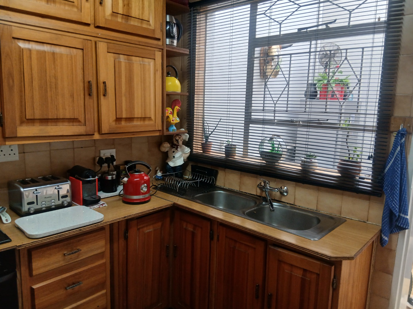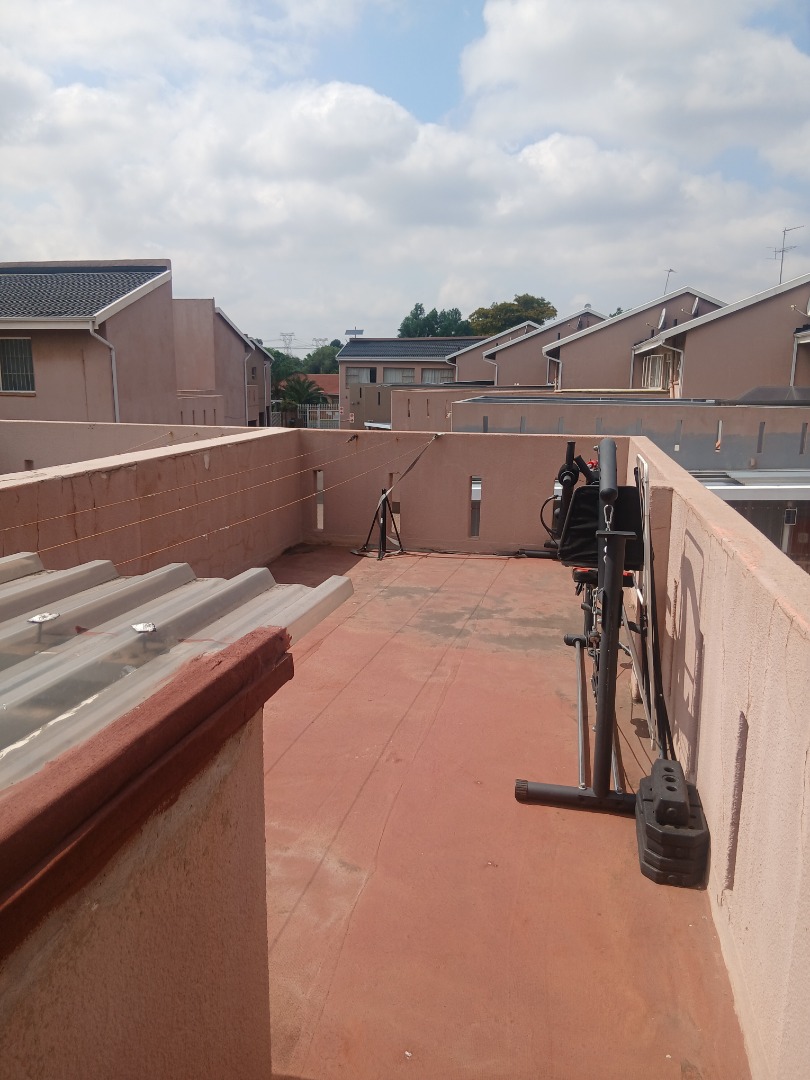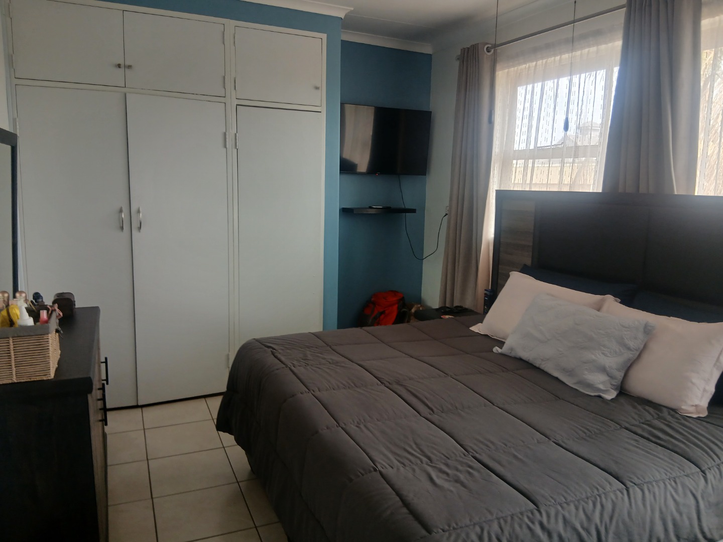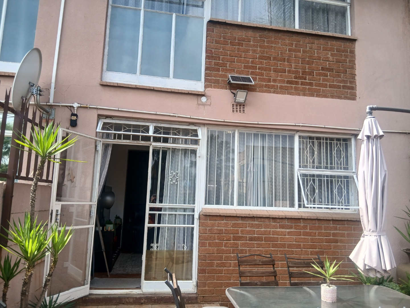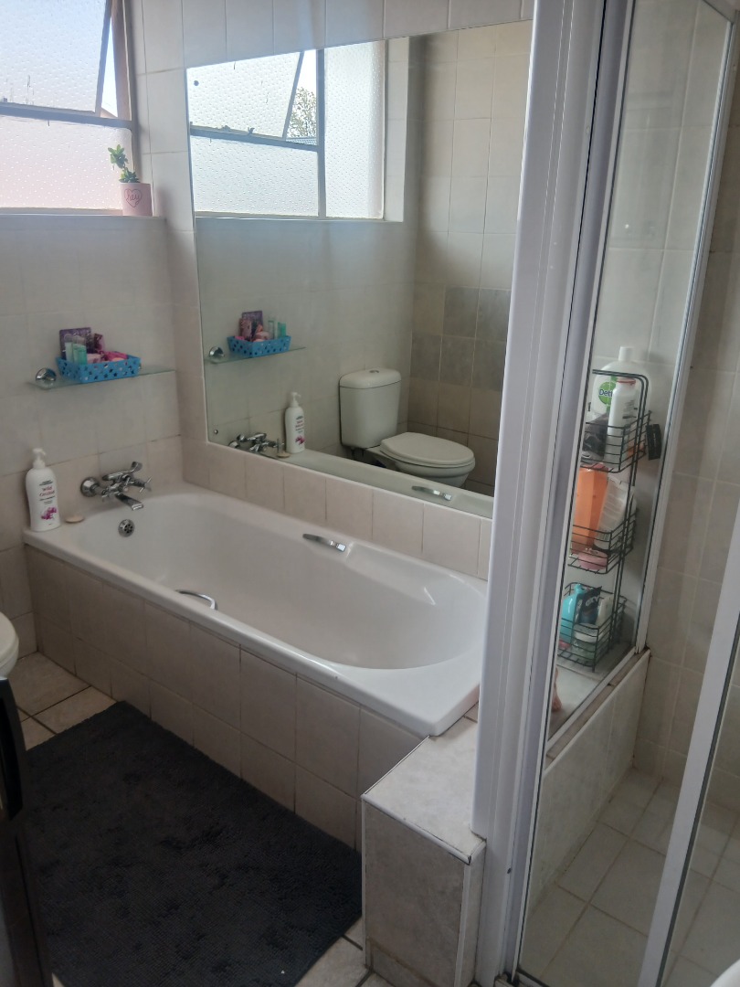 Single garage with direct access, modern kitchen fitted with beautiful wood cupboards, separate laundry area suitable for all major appliances, guest toilet downstairs for convenience, spacious main bedroom – tiled with ample built-in cupboards, second bedroom – tiled with built-in cupboards, bathroom with bath, shower, basin and toilet, enclosed stoep with big balcony. Private well maintained garden with paving, enough space for a garden set, pet friendly.