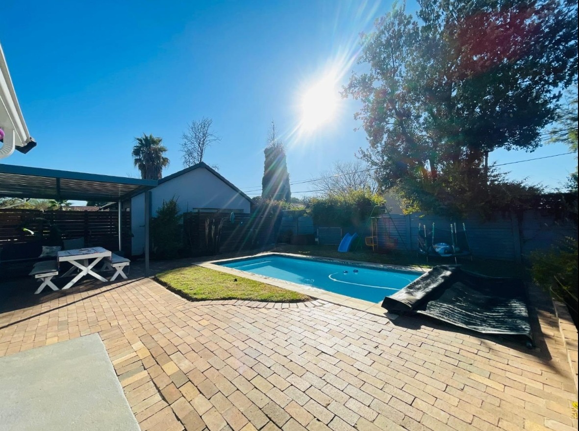 The outdoor area is a true highlight, designed for relaxation and entertainment. A private swimming pool provides a refreshing escape, complemented by a spacious brick-paved patio and a covered outdoor seating area, ideal for al fresco dining and gatherings. The property also benefits from a versatile flatlet, offering potential for guest accommodation, a home office, or rental income. A dedicated children's play area, complete with a slide, swing set, and trampoline, adds to the family-friendly appeal.