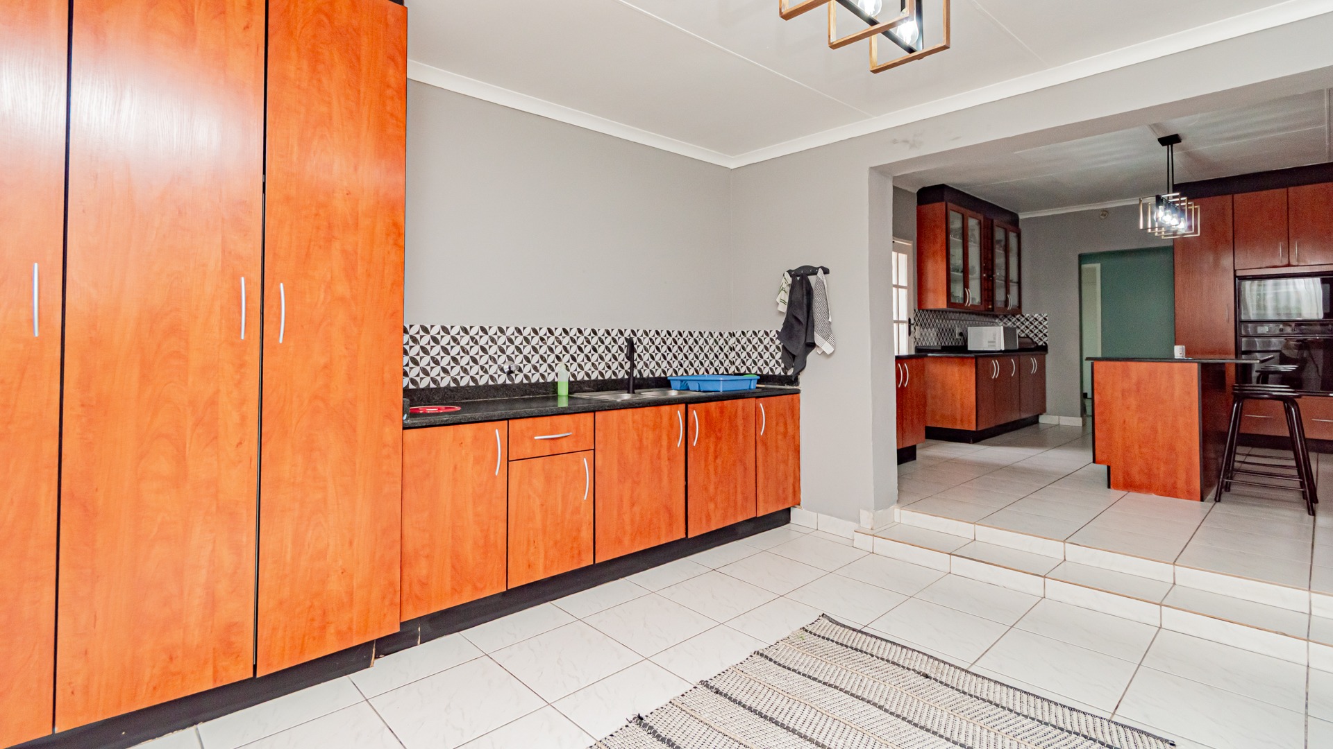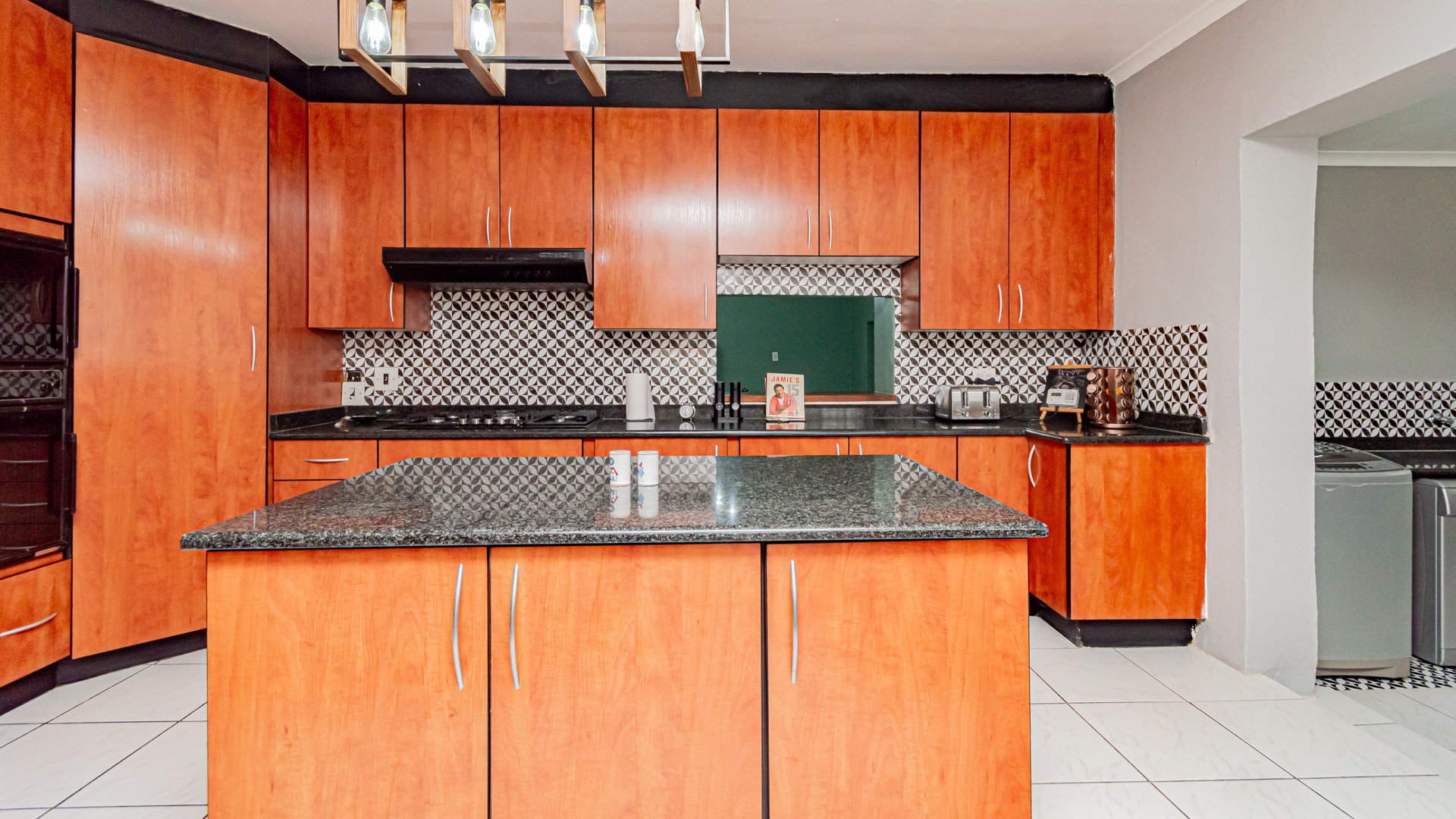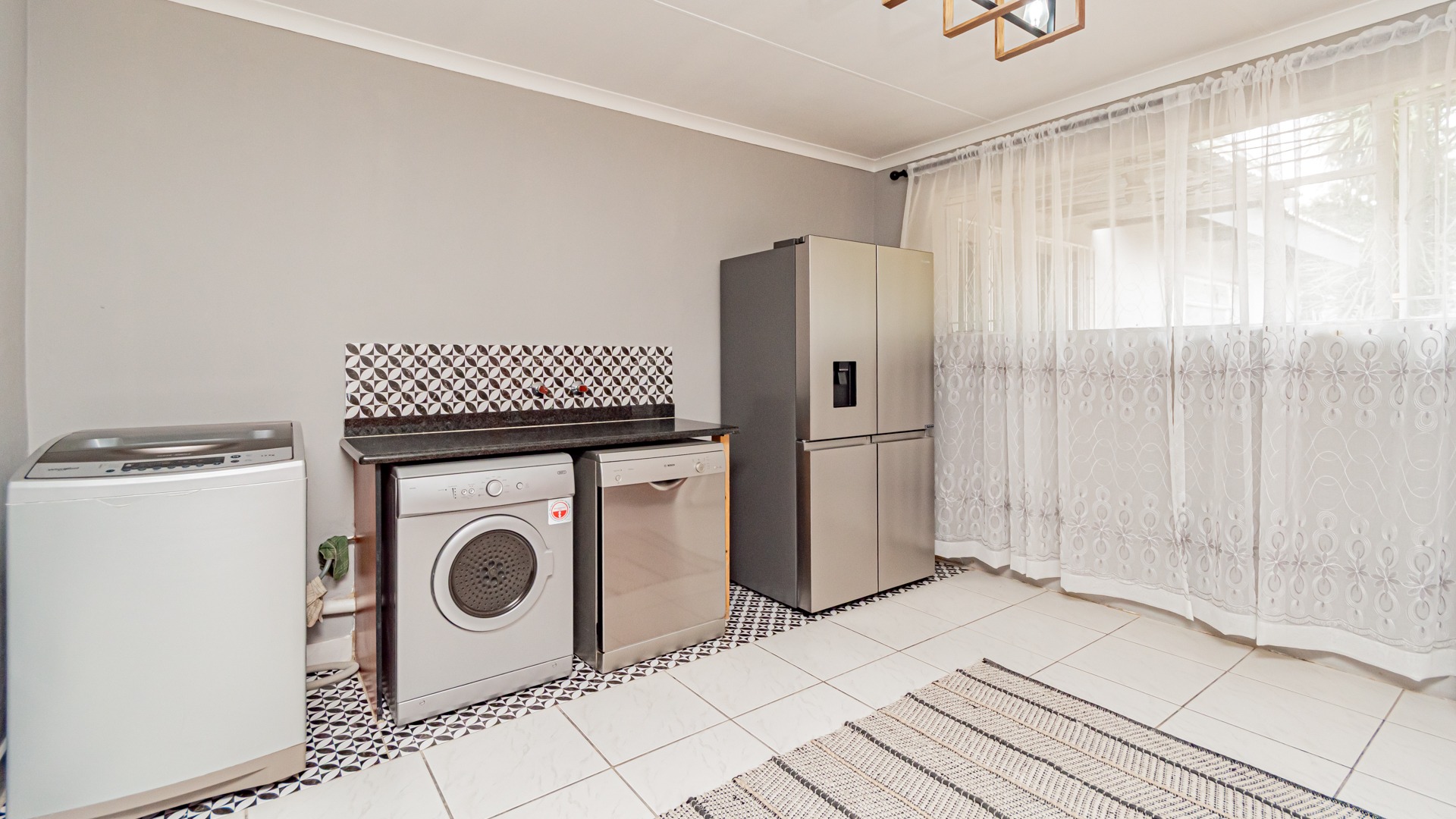 Step further inside and experience a home where warmth meets refined functionality. The contemporary kitchen is both stylish and highly practical, featuring sleek granite countertops, rich rosewood cabinetry, a 6-plate gas hob, double electric oven, a pantry, and ample cupboard space. There is provision for two under-counter appliances in the laundry and more appliances in the laundry area which enhances convenience and organisation.