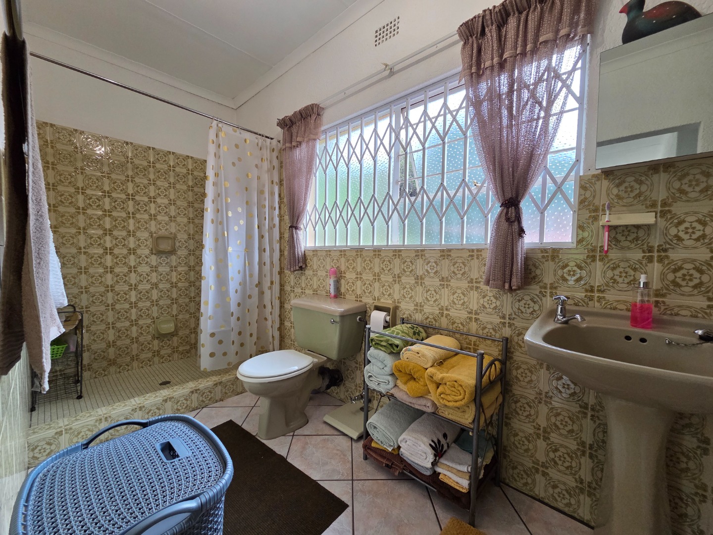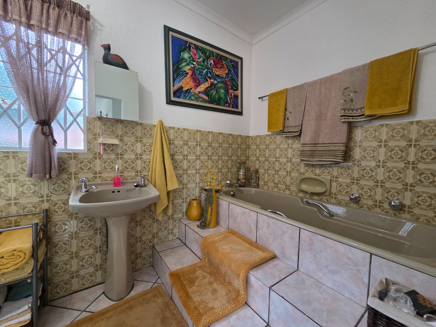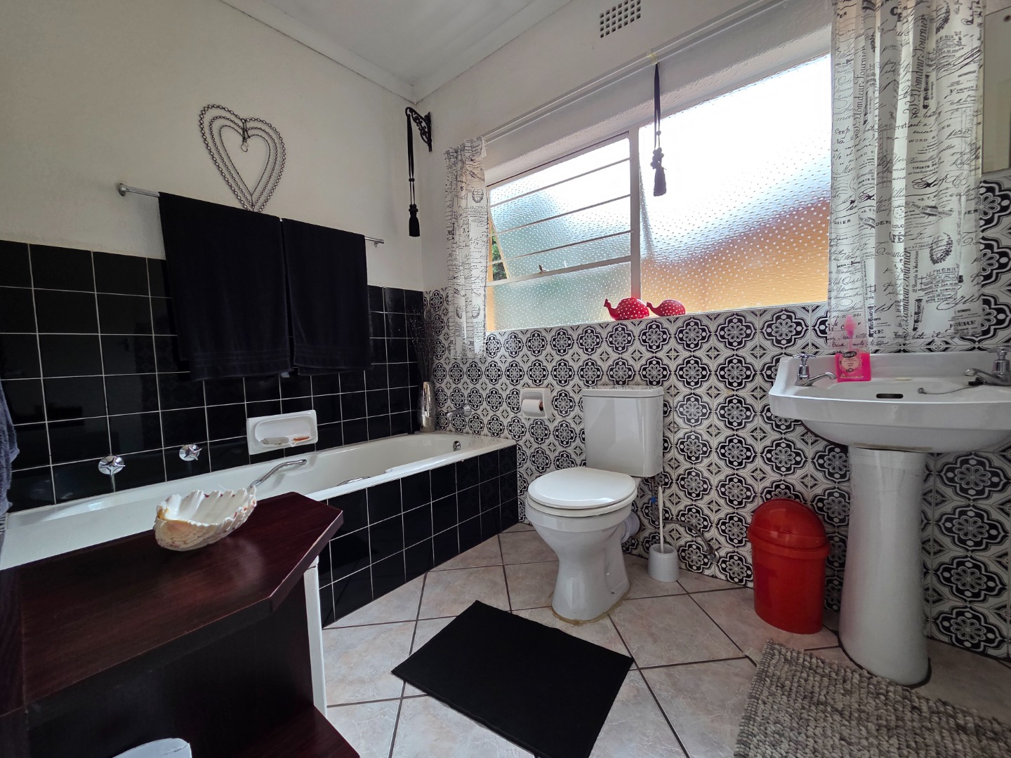 The home offers three comfortable bedrooms, all fitted with built-in cupboards. The main bedroom enjoys the privacy of an en-suite bathroom, while the second bathroom services the rest of the home. One bathroom features a distinctive black-and-white tiled design, adding a touch of character.