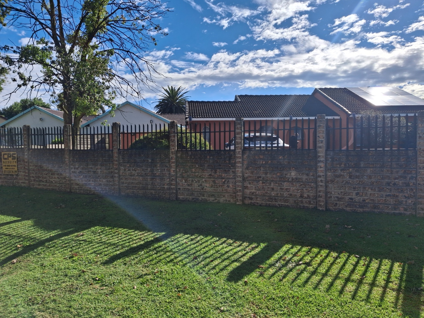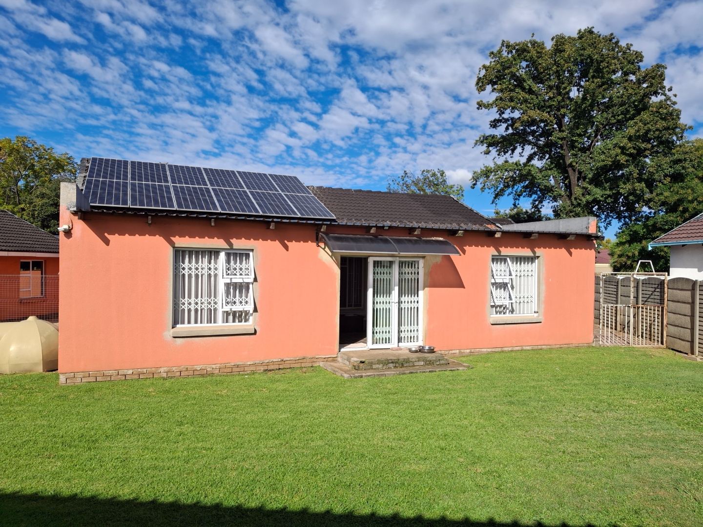 Outside, the property boasts a well-maintained garden and paved areas, alongside two convenient off-street parking spaces. Modern amenities include installed solar panels, contributing to energy efficiency, and fibre internet connectivity for seamless digital access. Security is well-addressed with electric fencing, a fully walled perimeter, and burglar bars, providing peace of mind. Additional practical features include domestic rooms with outside toilets, and the property is wheelchair friendly, ensuring accessibility. Pets are also welcome, making this a truly inclusive family environment.