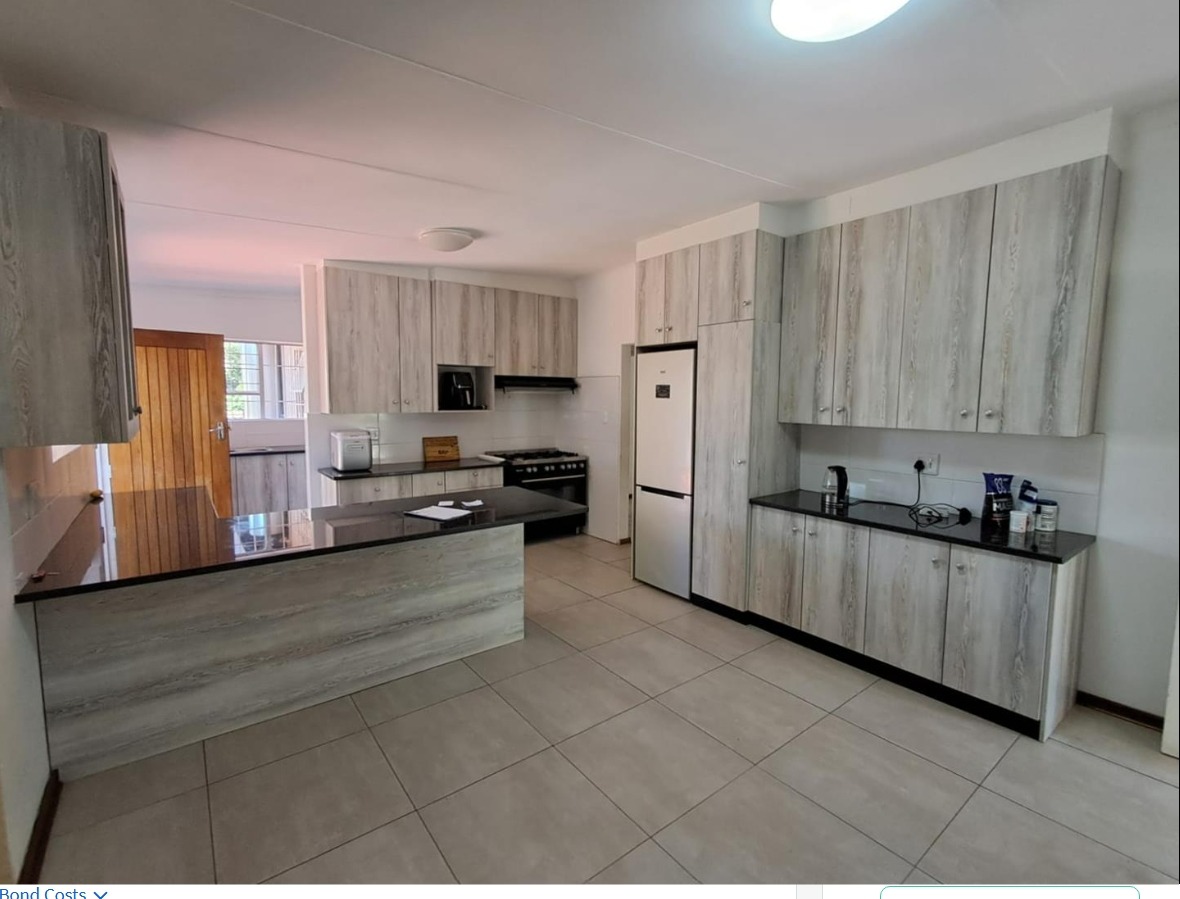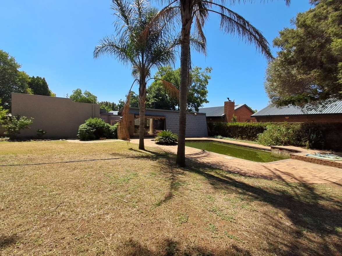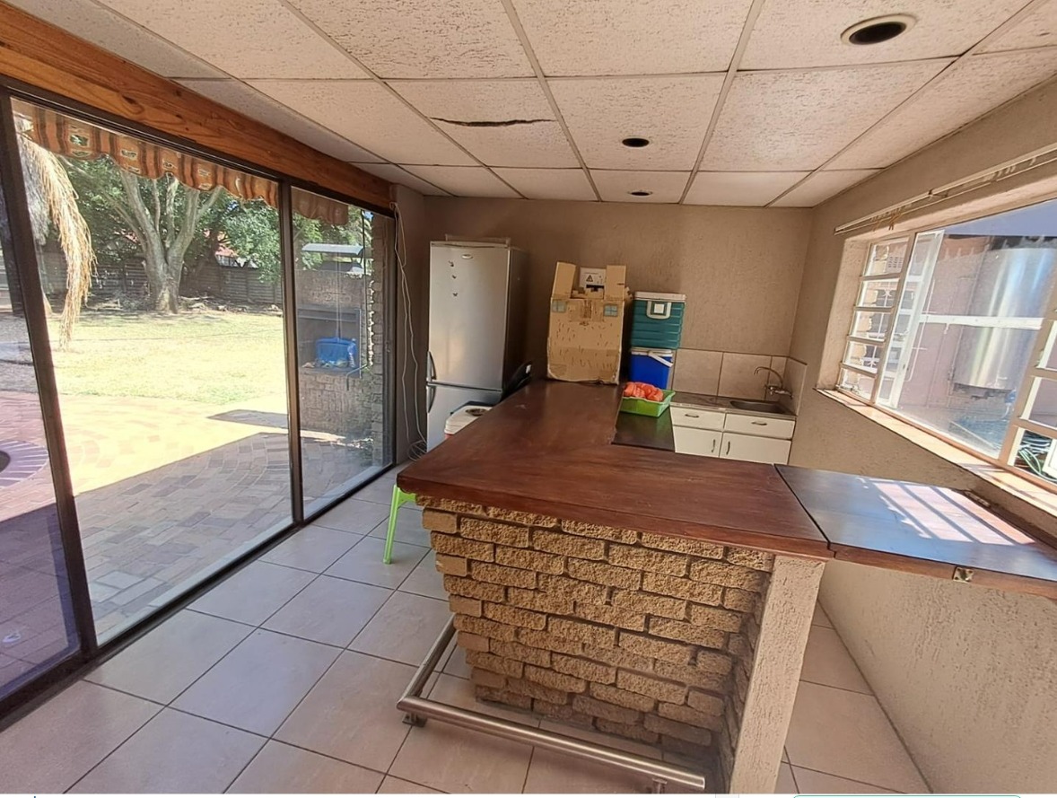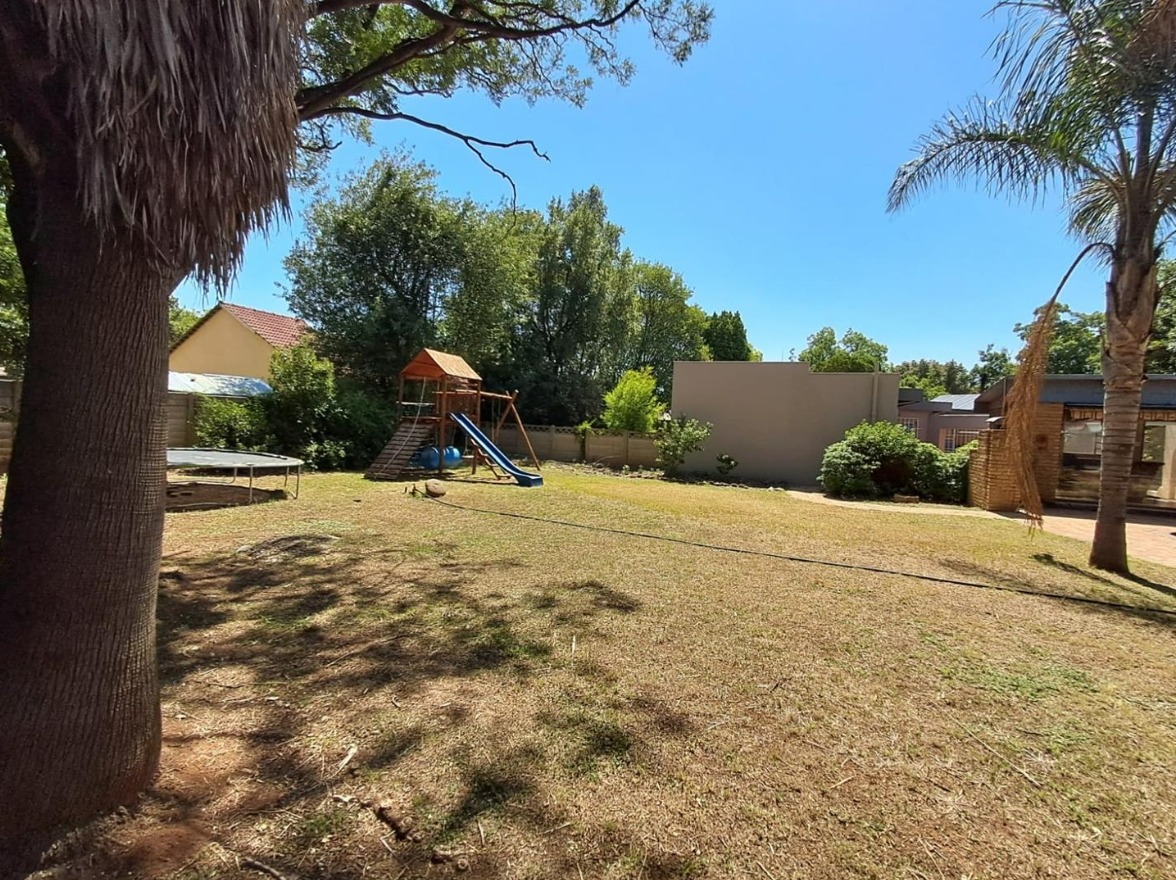 Designed for entertaining, the home boasts an enclosed entertainment area complete with a built-in brick bar and a functional kitchenette, perfect for hosting gatherings. Large sliding doors seamlessly connect this space to the expansive outdoor areas. Here, you'll find a swimming pool, a built-in braai area, and extensive brick paving, all set within a garden that, while currently awaiting revival, holds immense potential for transformation into a vibrant family oasis. Mature trees provide natural shade, and a children's playground area adds to the family-friendly appeal.