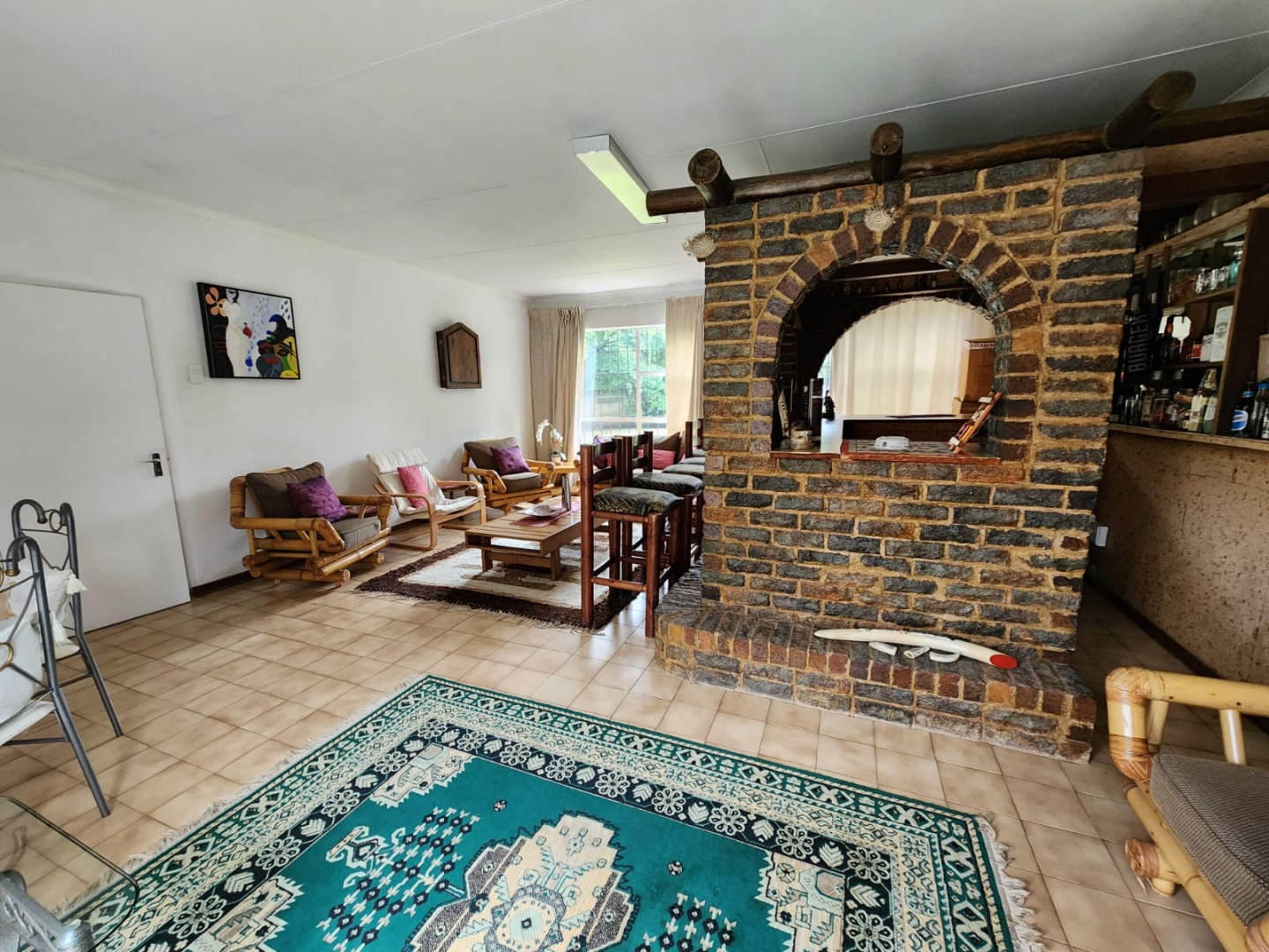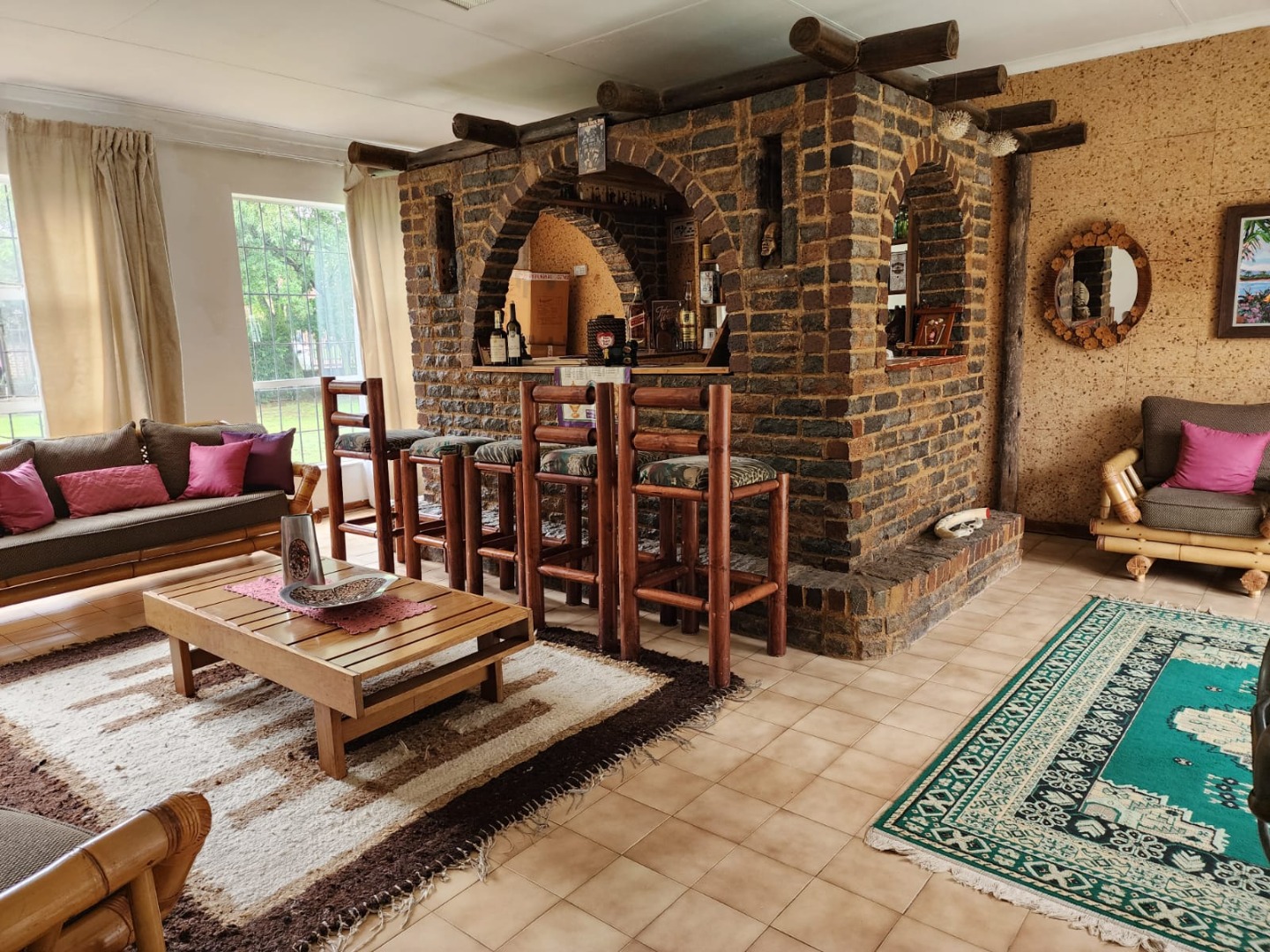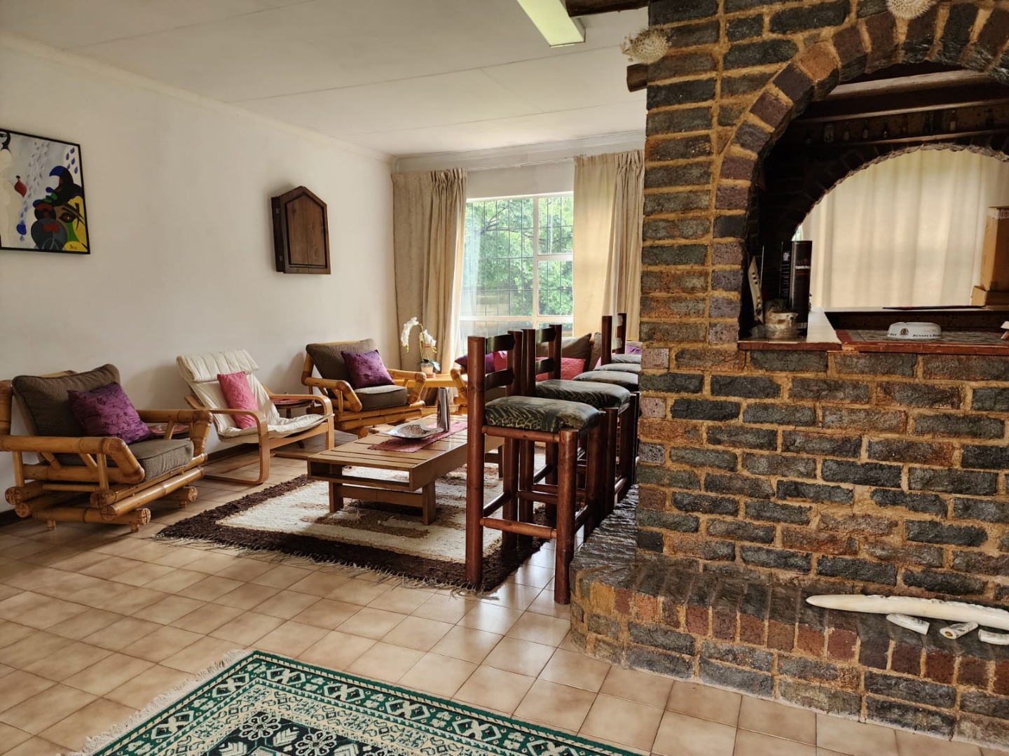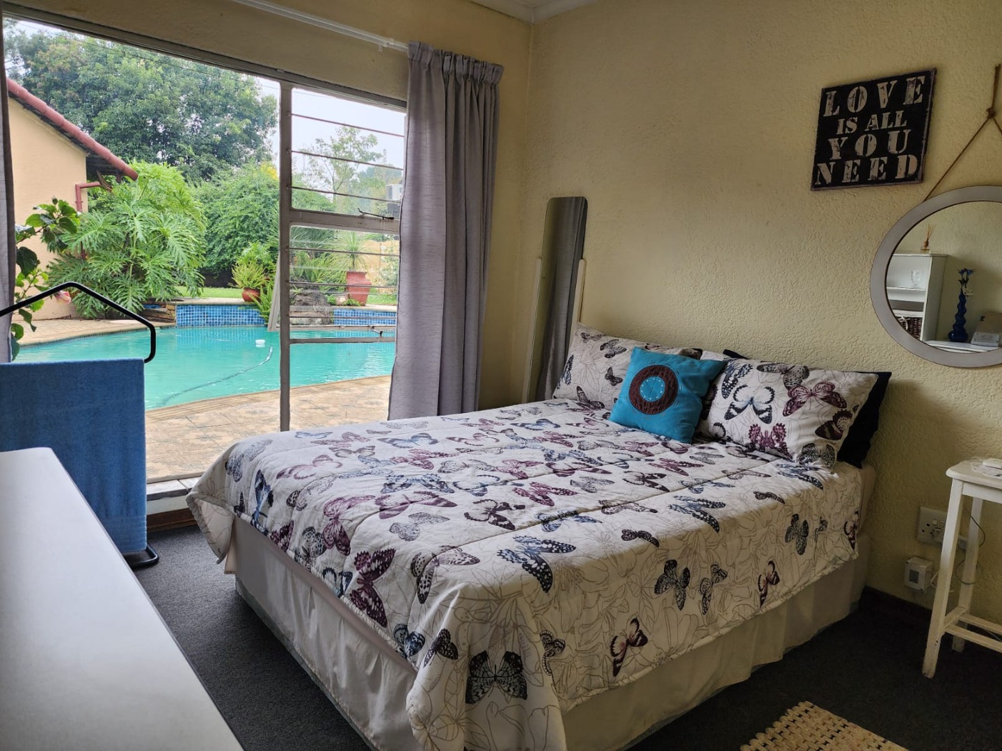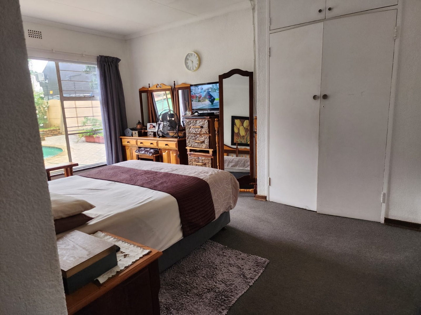 The outdoor area is designed for enjoyment, featuring a distinctive kidney-shaped swimming pool surrounded by a tiled entertainment space — perfect for hosting guests, weekend braais, or simply unwinding in your own private setting.
