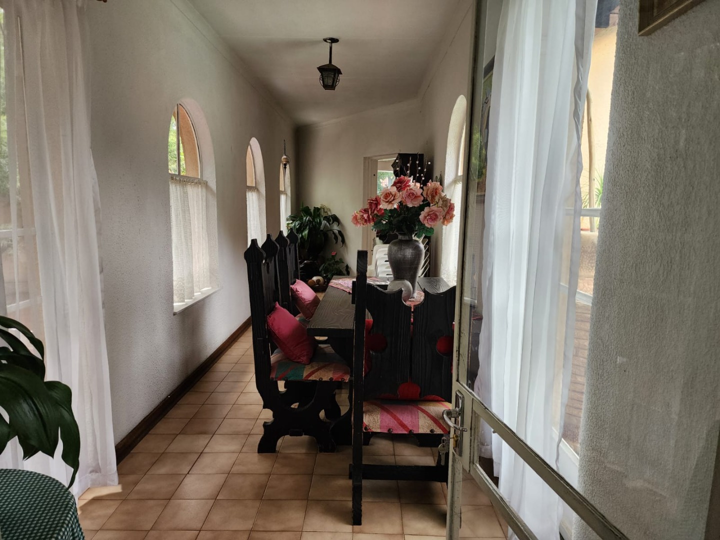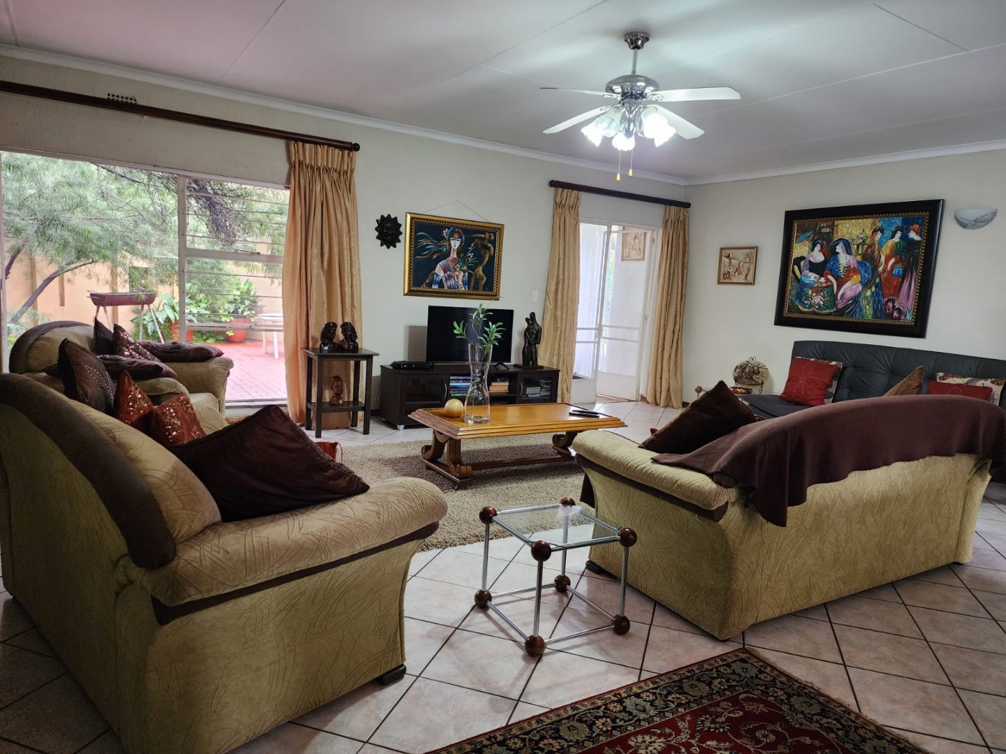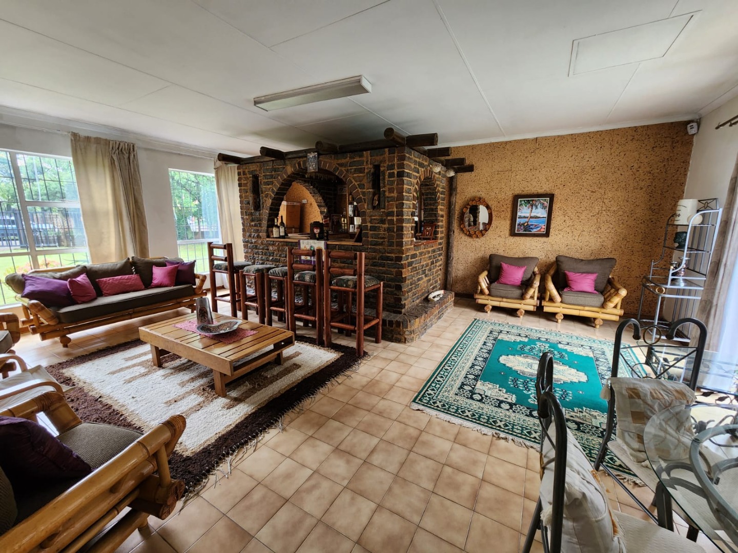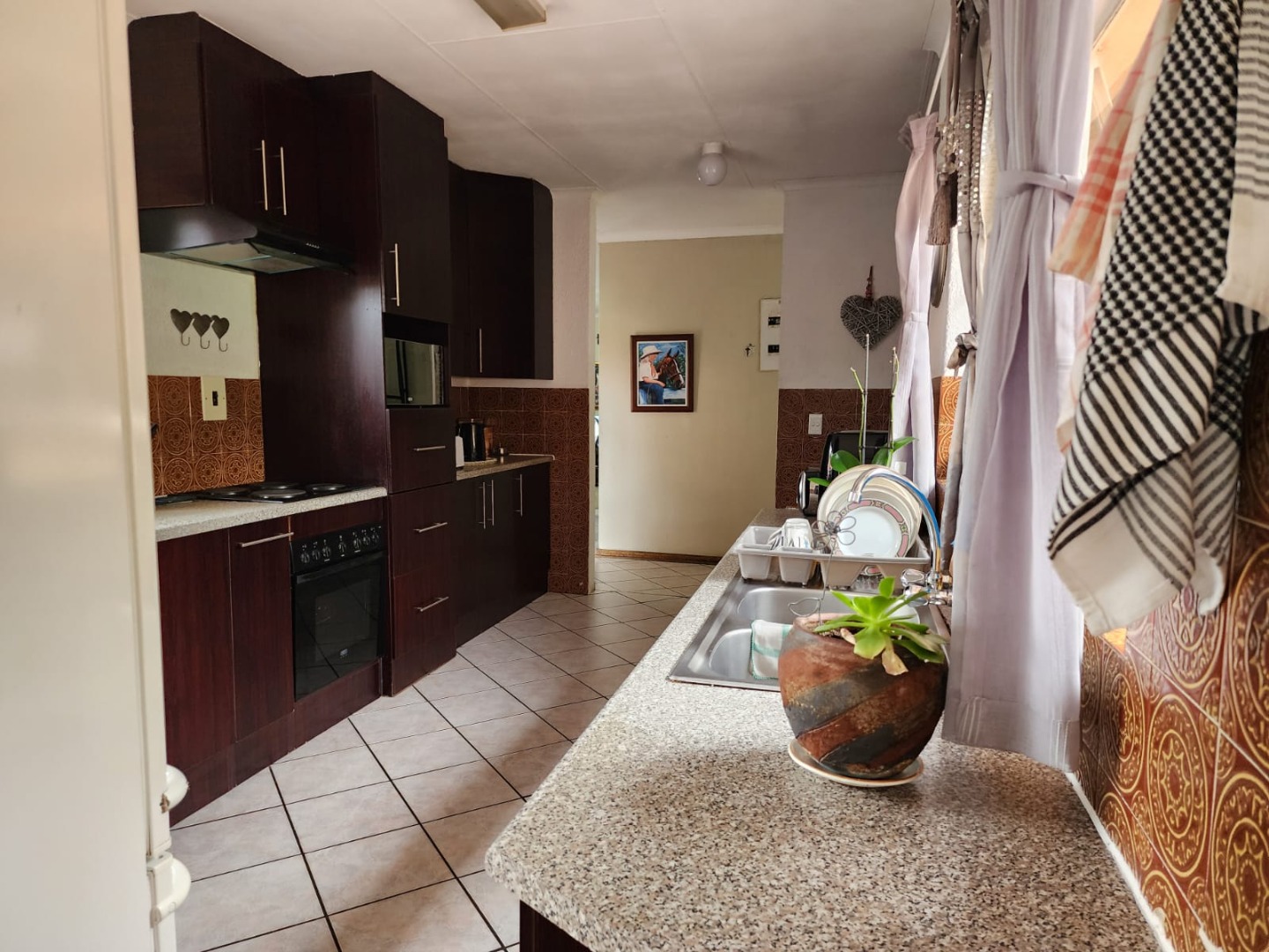 The outdoor area is designed for enjoyment, featuring a distinctive kidney-shaped swimming pool surrounded by a tiled entertainment space — perfect for hosting guests, weekend braais, or simply unwinding in your own private setting.