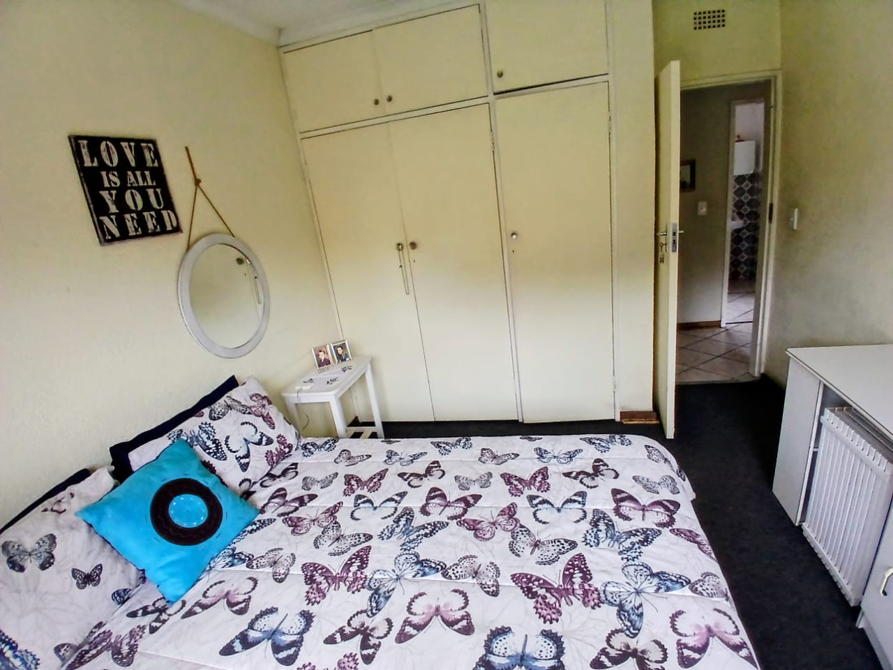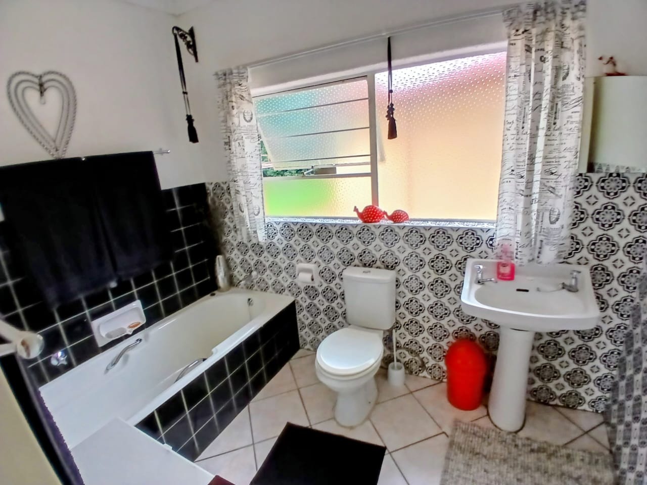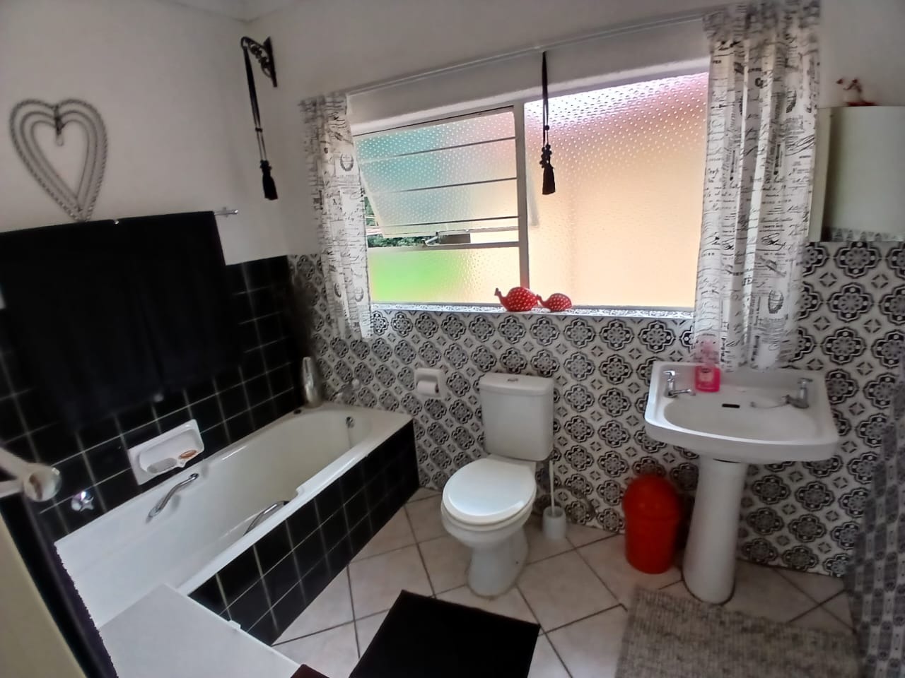 The property offers three well-sized bedrooms with built-in wardrobes, complemented by two bathrooms, including a private en-suite to the main bedroom. One bathroom stands out with its stylish black-and-white tiled design, adding a touch of character to the home.