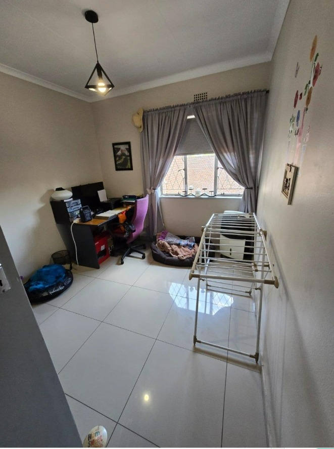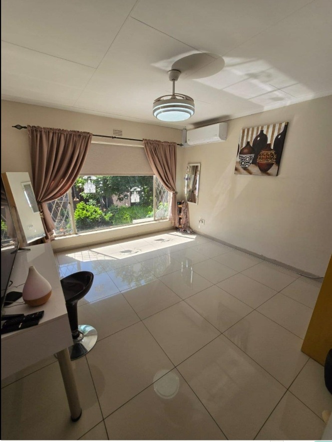 Step inside to find bright, well-maintained interiors featuring clean, shiny tiled flooring throughout, complemented by neutral wall colours that allow for easy personalisation. The main living spaces benefit from ample natural light, creating an airy atmosphere. A modern ceiling fan with integrated lighting and an air conditioning unit in one of the rooms ensure year-round comfort. The layout includes a versatile multi-functional room, ideal for a home office or utility space, and a well-maintained stairwell with a contemporary white metal railing.