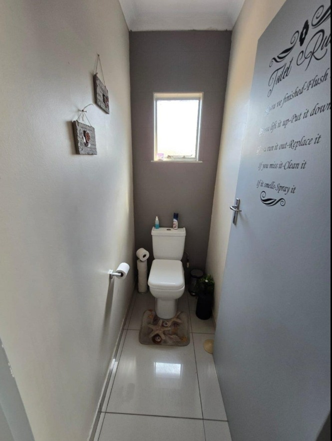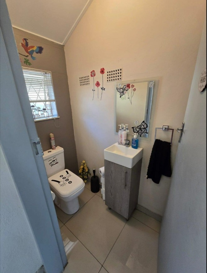 The home offers three comfortable bedrooms, including one with an ensuite bathroom, providing privacy and convenience. Each bedroom features tiled flooring and benefits from natural light, with security bars on windows for added safety. The bathrooms are compact and modern, equipped with essential fixtures, including a vanity with an integrated sink in one and a white toilet in the half-bath. The property is pet-friendly, catering to families with furry companions.