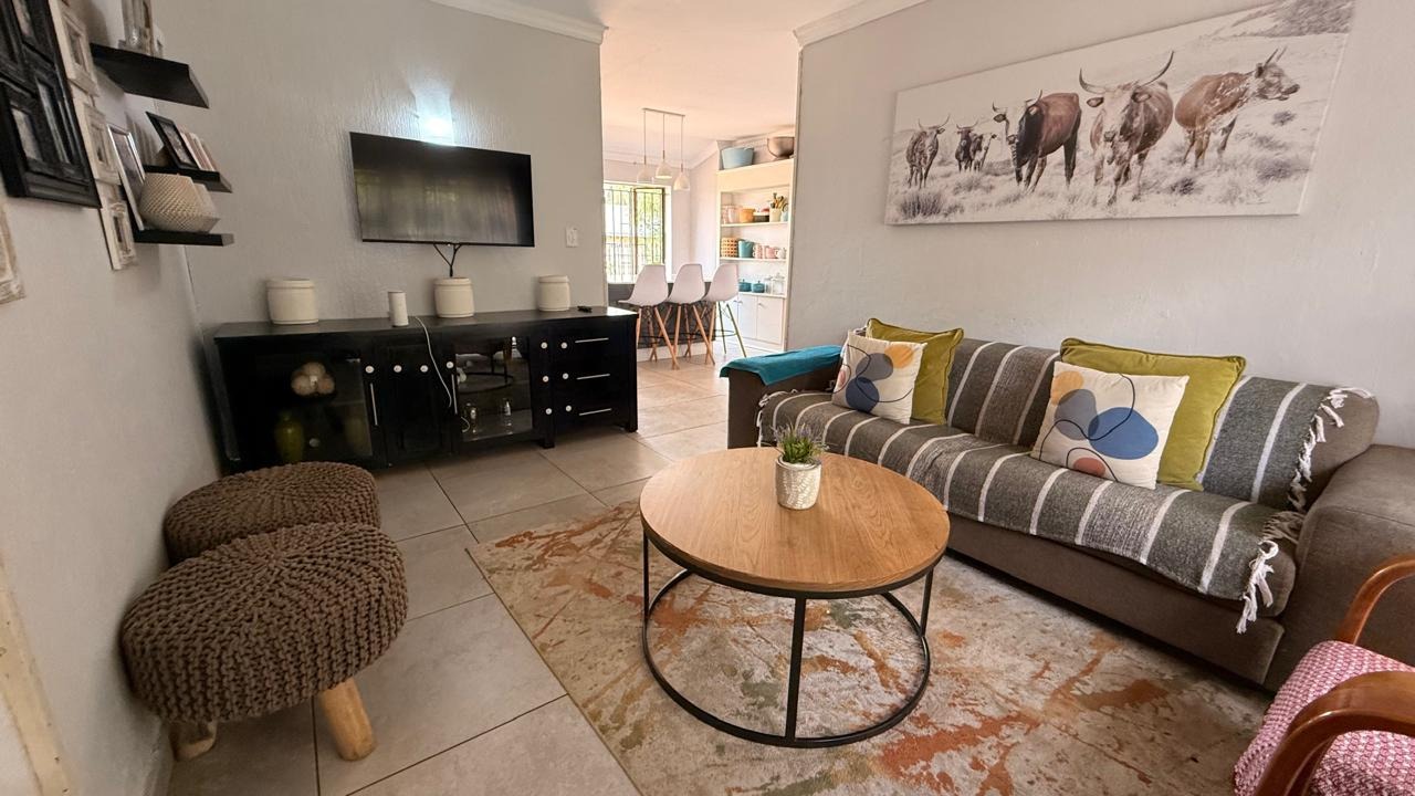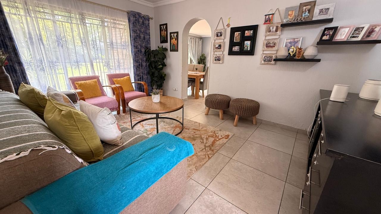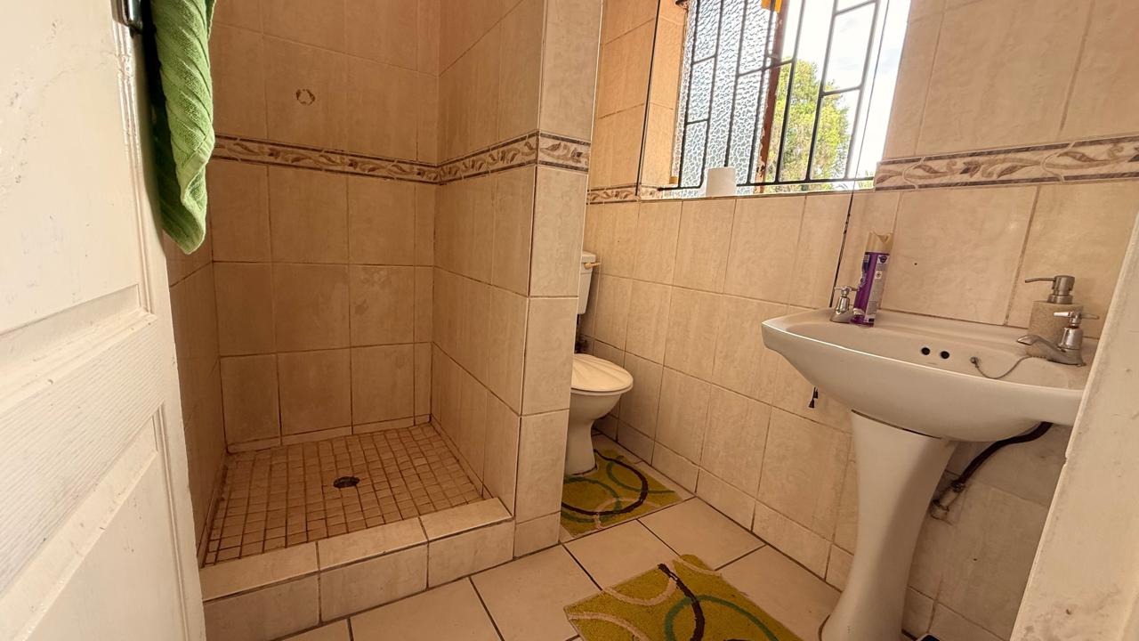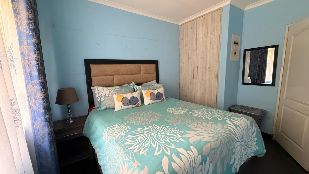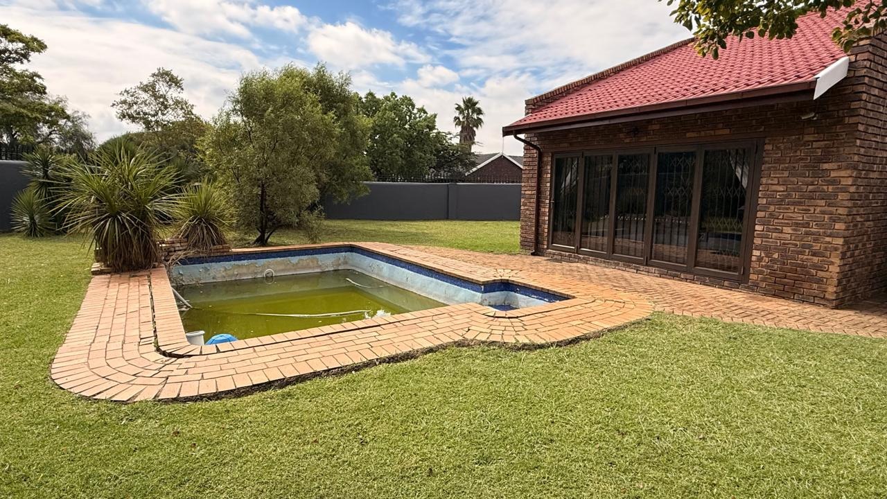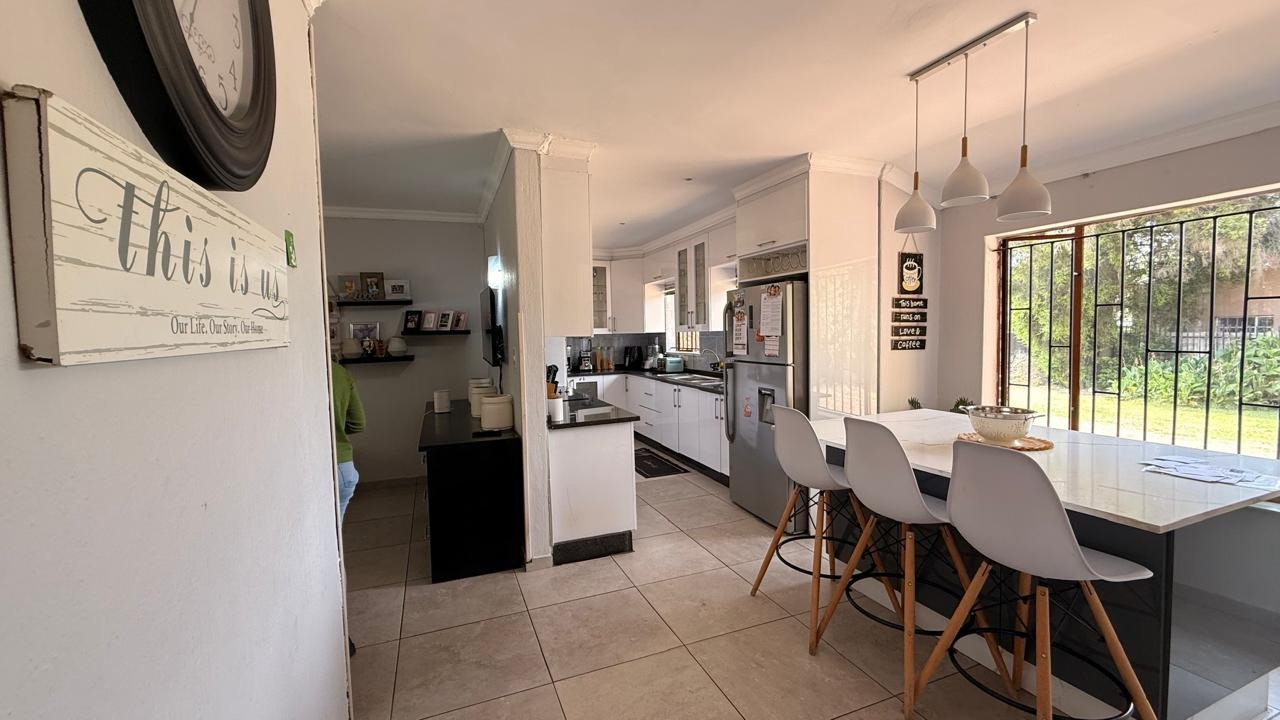 This spacious 4-bedroom, 2-bathroom family home in Brackenhurst, Alberton, offers comfortable living . The interior boasts an open-plan design, featuring tiled flooring throughout the living areas and a modern kitchen. The kitchen is equipped with white high-gloss cabinetry, dark granite countertops, and a central island with seating, perfect for entertaining. Natural light floods the living spaces and bedrooms through large windows . Bedrooms include stylish wooden flooring in the main and built-in wardrobes. Both bathrooms are well-appointed, one with wood-look tiling and a bathtub, the other with a separate shower. The pool is functional but needs a little TLC. This property provides ample space for a growing family in a desirable South African suburb.