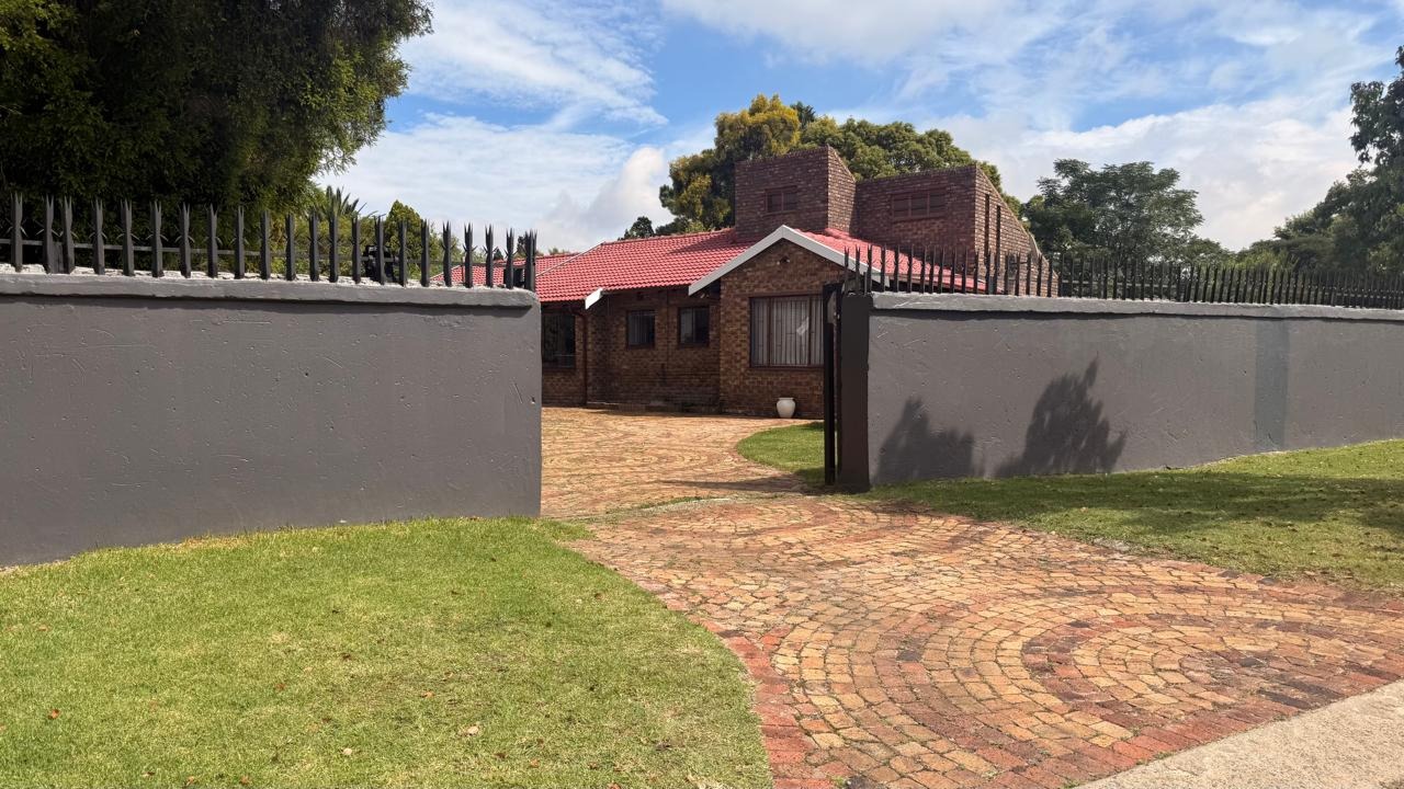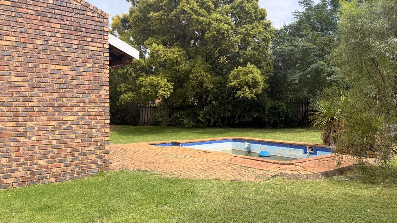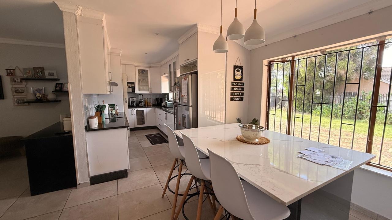 This spacious 4-bedroom, 2-bathroom family home in Brackenhurst, Alberton, offers comfortable living . The interior boasts an open-plan design, featuring tiled flooring throughout the living areas and a modern kitchen. The kitchen is equipped with white high-gloss cabinetry, dark granite countertops, and a central island with seating, perfect for entertaining. Natural light floods the living spaces and bedrooms through large windows . Bedrooms include stylish wooden flooring in the main and built-in wardrobes. Both bathrooms are well-appointed, one with wood-look tiling and a bathtub, the other with a separate shower. The pool is functional but needs a little TLC. This property provides ample space for a growing family in a desirable South African suburb.