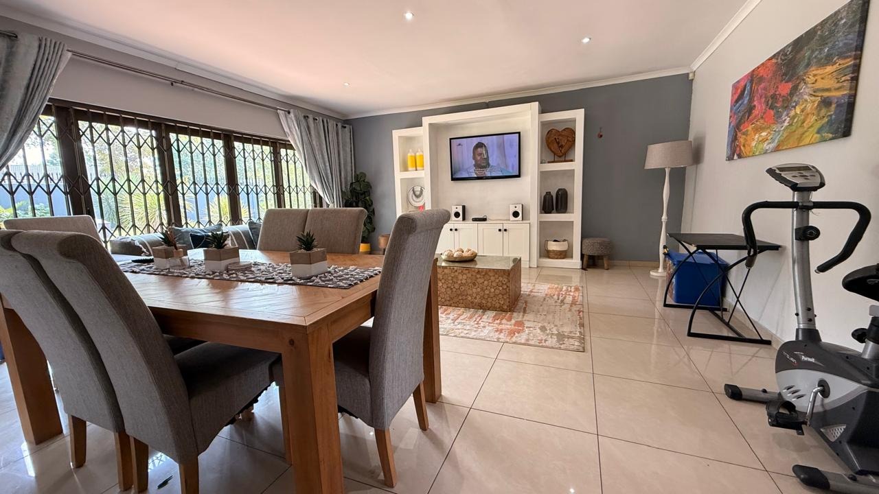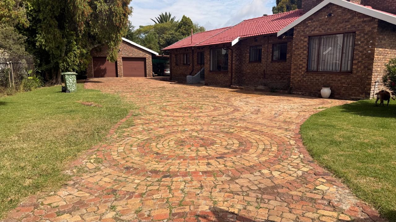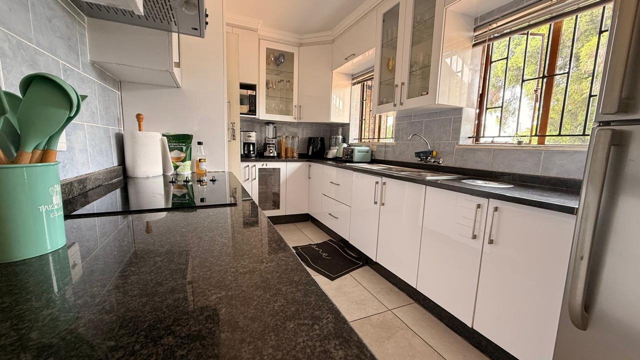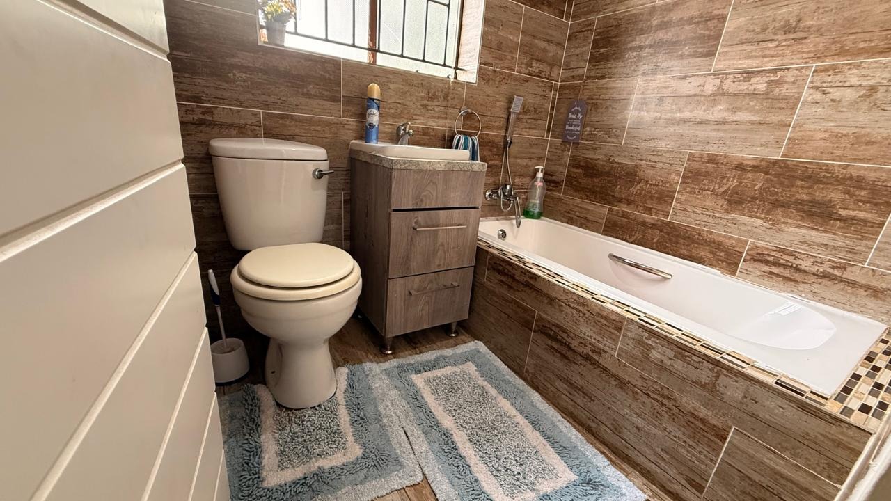 This spacious 4-bedroom, 2-bathroom family home in Brackenhurst, Alberton, offers comfortable living . The interior boasts an open-plan design, featuring tiled flooring throughout the living areas and a modern kitchen. The kitchen is equipped with white high-gloss cabinetry, dark granite countertops, and a central island with seating, perfect for entertaining. Natural light floods the living spaces and bedrooms through large windows . Bedrooms include stylish wooden flooring in the main and built-in wardrobes. Both bathrooms are well-appointed, one with wood-look tiling and a bathtub, the other with a separate shower. The pool is functional but needs a little TLC. This property provides ample space for a growing family in a desirable South African suburb.