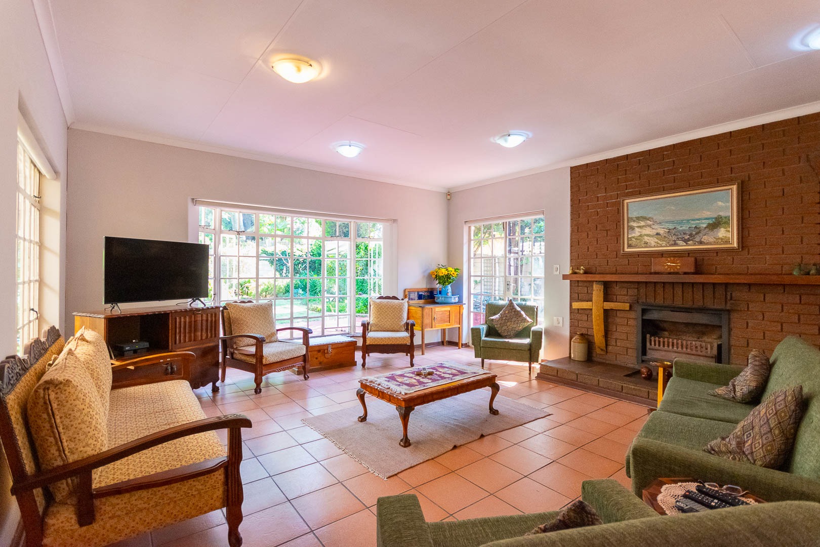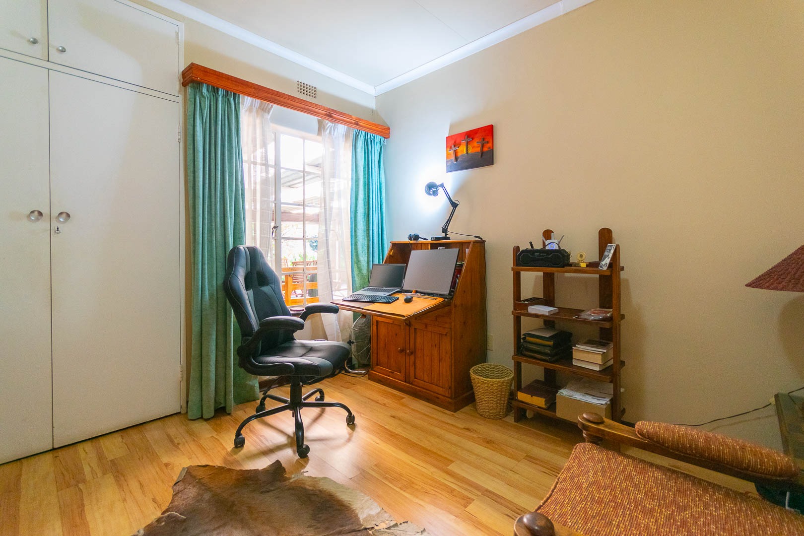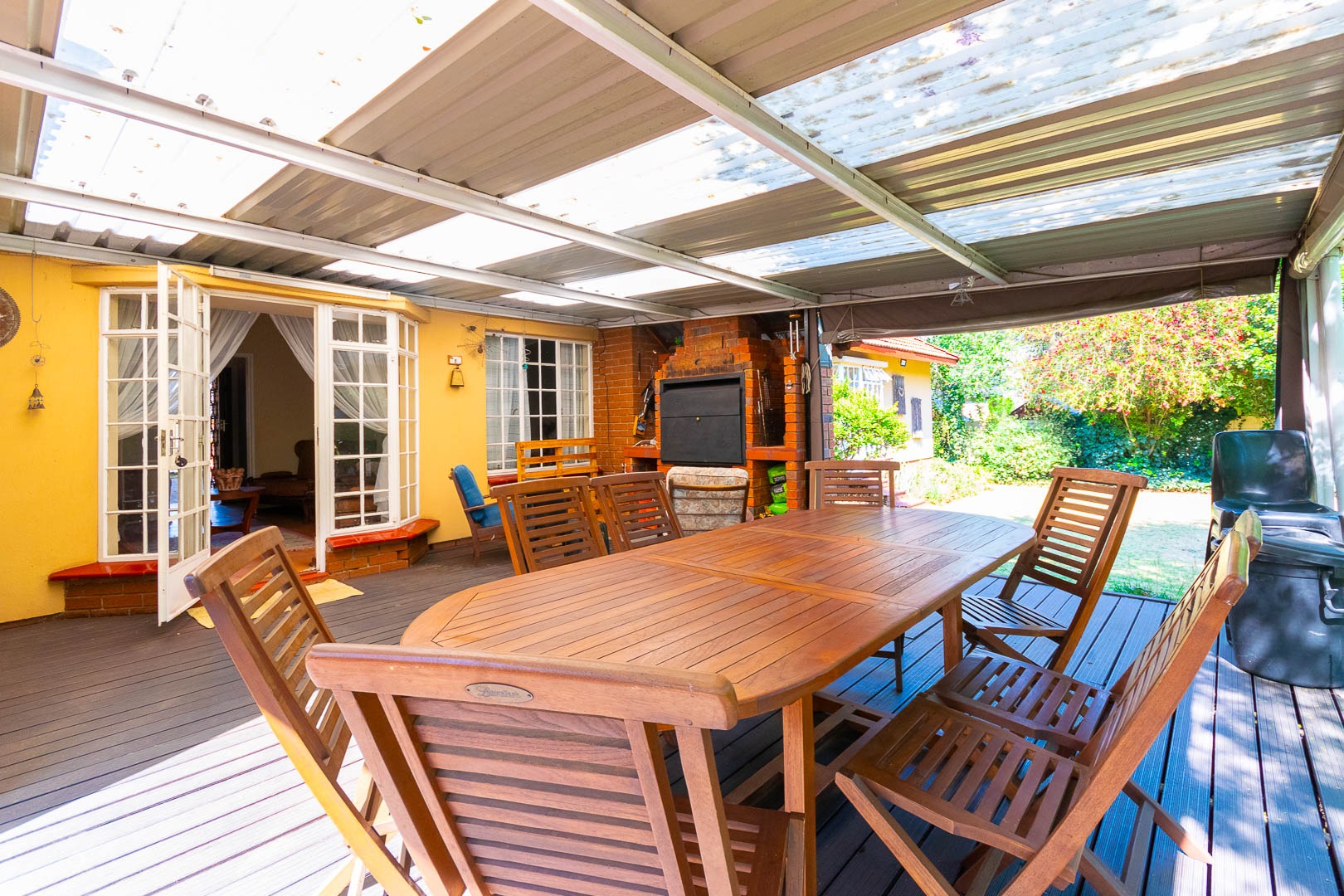 Step outside to a spacious yard with a built-in braai area, fully enclosed with drop-down blinds for year-round entertaining. Practical additions include an outdoor laundry room, a separate bathroom, and a storeroom.