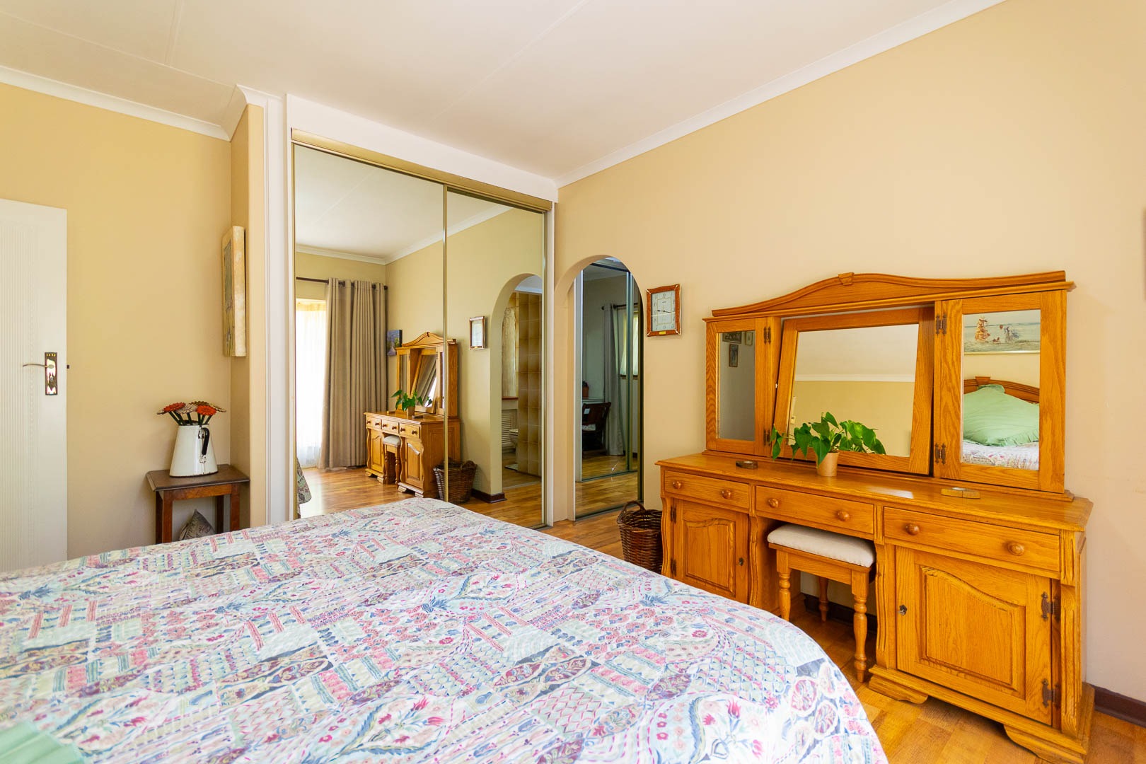 The home offers four bedrooms, including two main bedrooms—each with its own en suite bathroom. One of these suites includes a private entrance, making it ideal for guests. Additionally, there is a third full bathroom and a separate guest toilet for added convenience.