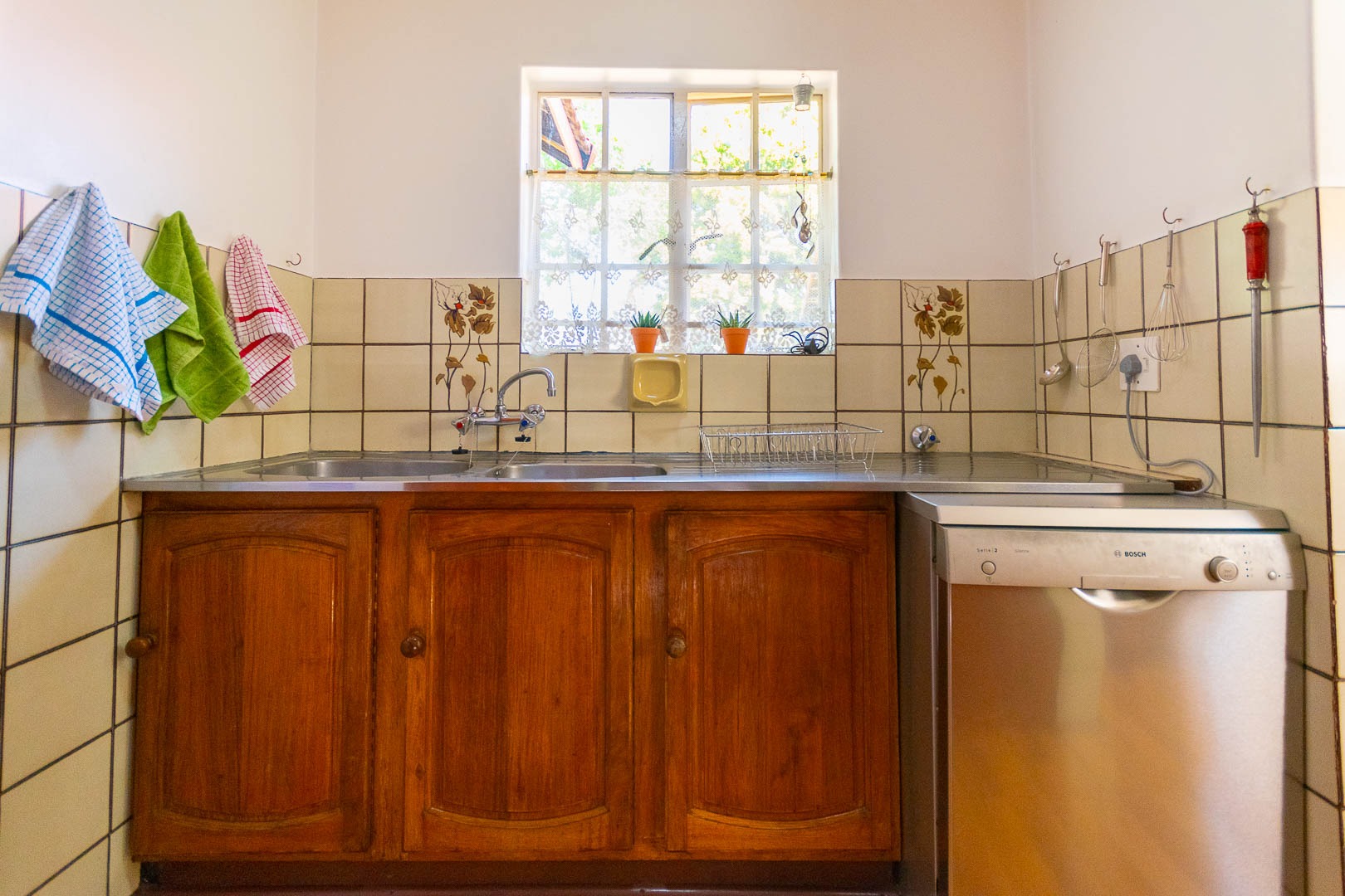 The kitchen features solid wooden cabinetry and a large window that fills the space with natural light, creating a bright and inviting atmosphere for cooking and gathering.