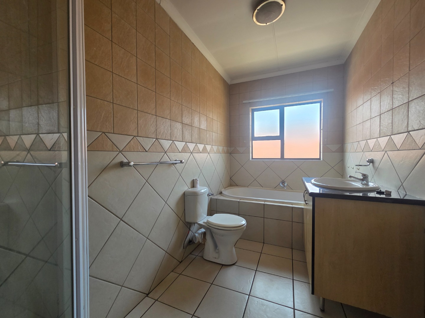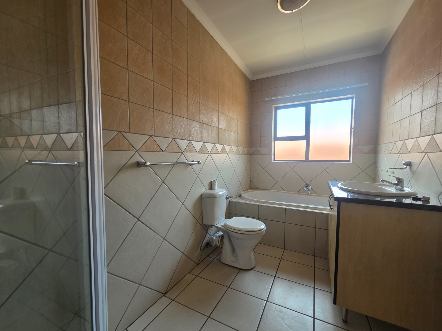 Upstairs, the unit boasts two well-sized bedrooms, both fitted with built-in cupboards. The home is serviced by a full bathroom that includes a bath, shower, toilet, and wash basin, finished for everyday convenience.