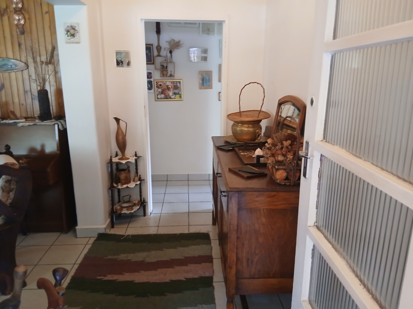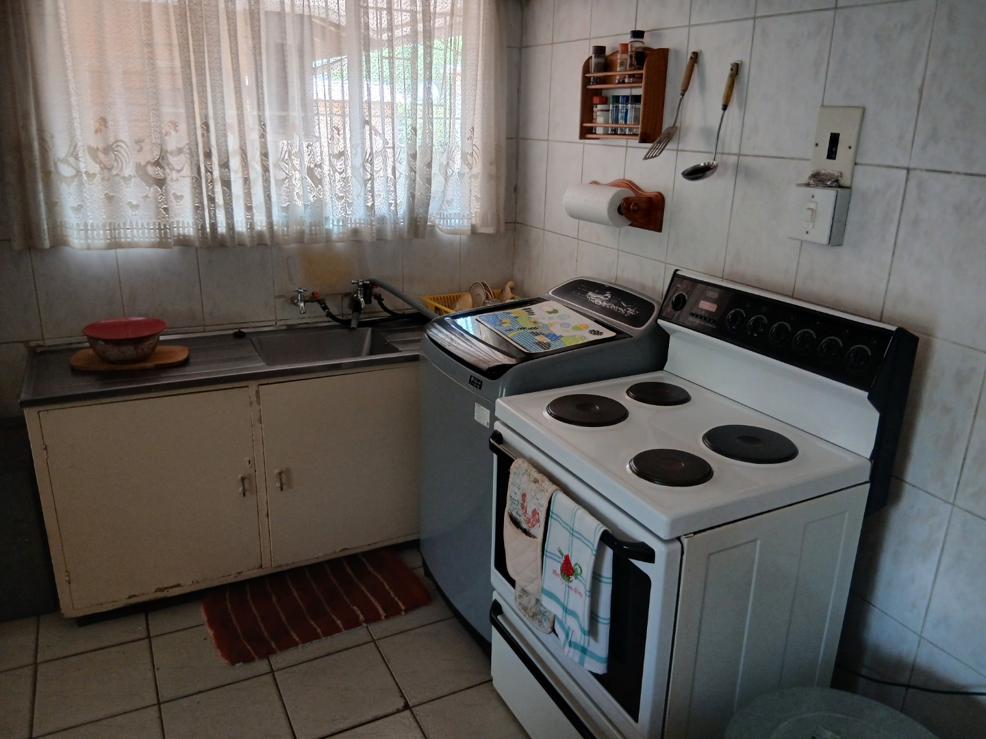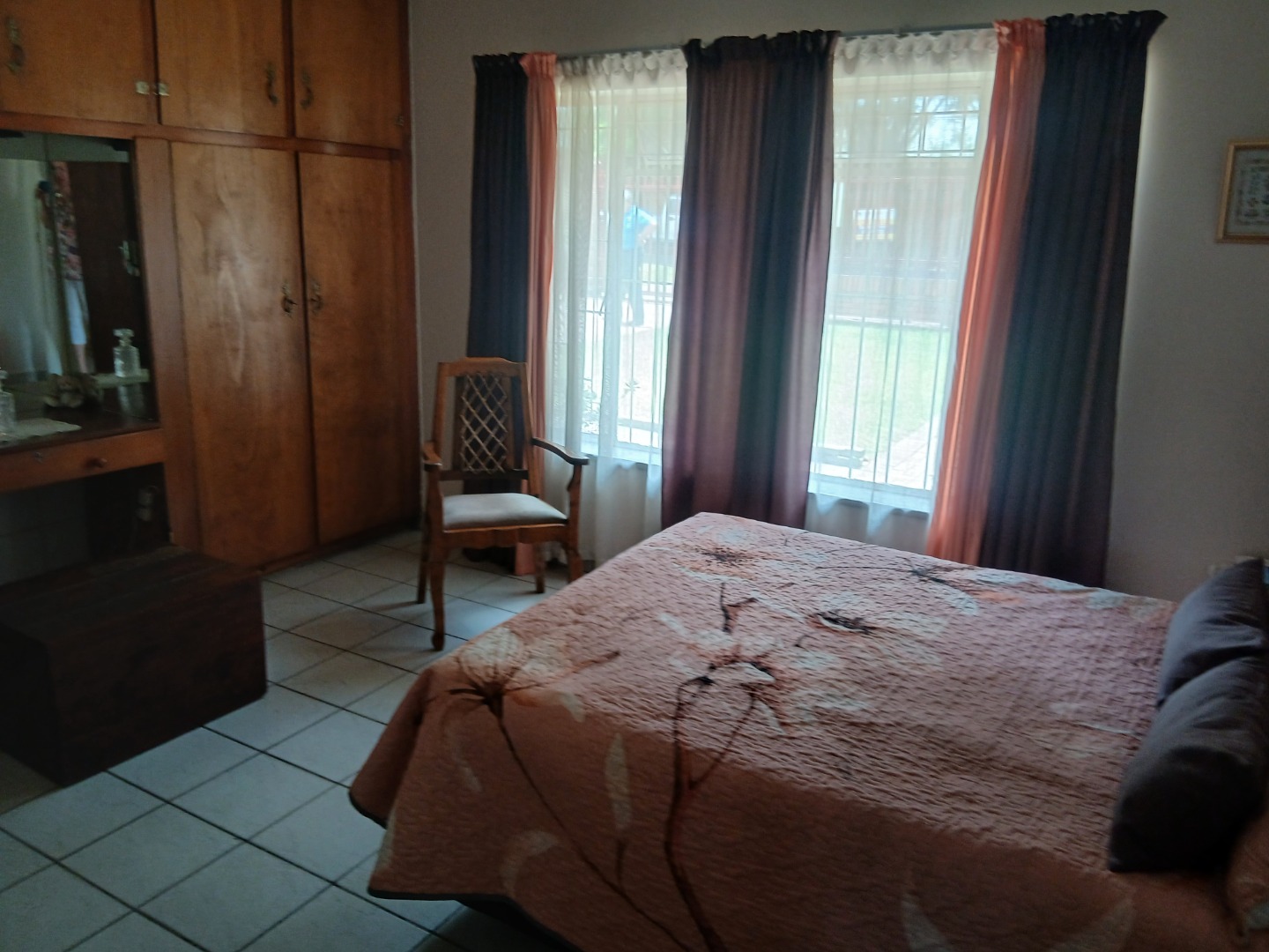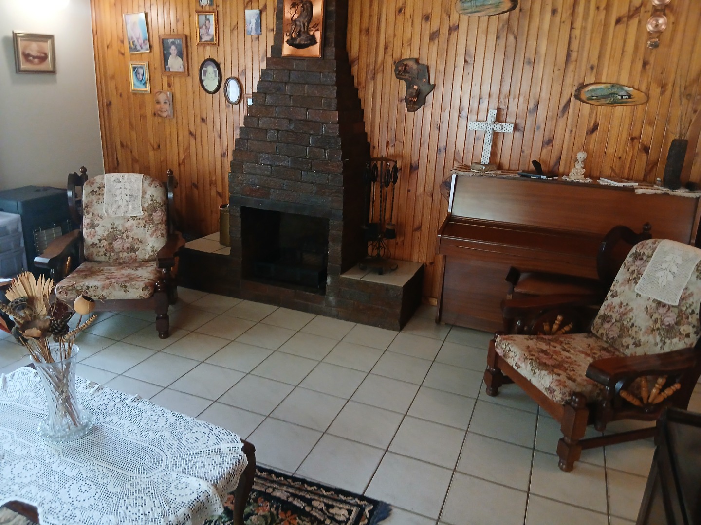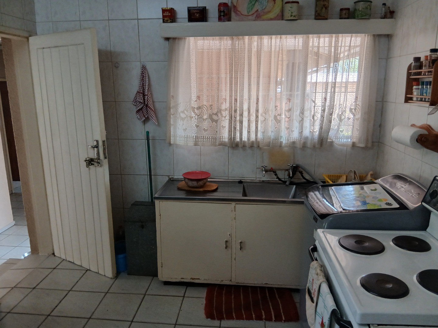 The country-style kitchen is a true highlight, featuring plenty of wooden cupboards, space for a table in the center, and ample room for all your electrical appliances. A door from the kitchen leads to an additional spacious area consisting of a large tiled lounge, bedroom, bathroom, and small kitchen. This section can be used as a flatlet or easily incorporated as part of the main house.
