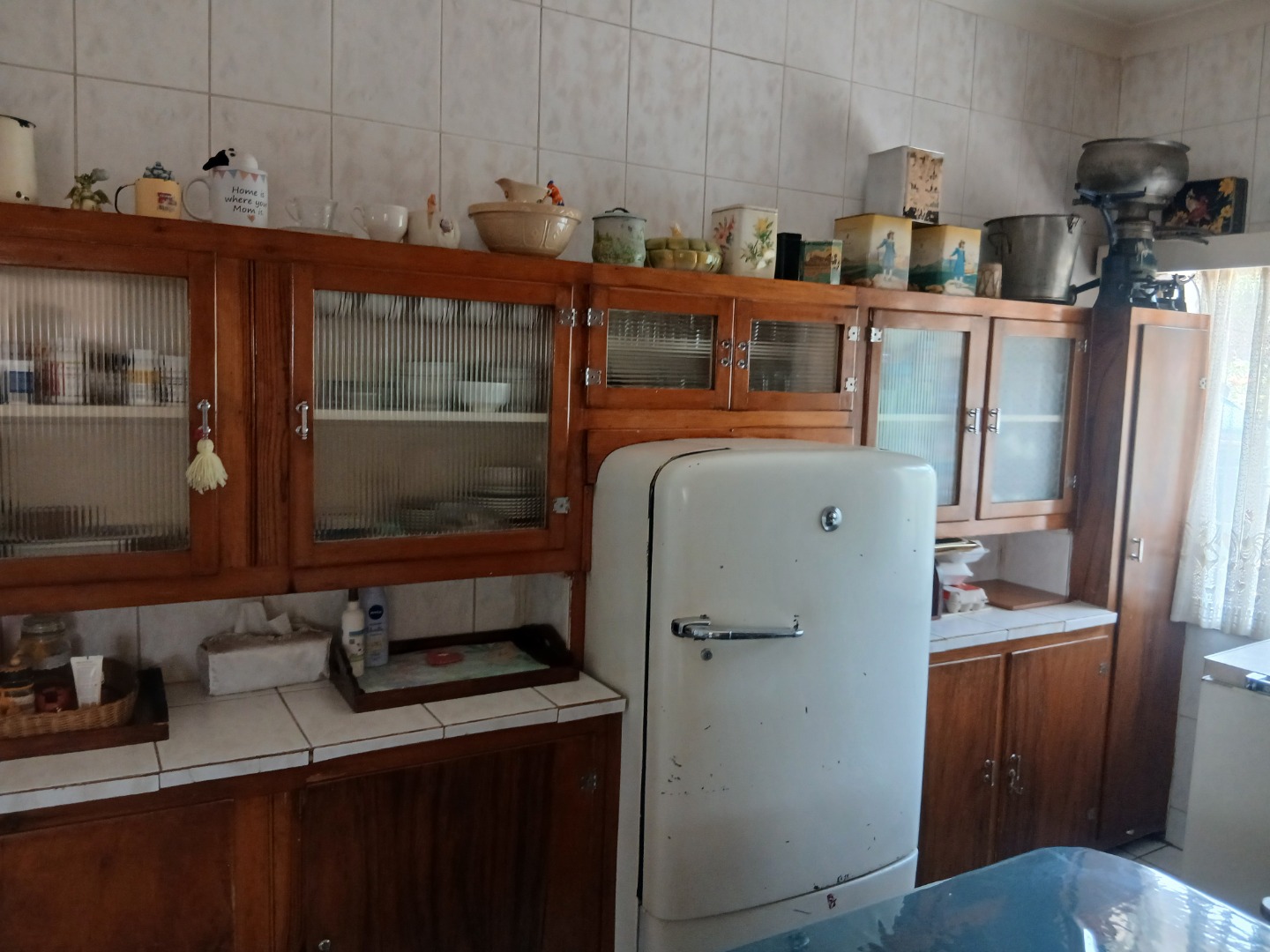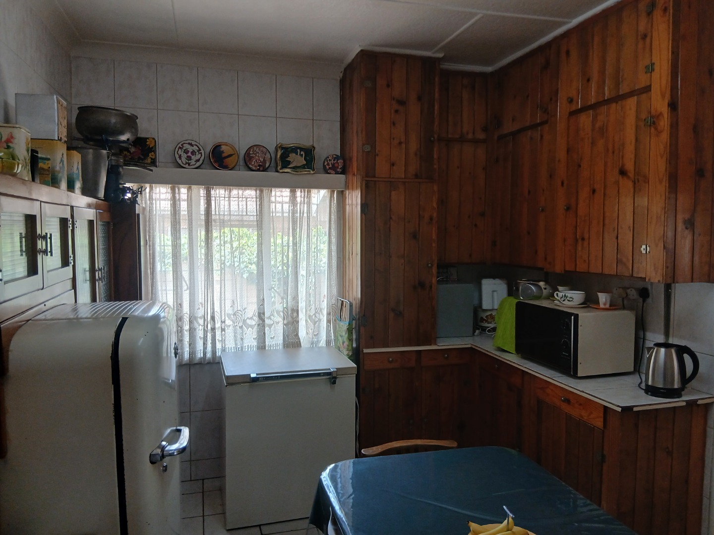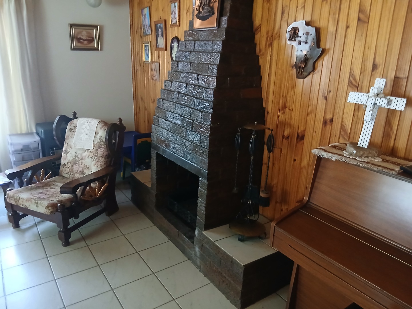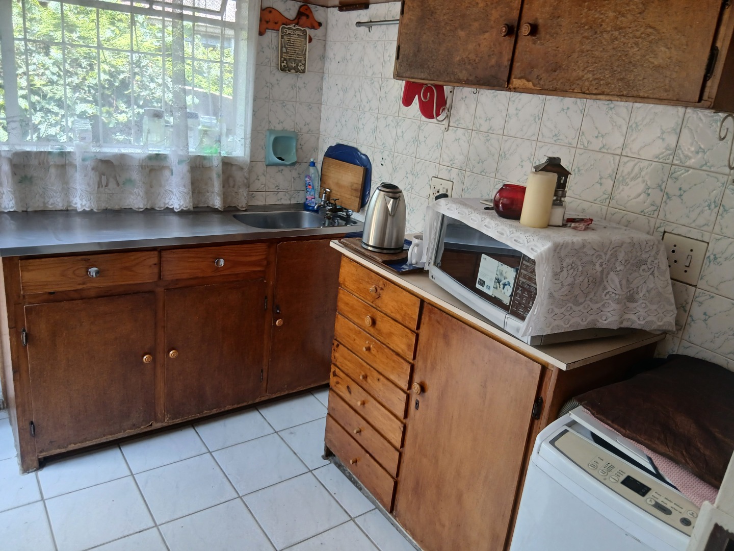 The country-style kitchen is a true highlight, featuring plenty of wooden cupboards, space for a table in the center, and ample room for all your electrical appliances. A door from the kitchen leads to an additional spacious area consisting of a large tiled lounge, bedroom, bathroom, and small kitchen. This section can be used as a flatlet or easily incorporated as part of the main house.