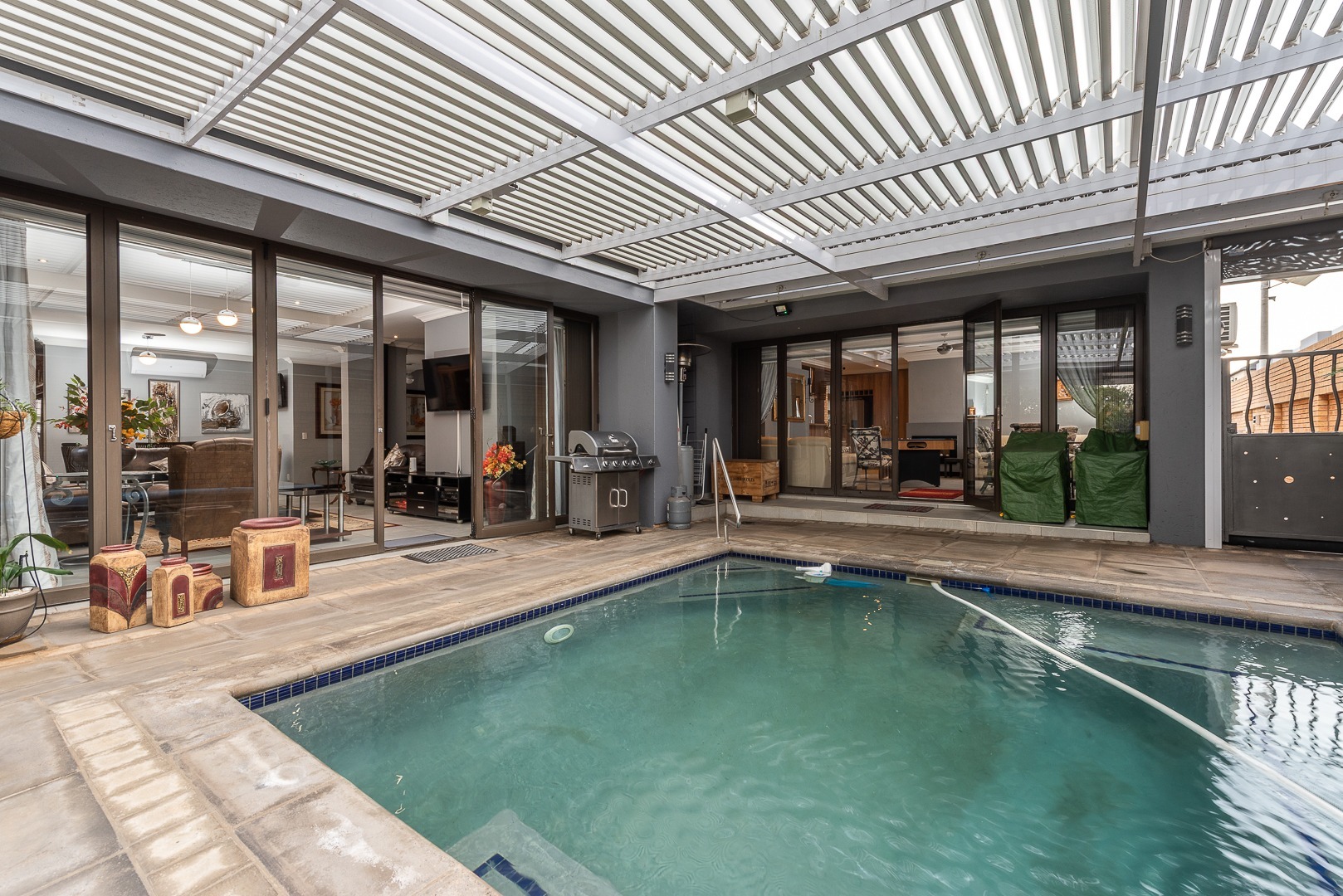 Open-plan lounge with gas fireplace and aluminium stacking doors opening to the pool and garden