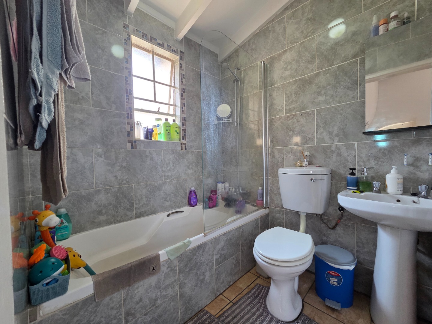 The unit features two well-sized bedrooms, both fitted with built-in cupboards. The home is serviced by a neatly finished bathroom comprising a bath with hand shower, wash basin, and toilet.