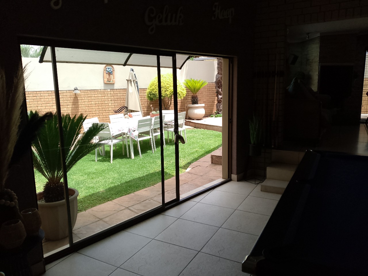 There is a sliding door out to a pretty garden and pool area.