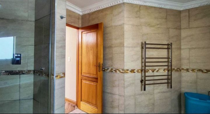Upstairs, four spacious bedrooms offer built-in cupboards and laminated floors. The luxurious main suite includes a dressing room and spa-style en suite. A full bathroom serves the remaining bedrooms, three of which open onto a shared balcony.