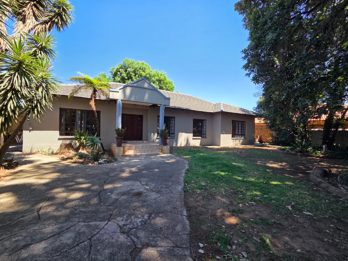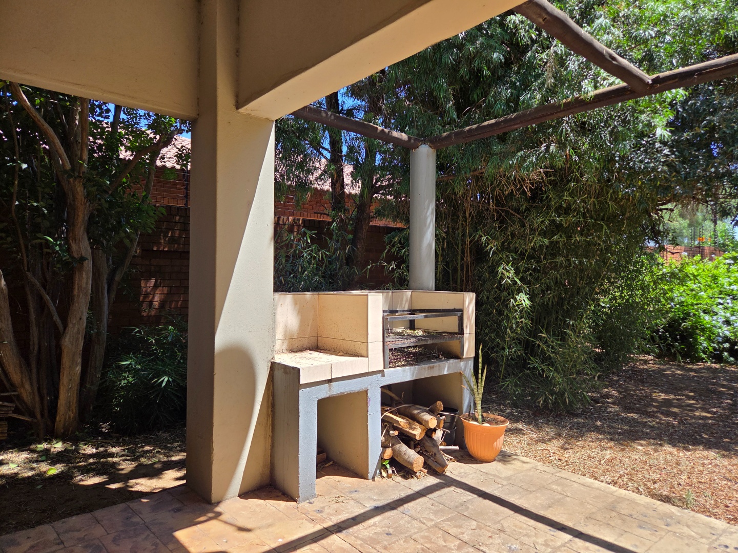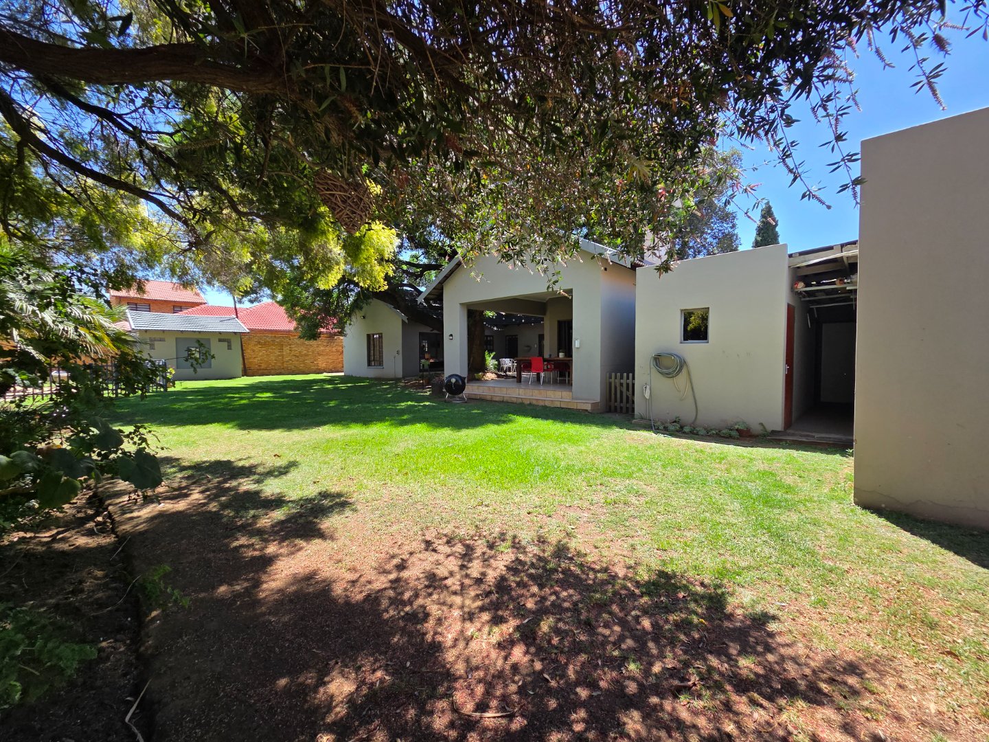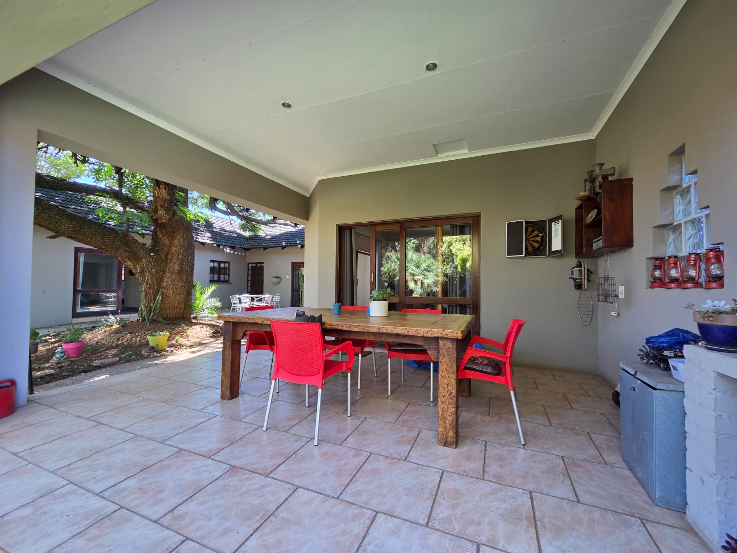 Enjoy outdoor living on the patio with a tiled floor, shaded by a large tree—perfect for weekend braais or quiet evenings. Parking is a breeze with 2 garages and 2 covered carports.