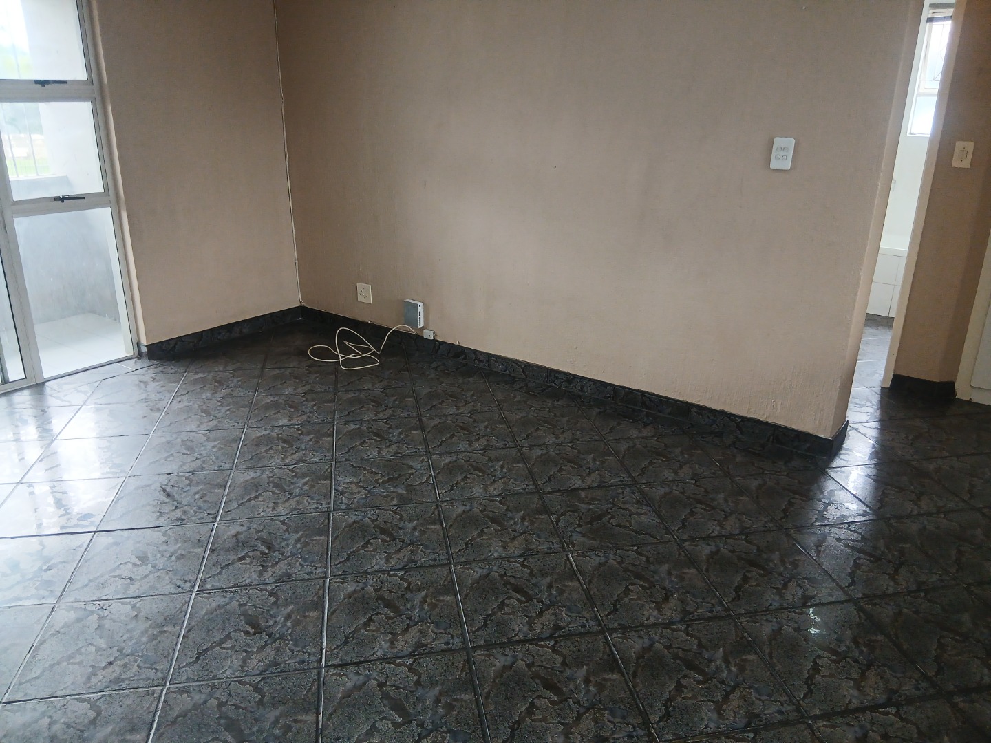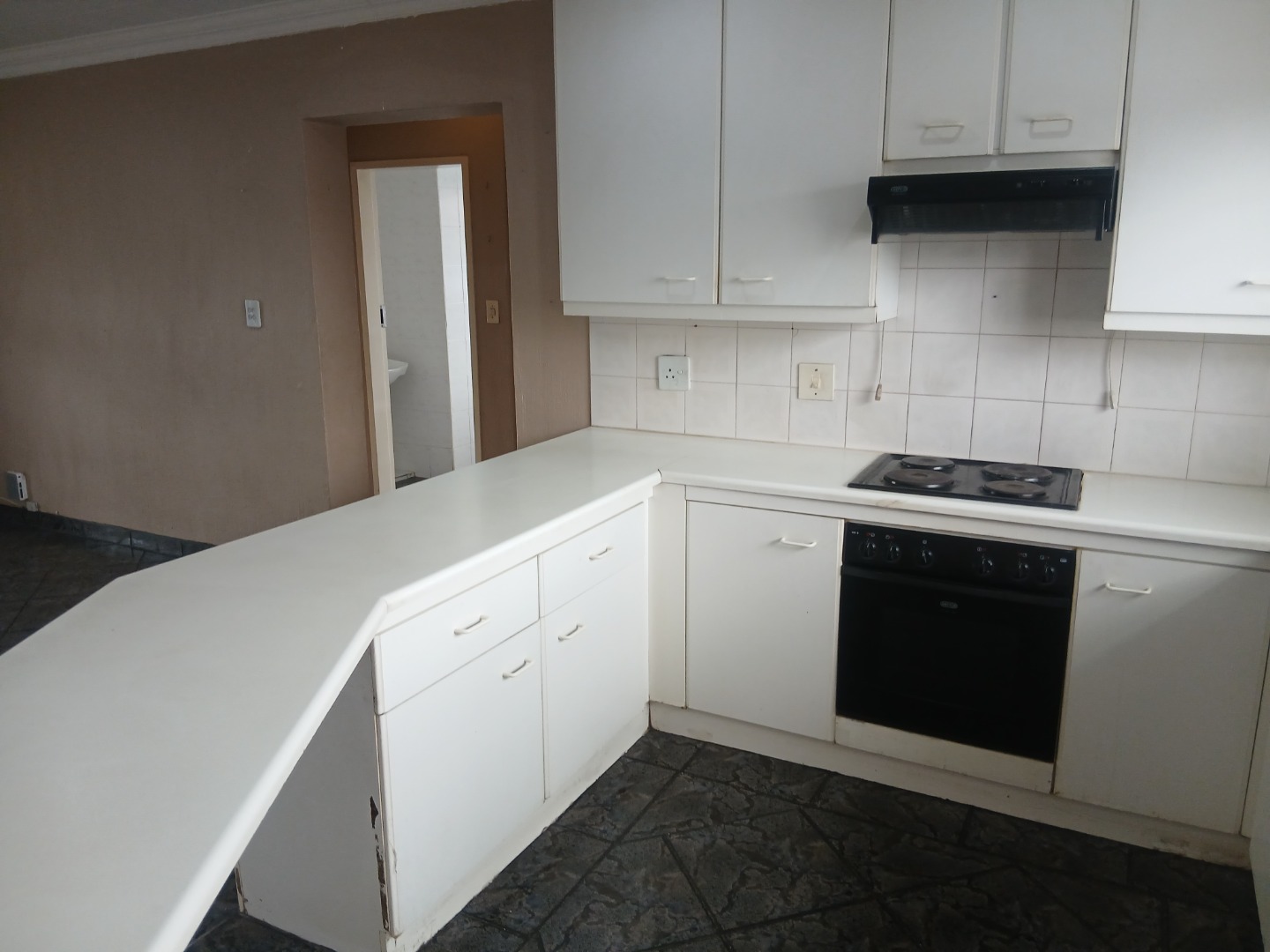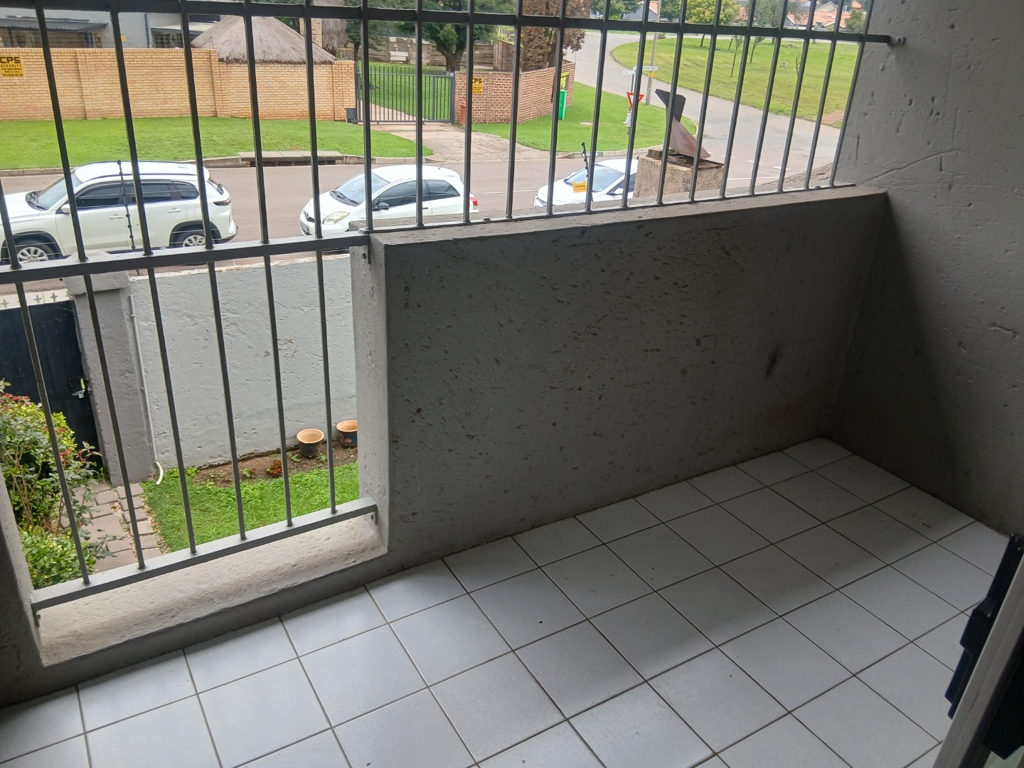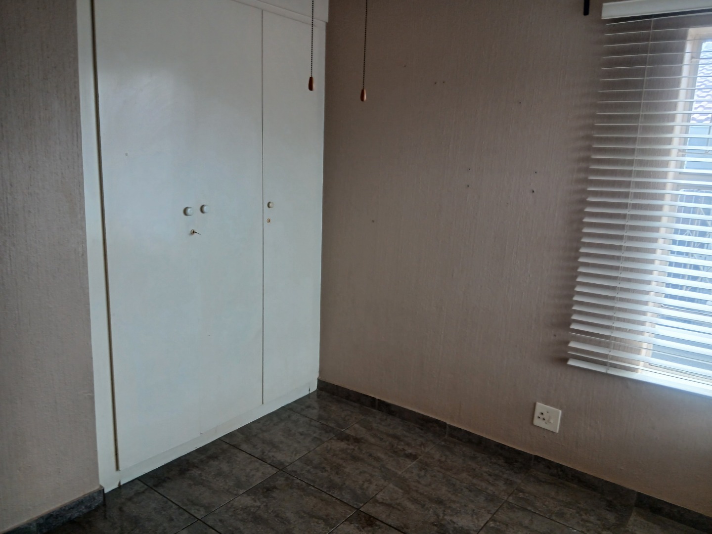 Open-plan tiled lounge leading into a practical kitchen fitted with white melamine cupboards, an electric hob, and undercounter oven. Two well-sized tiled bedrooms, both offering built-in cupboards, one full bathroom equipped with a bath, basin, and toilet, downstairs private courtyard. Parking includes 1 covered tandem-style parking bay plus 1 open parking space, paved driveway and well-kept complex surroundings.
