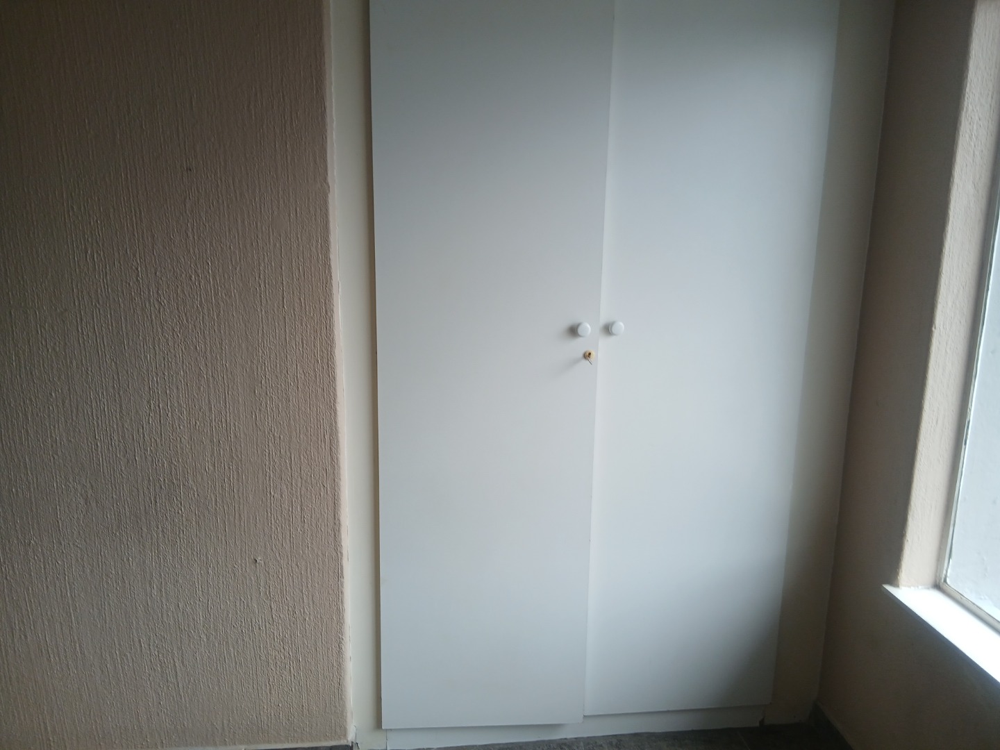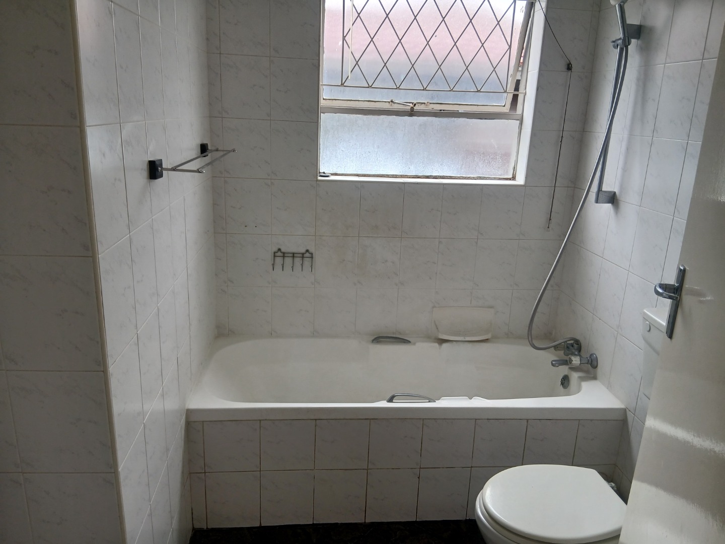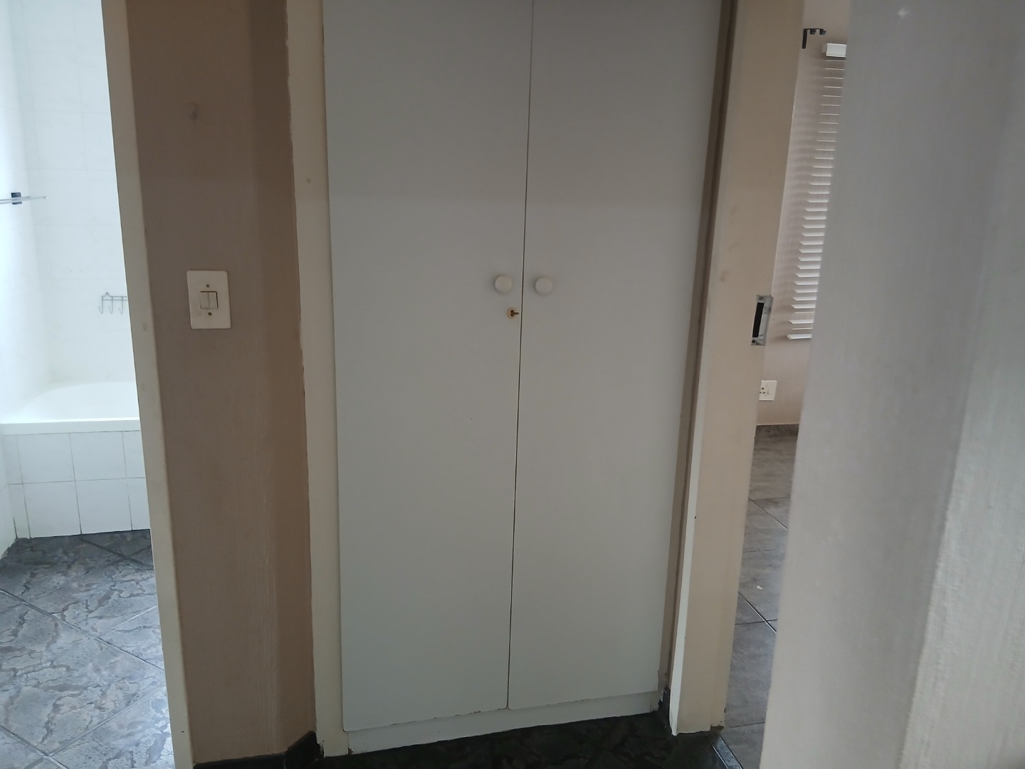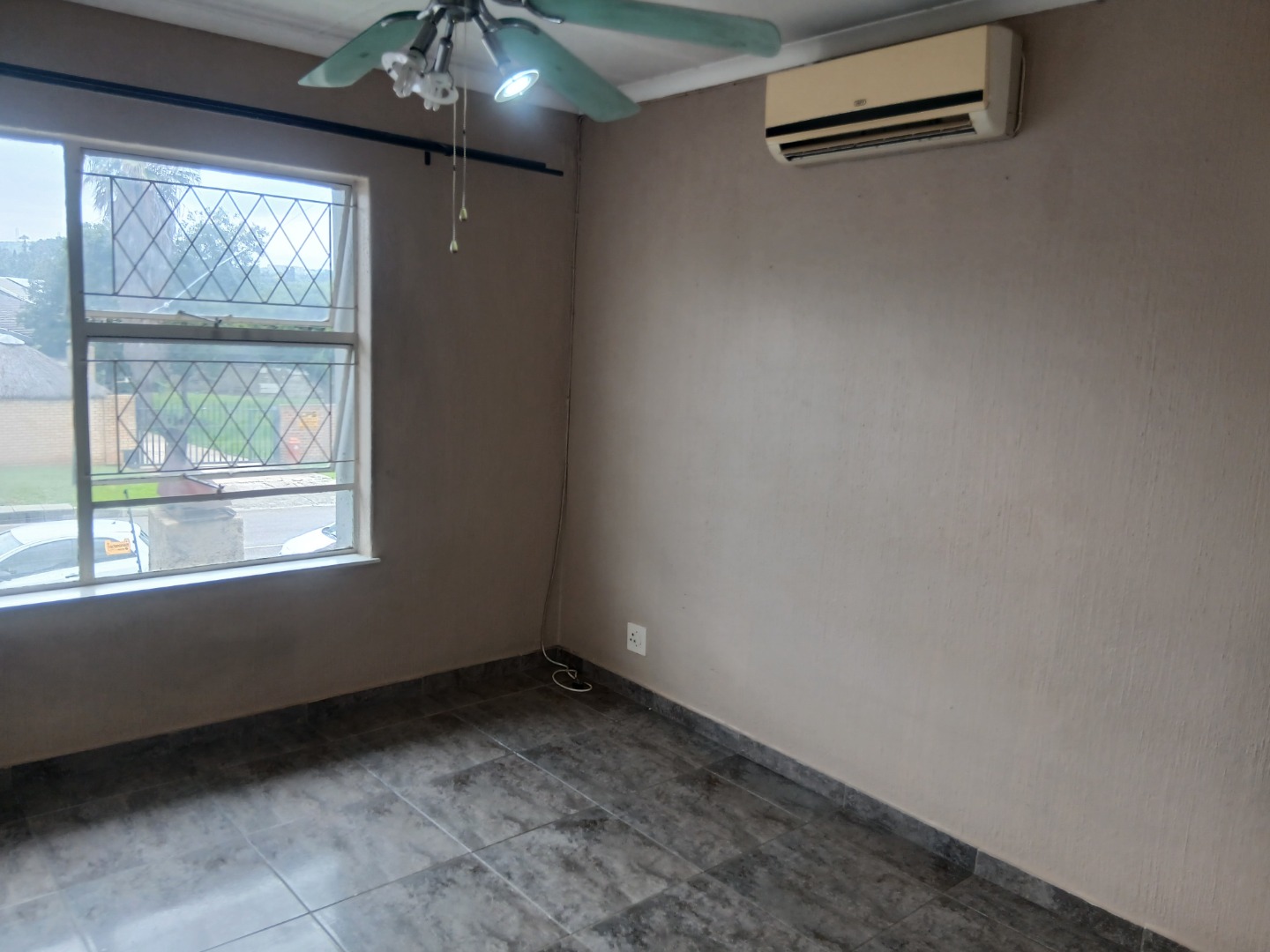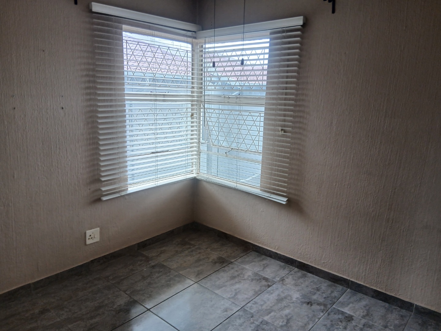 Open-plan tiled lounge leading into a practical kitchen fitted with white melamine cupboards, an electric hob, and undercounter oven. Two well-sized tiled bedrooms, both offering built-in cupboards, one full bathroom equipped with a bath, basin, and toilet, downstairs private courtyard. Parking includes 1 covered tandem-style parking bay plus 1 open parking space, paved driveway and well-kept complex surroundings.