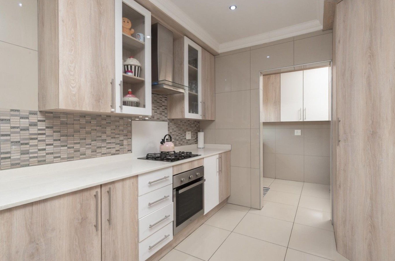 At the heart of the home, the modern kitchen is a highlight, featuring light wood-grain and white cabinetry, light countertops, and a contemporary mosaic tile backsplash. It is well-appointed with an integrated oven, hob, and extractor fan, alongside a convenient breakfast bar for casual dining. Adjacent to the main kitchen, a functional utility area offers additional storage and dedicated spaces for a dishwasher and washing machine, maintaining the home's cohesive design and practicality.