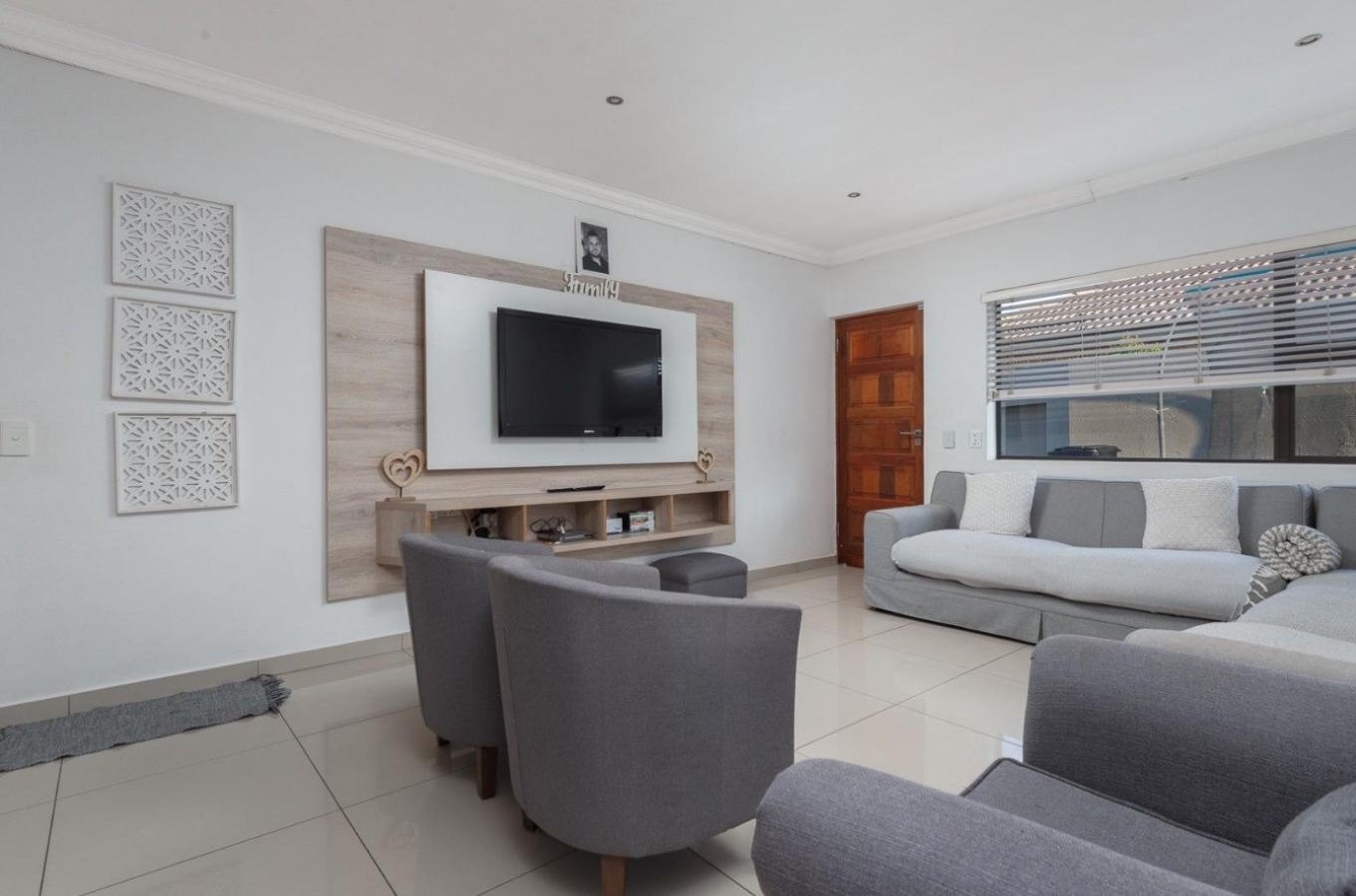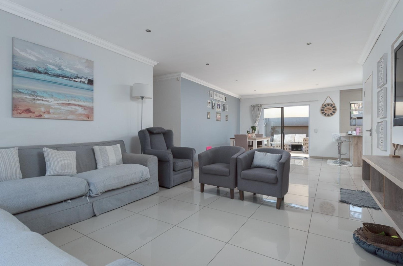 Step inside to an intelligently designed open-plan layout that seamlessly connects the living, dining, and kitchen areas, creating an expansive and versatile space for both relaxation and entertaining. The interior boasts a modern, clean aesthetic with light-coloured walls and easy-to-maintain tiled flooring throughout. The lounge area features an integrated wall-mounted TV unit with shelving, while large sliding doors provide abundant natural light and effortless access to the outdoor patio, extending your living space.