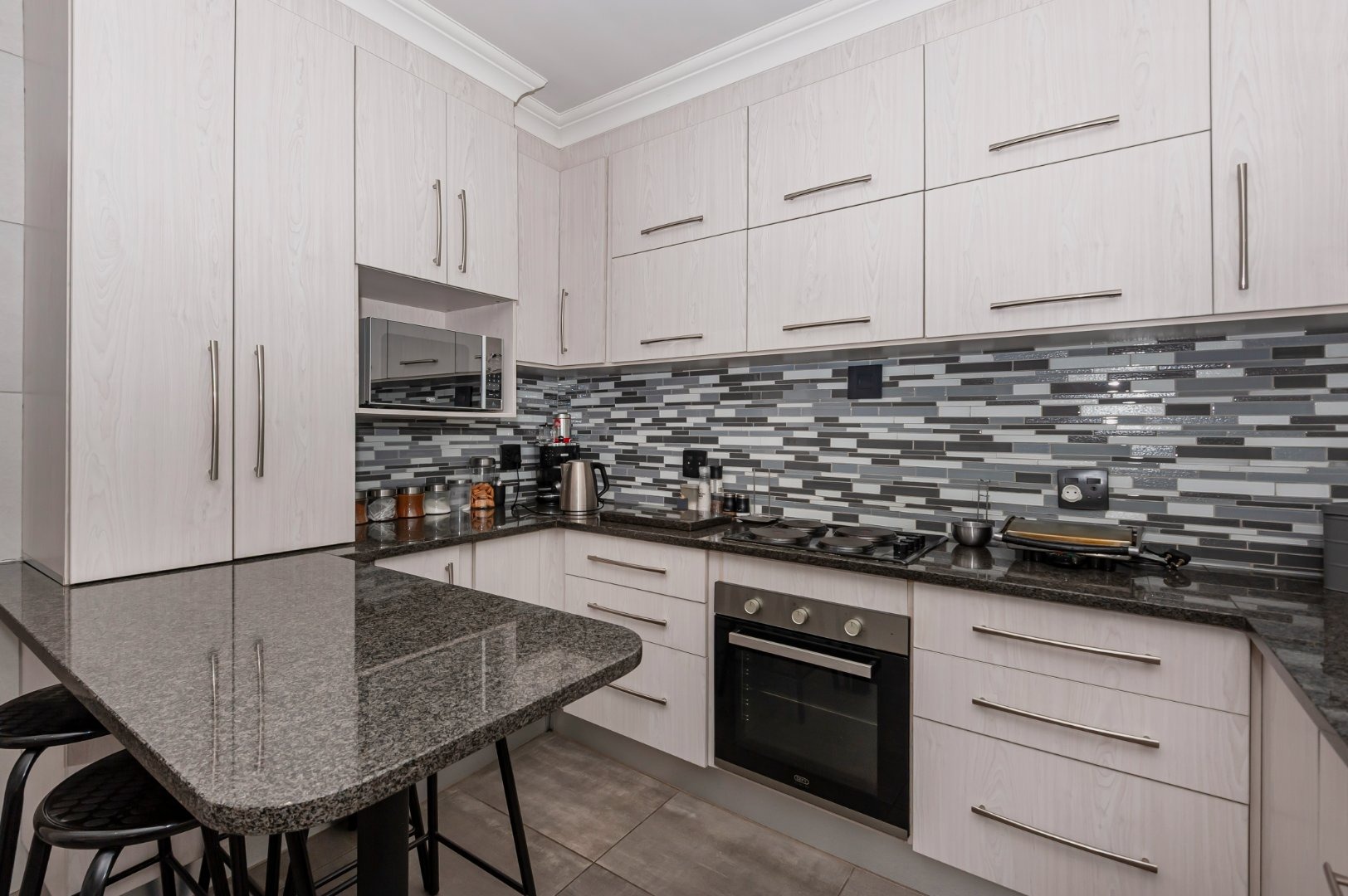 The kitchen is both stylish and practical, fitted with granite countertops, an electric stove and oven, and ample space for additional appliances — perfectly suited for everyday living and hosting guests.