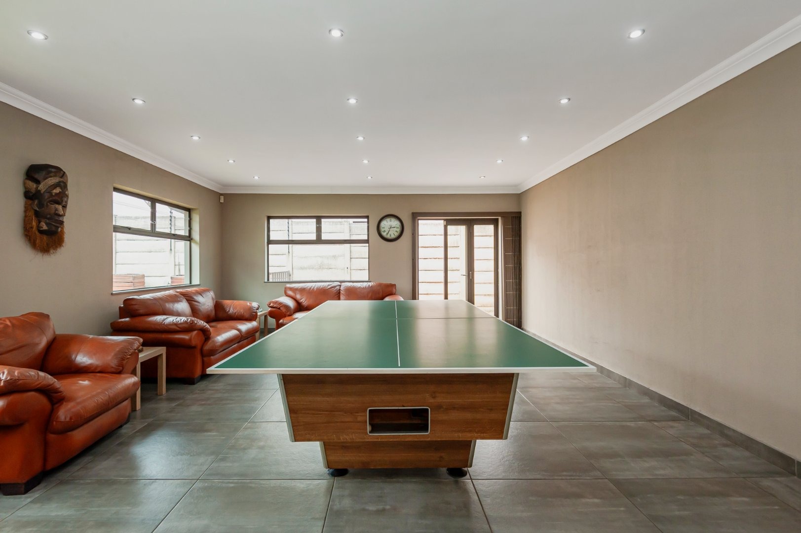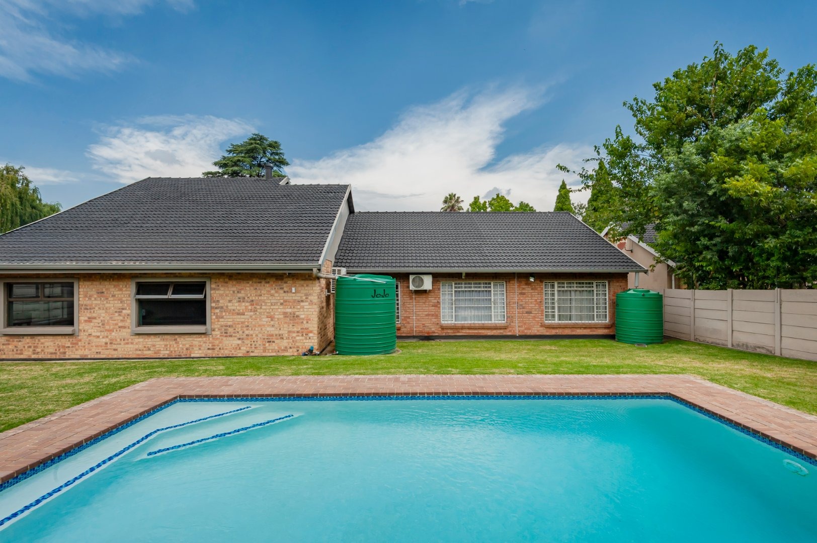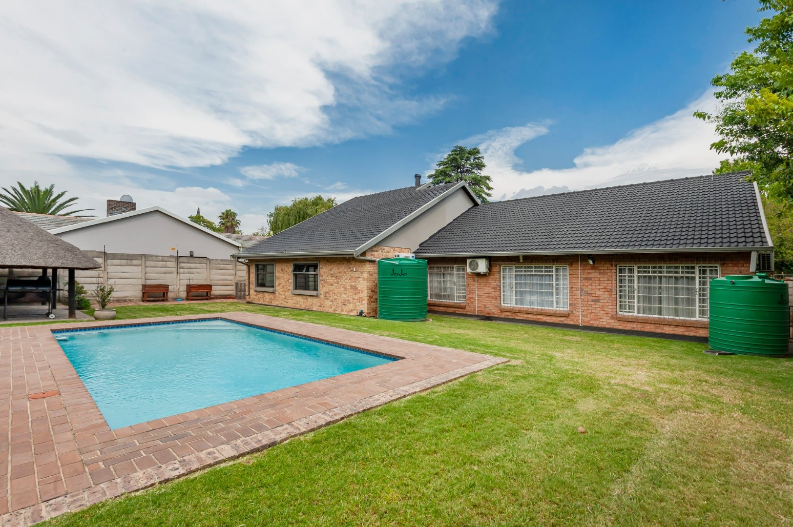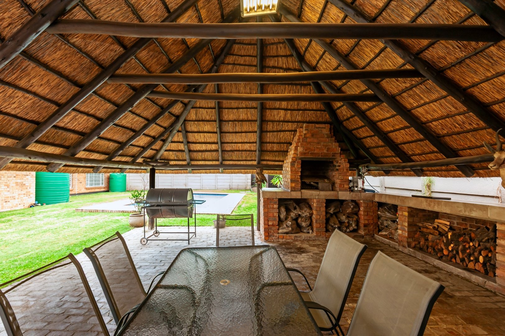 Designed with entertaining in mind, the property boasts a dedicated entertainment room with a built-in bar and space for a pool table. This flows effortlessly to the outdoor area, where a sparkling swimming pool, spacious lapa, and braai area create the ideal setting for social gatherings and family enjoyment.