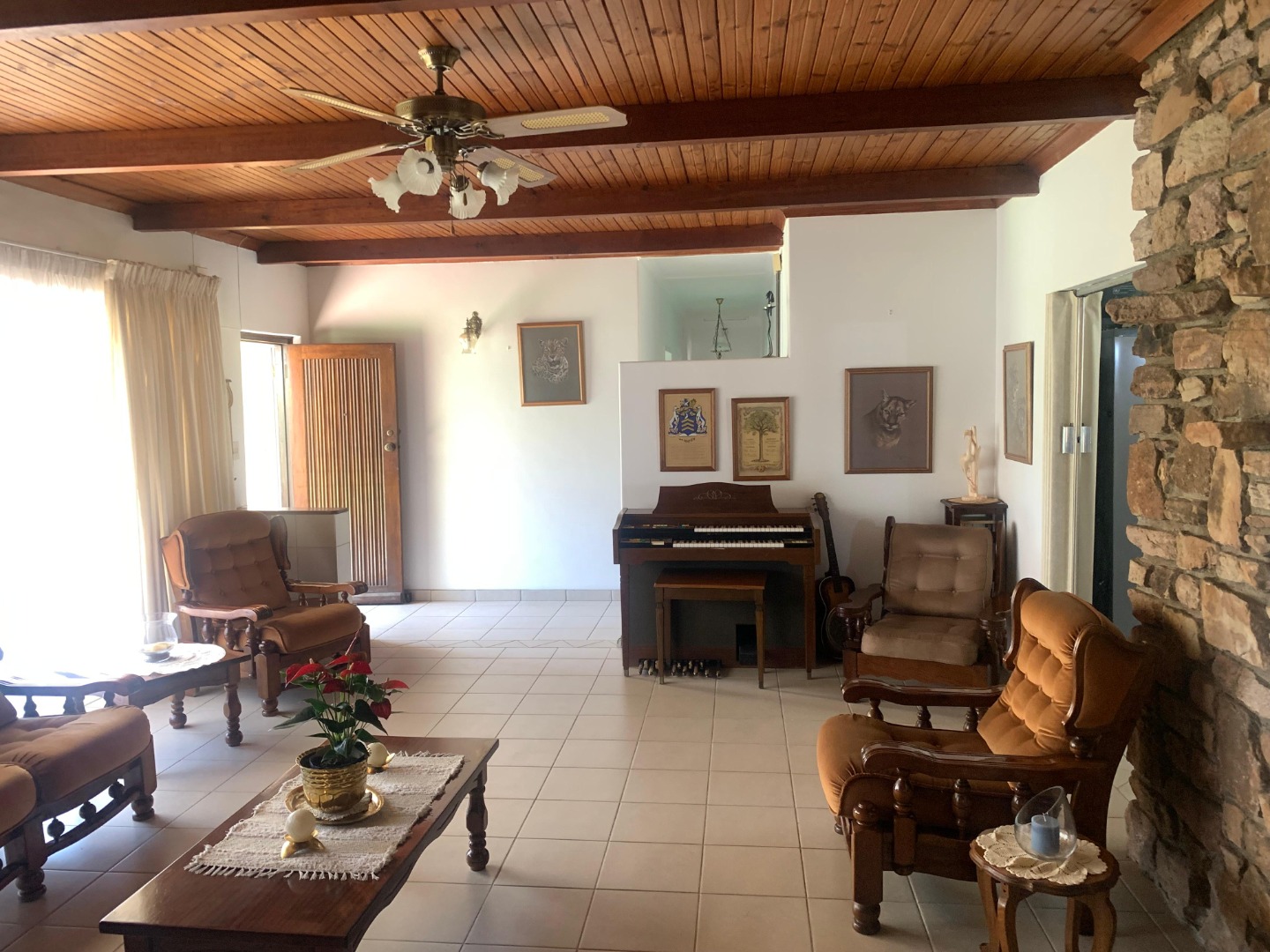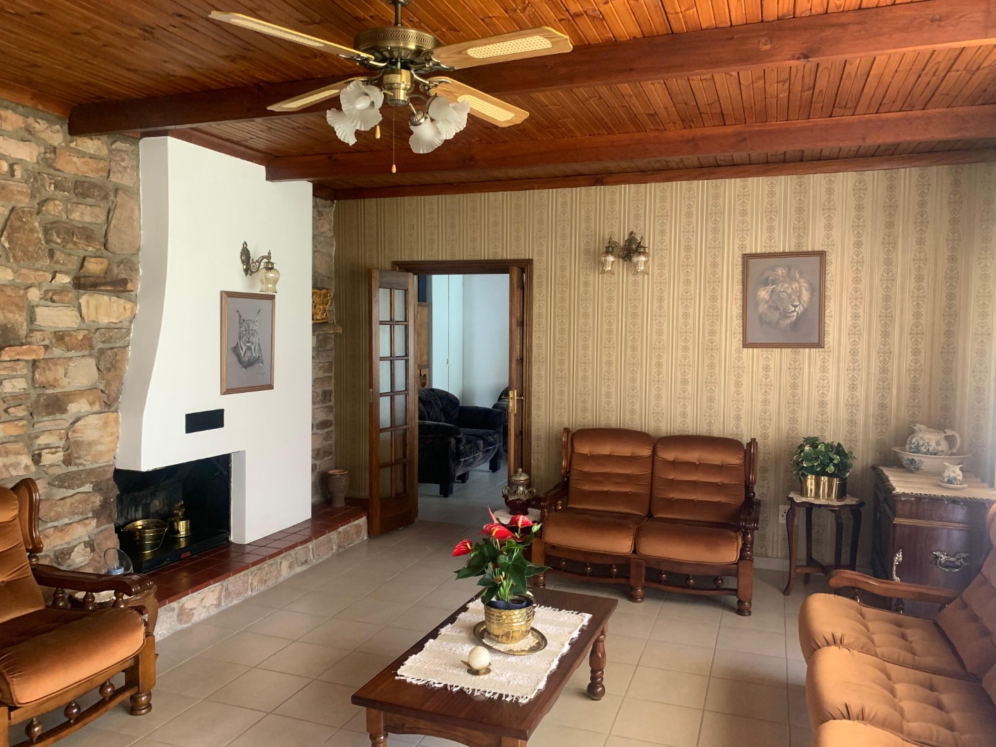 The main house features a welcoming entrance hall, a comfortable lounge with tiled flooring, a ceiling fan, and a fireplace. A dedicated dining room, also with a ceiling fan, complements the modern kitchen, which boasts granite countertops, a double basin, a 4-plate gas hob, an undercounter oven, and an extractor fan.