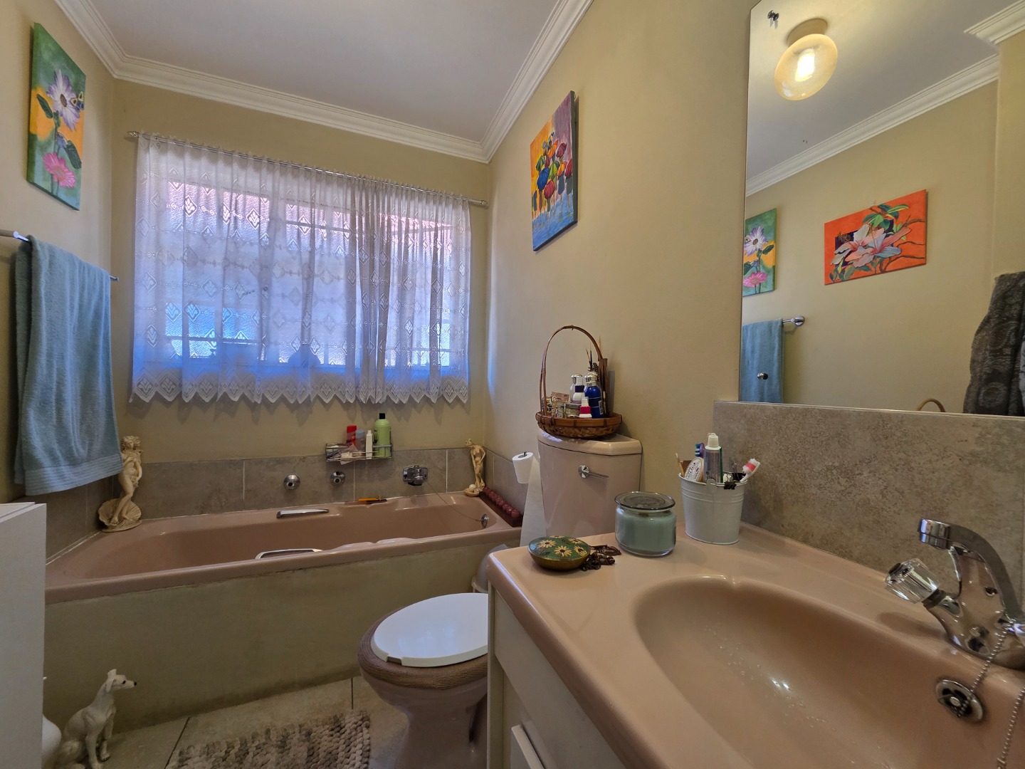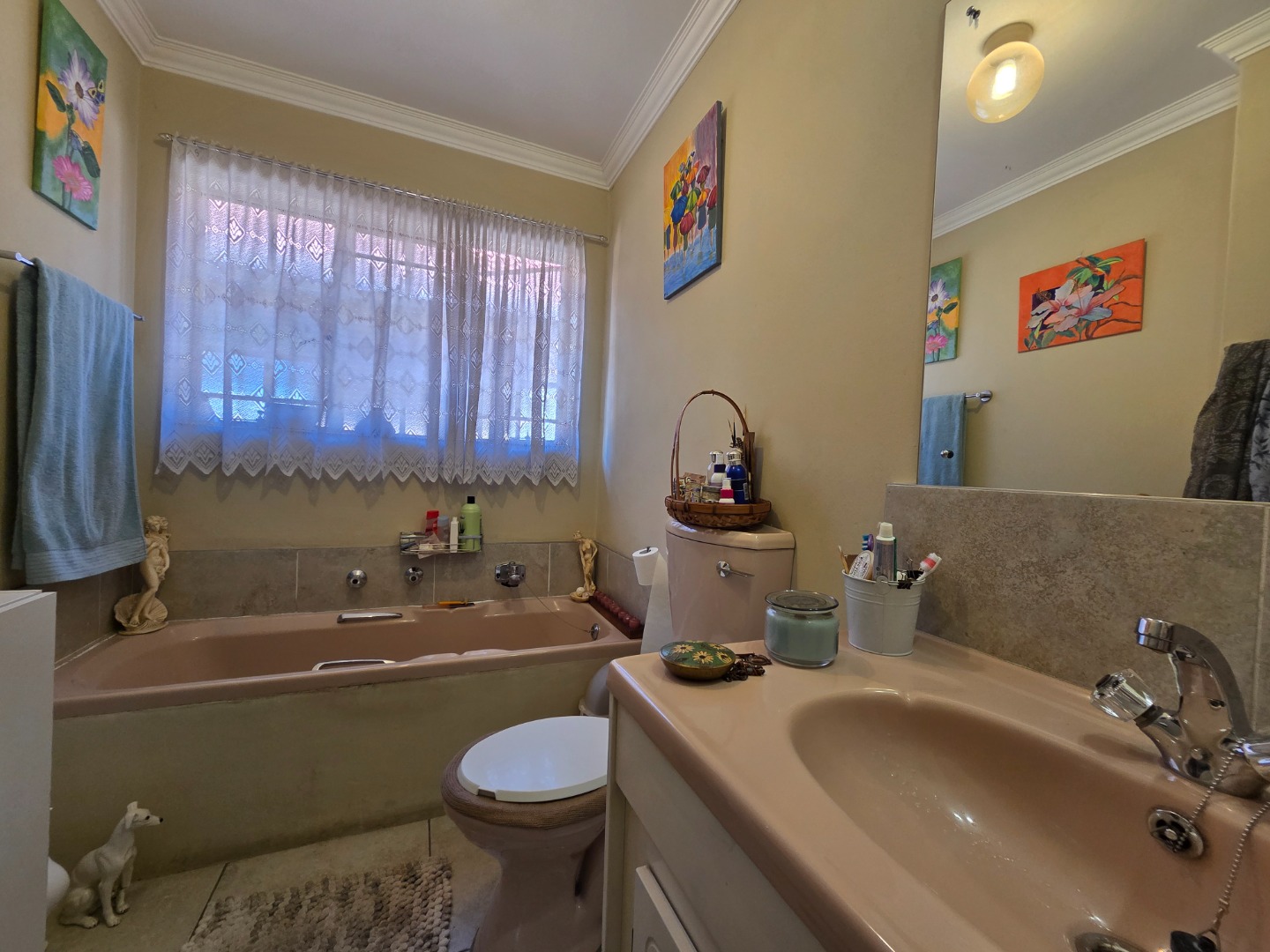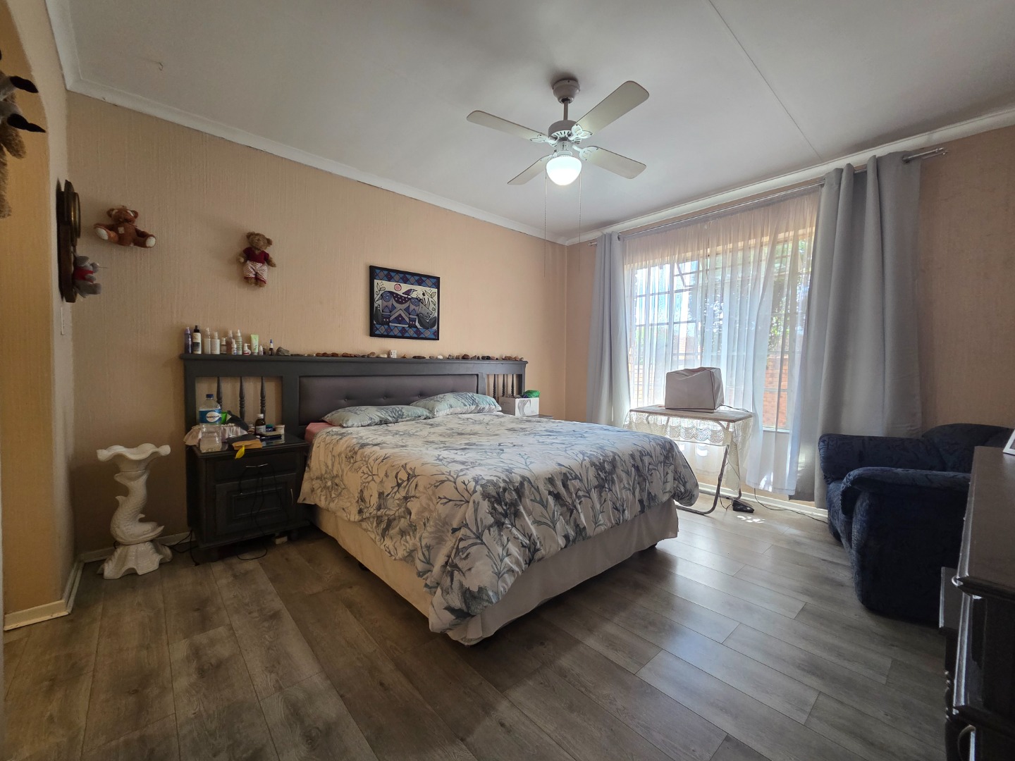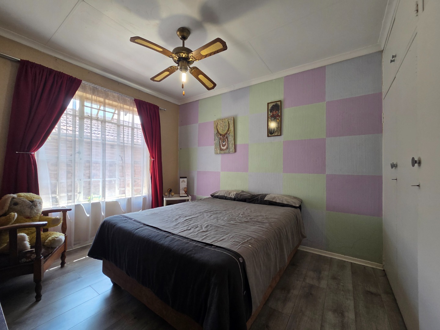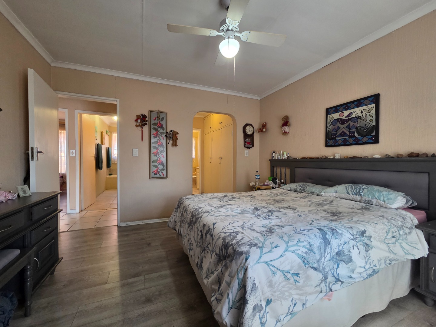 The home offers three spacious bedrooms, all fitted with built-in cupboards, and two bathrooms. The main bathroom is a full bathroom, while the second features a bath, wash basin, and toilet, perfect for family living.