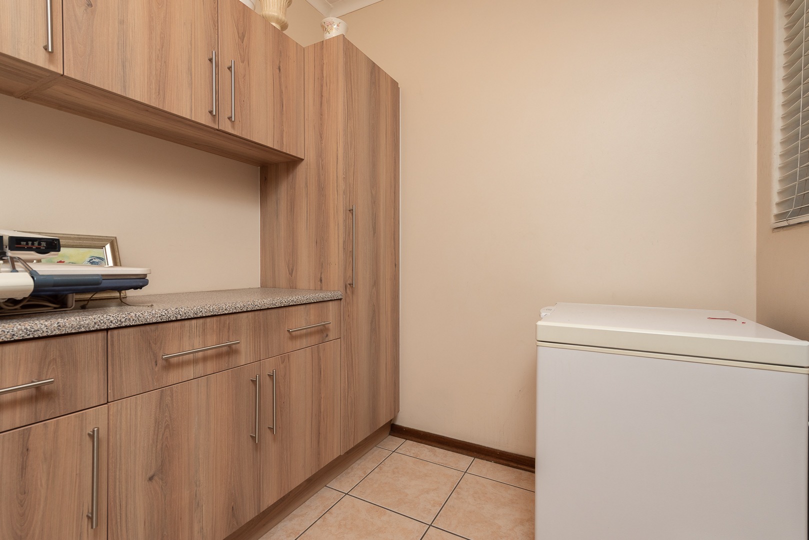 The modern laundry is inside the house, and can be used as a fifth bedroom/study. It is fitted with modern wood look draws, cupboards and tops as well as window blinds.