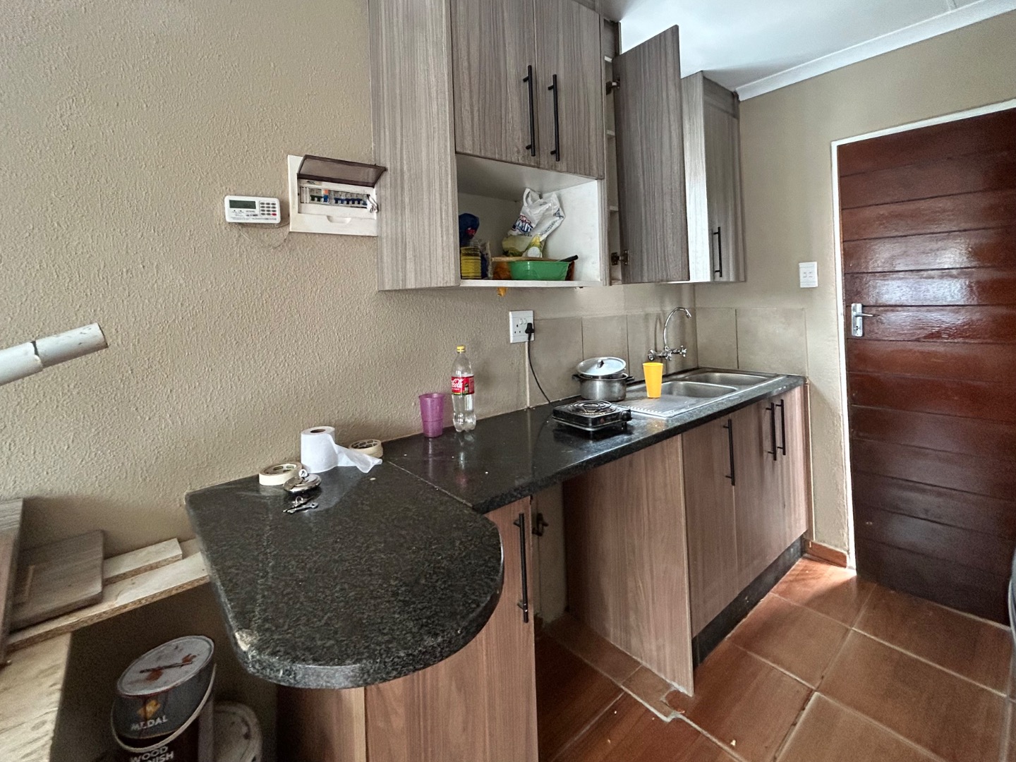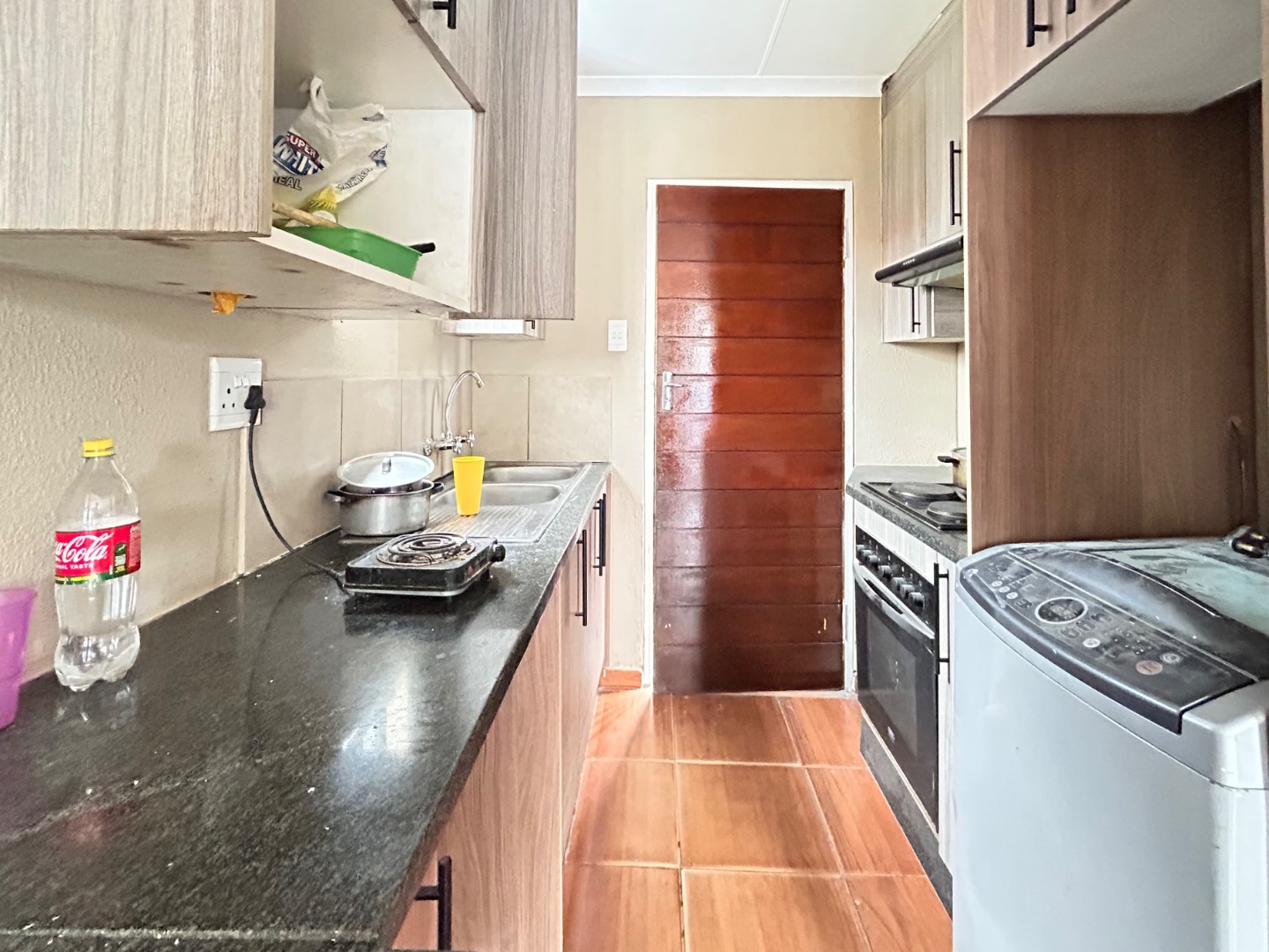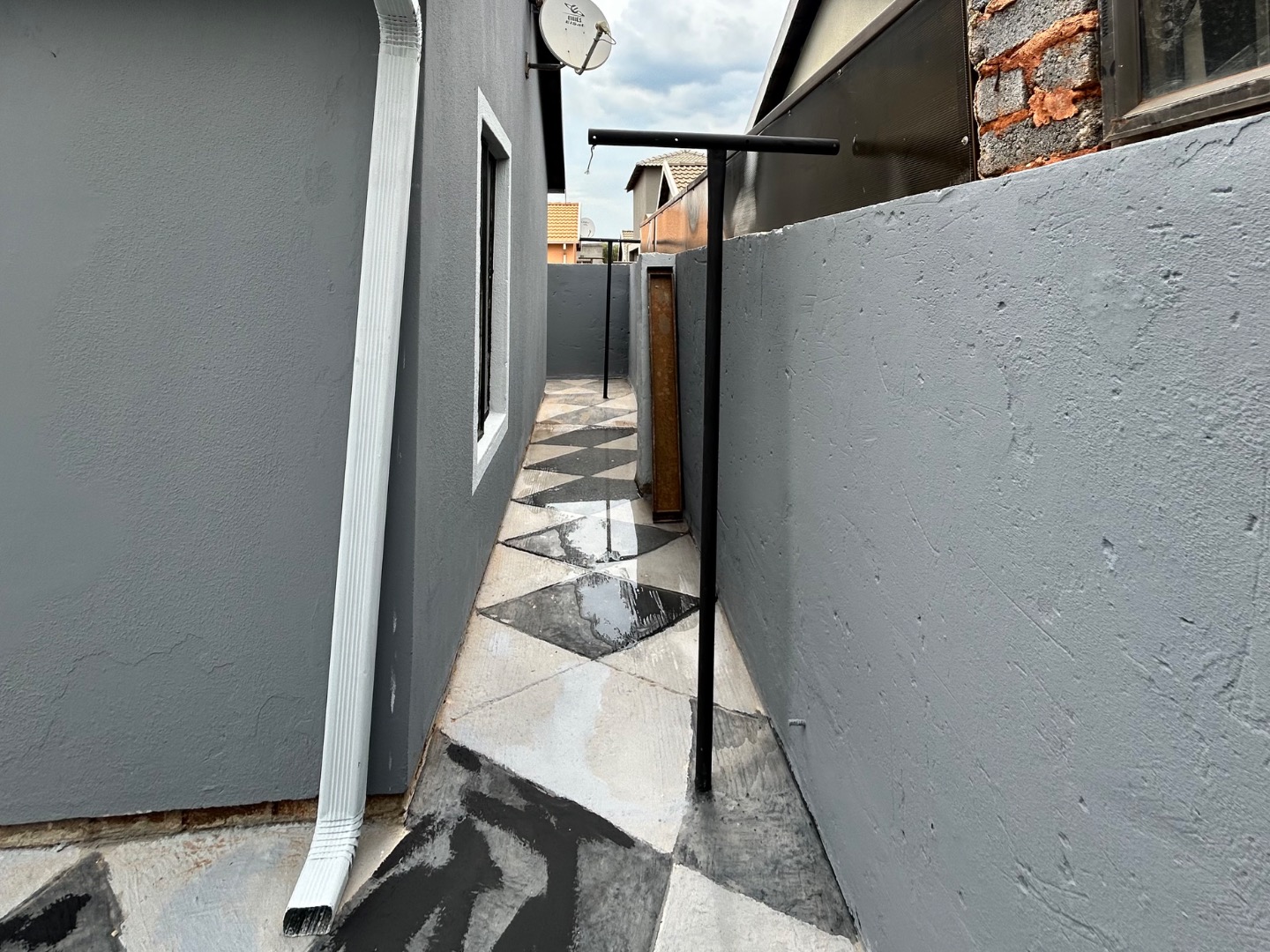 Situated on a 150 sqm erf, the property provides two dedicated parking spaces. The unique paved outdoor area is ideal for relaxation, complemented by a small garden patch. Security is a priority, with burglar bars on windows, a fully fenced perimeter, and an access gate. Solar lights on the roof offer a touch of energy efficiency.