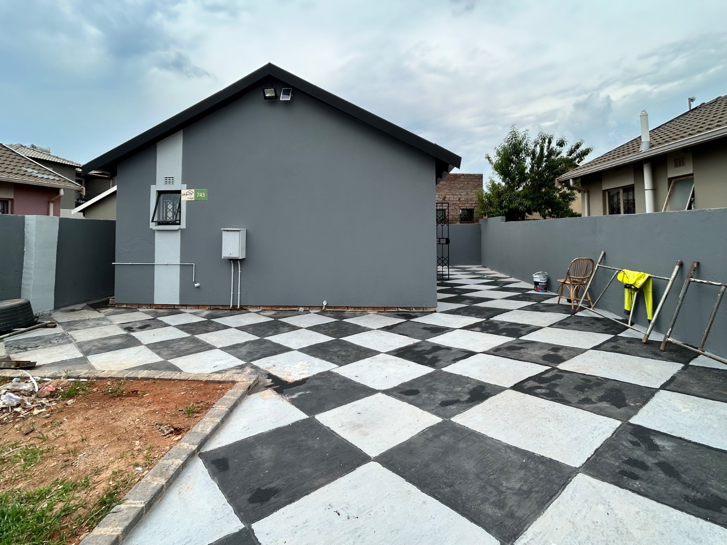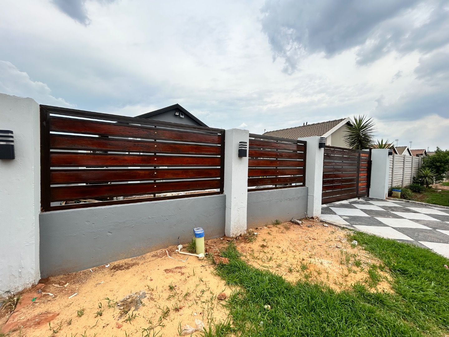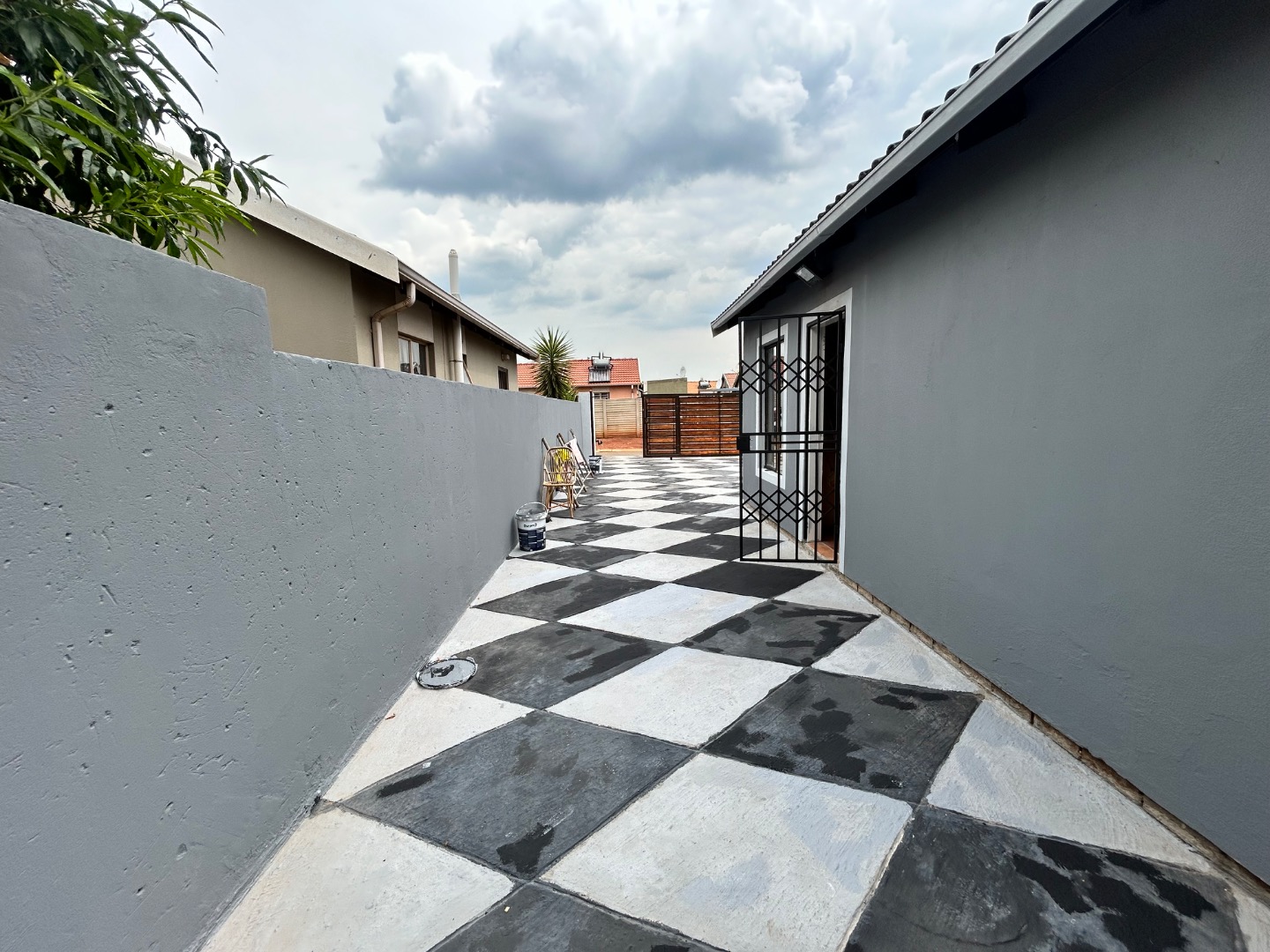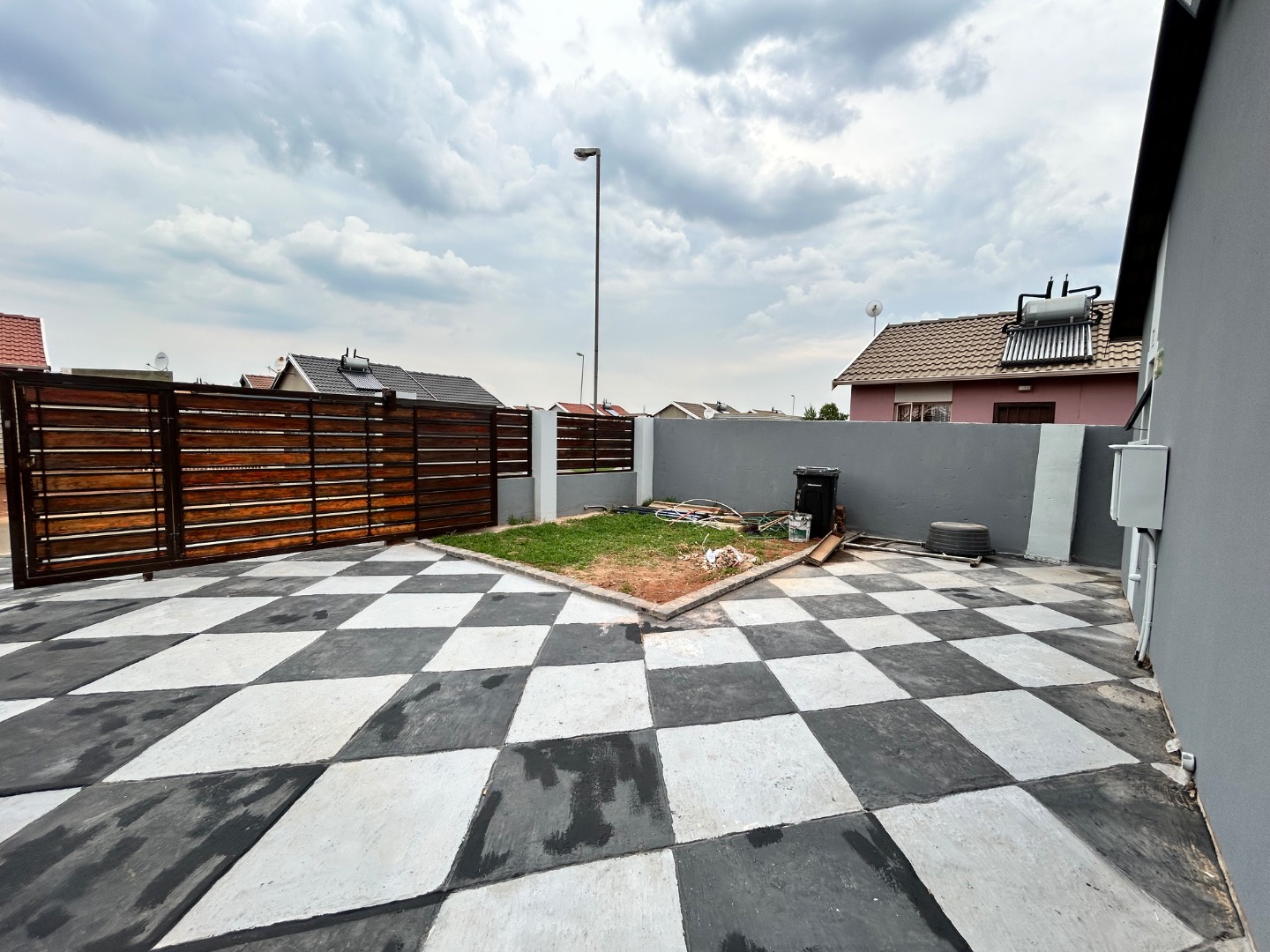 This modern 2-bedroom, 1-bathroom home in Sky City, Alberton, offers contemporary living. The property features a stylish grey and white exterior with a distinctive black and white checkered paved yard, ensuring low maintenance. A fully walled perimeter and gated side access enhance privacy and security, creating a welcoming first impression.