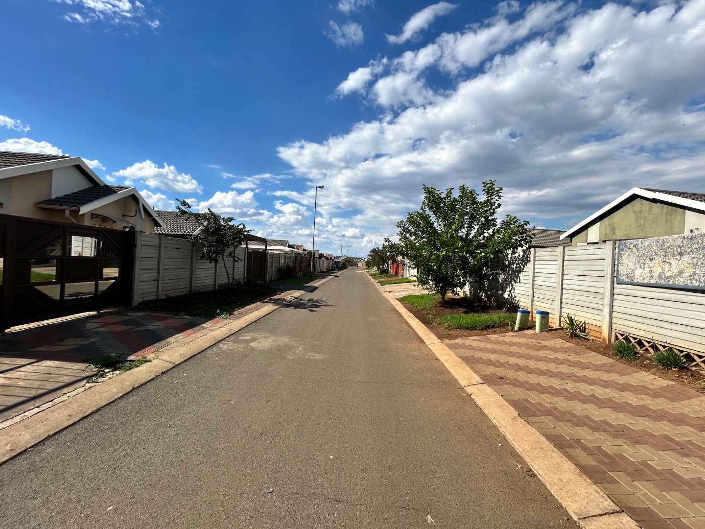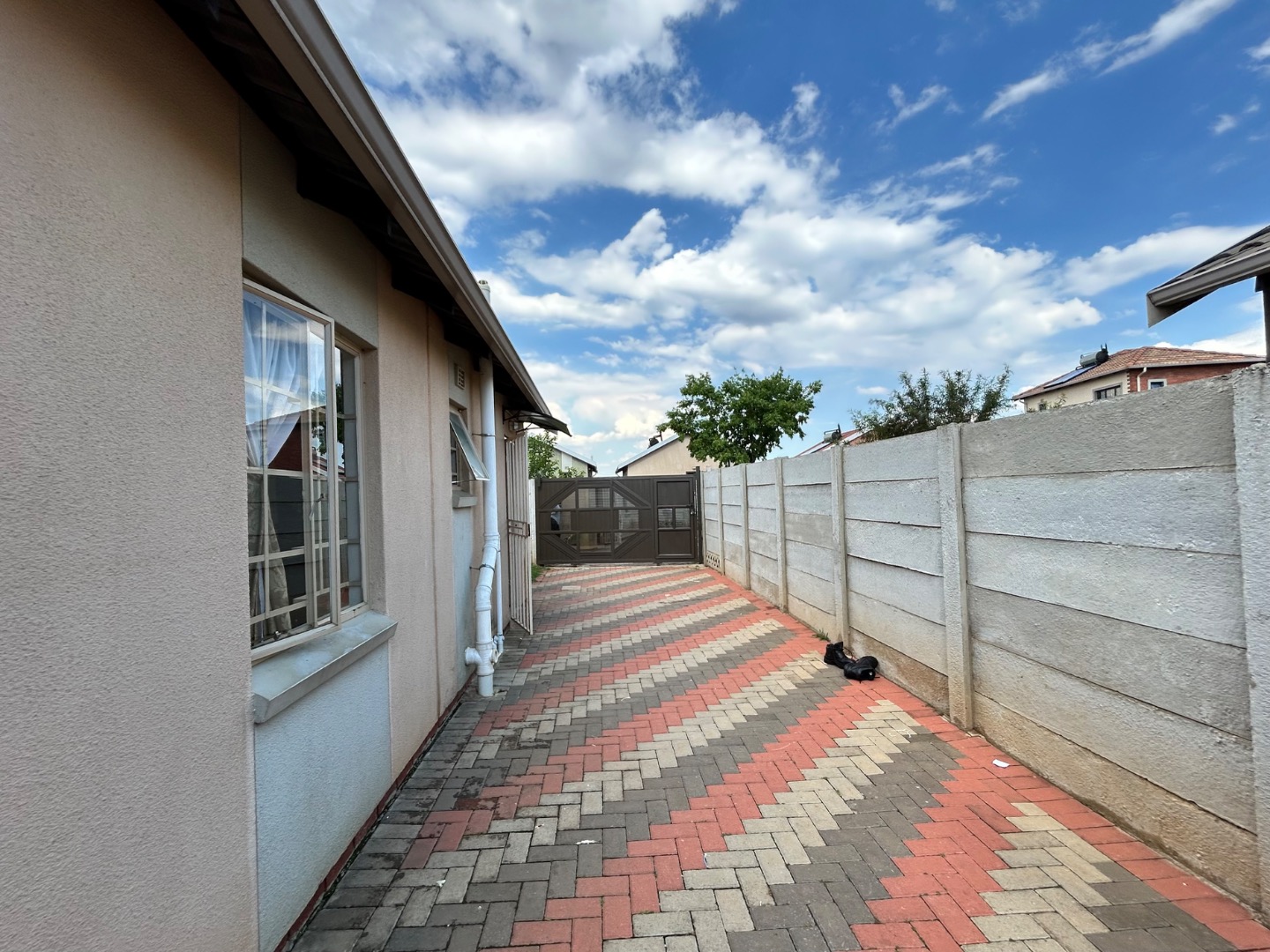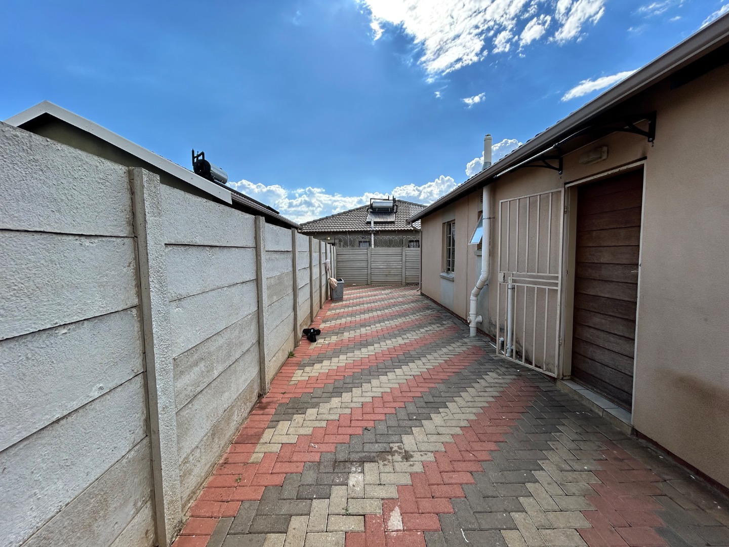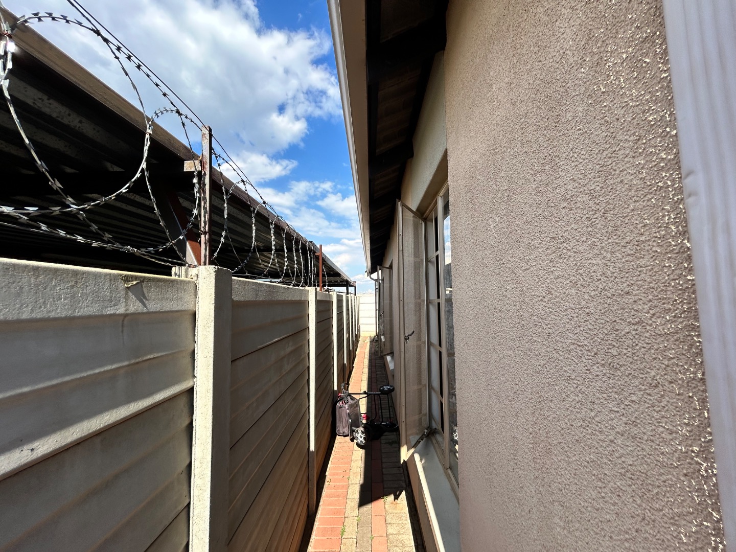 This inviting 3-bedroom, 2-bathroom residential property in the suburban heart of Sky City, Alberton, offers a practical and secure living environment. From the moment you arrive, the property presents a well-defined kerb appeal with sturdy precast concrete fencing and a functional access gate, ensuring privacy and security. The neatly paved front walkway and driveway, featuring attractive red and grey pavers, lead to the entrance, while the surrounding garden area, though currently undeveloped, offers a blank canvas for future landscaping and personal touches. The house exterior appears well-maintained, providing a solid first impression.